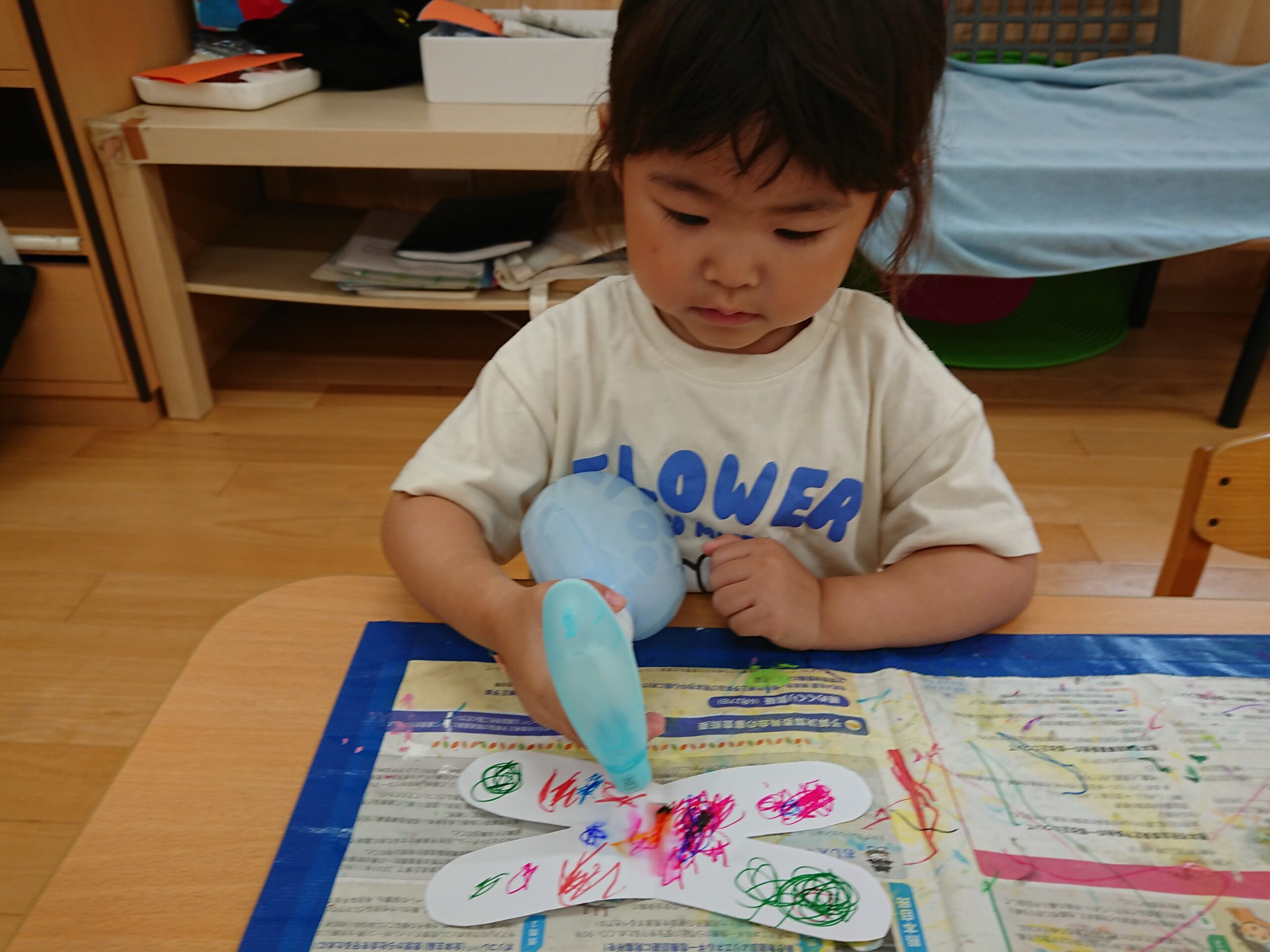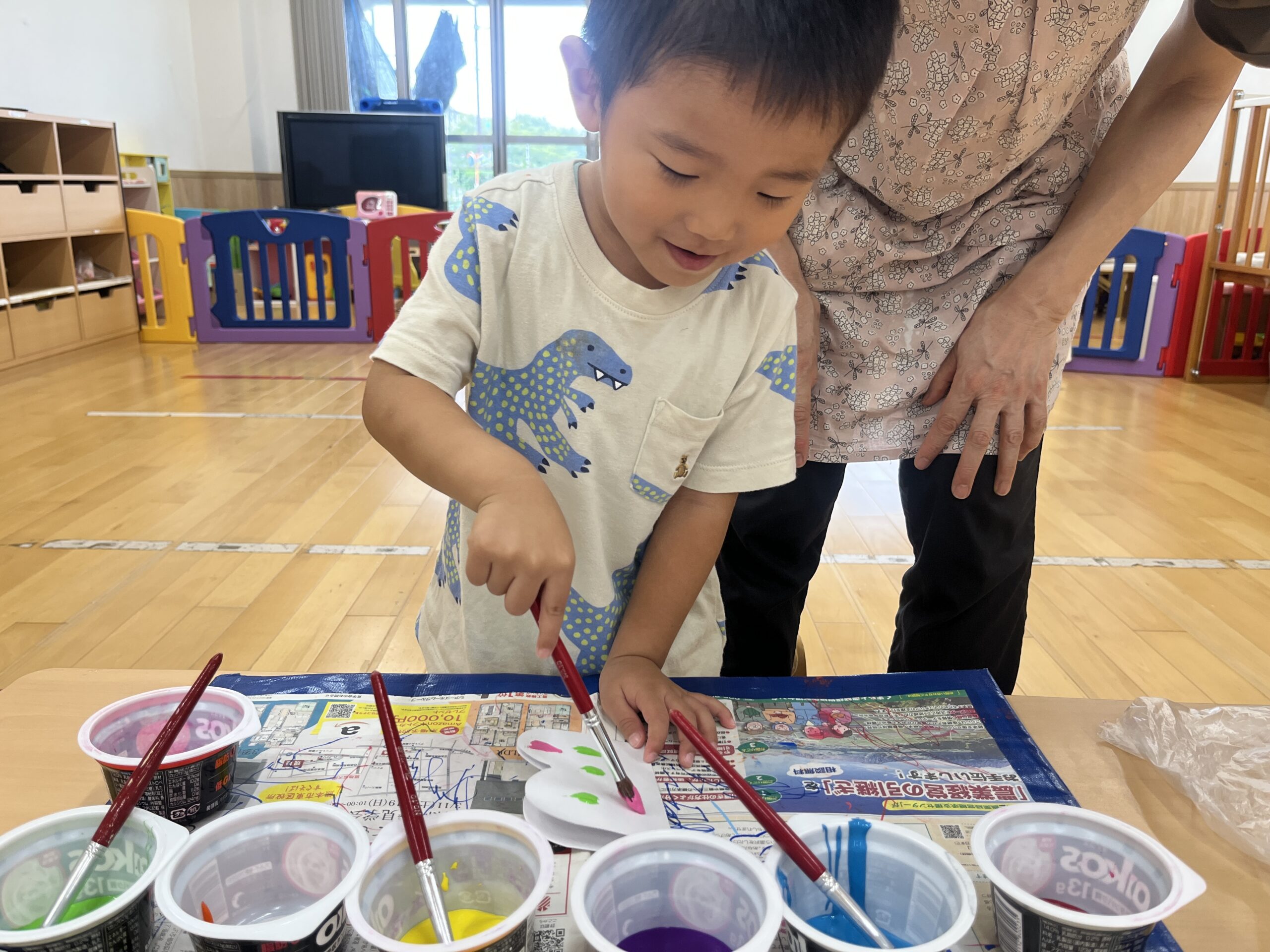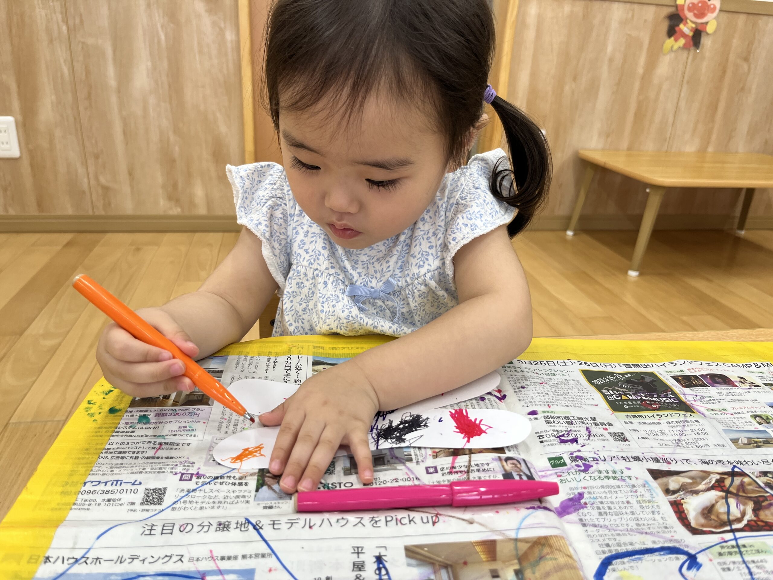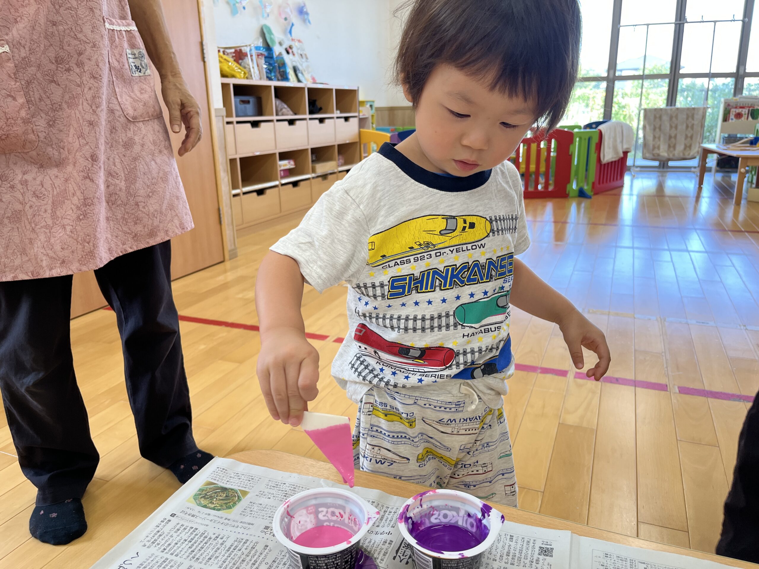 みんなでコスモスやトンボを作りましょう。まず、障子紙を絵具に浸してコスモスを作ります。