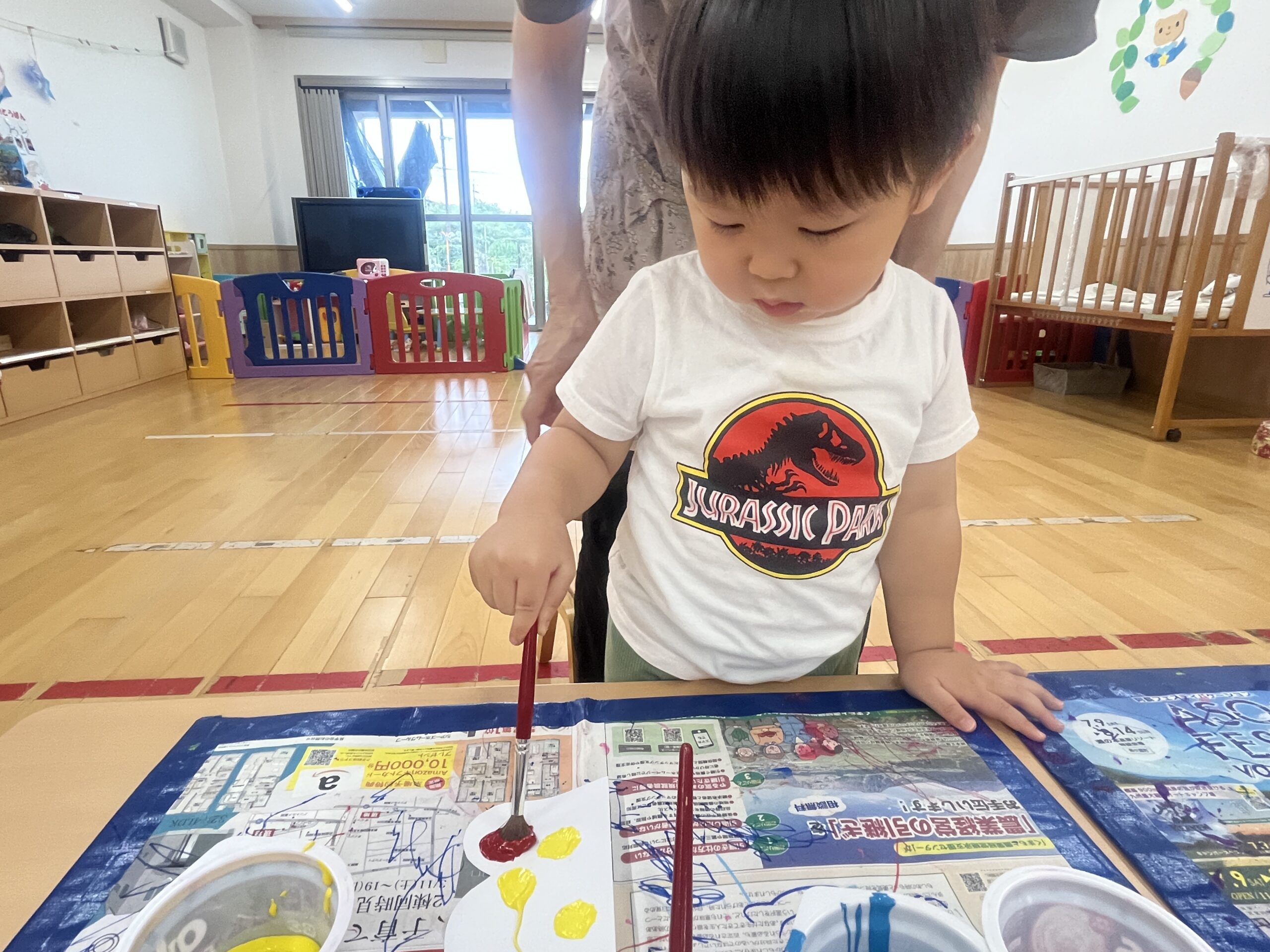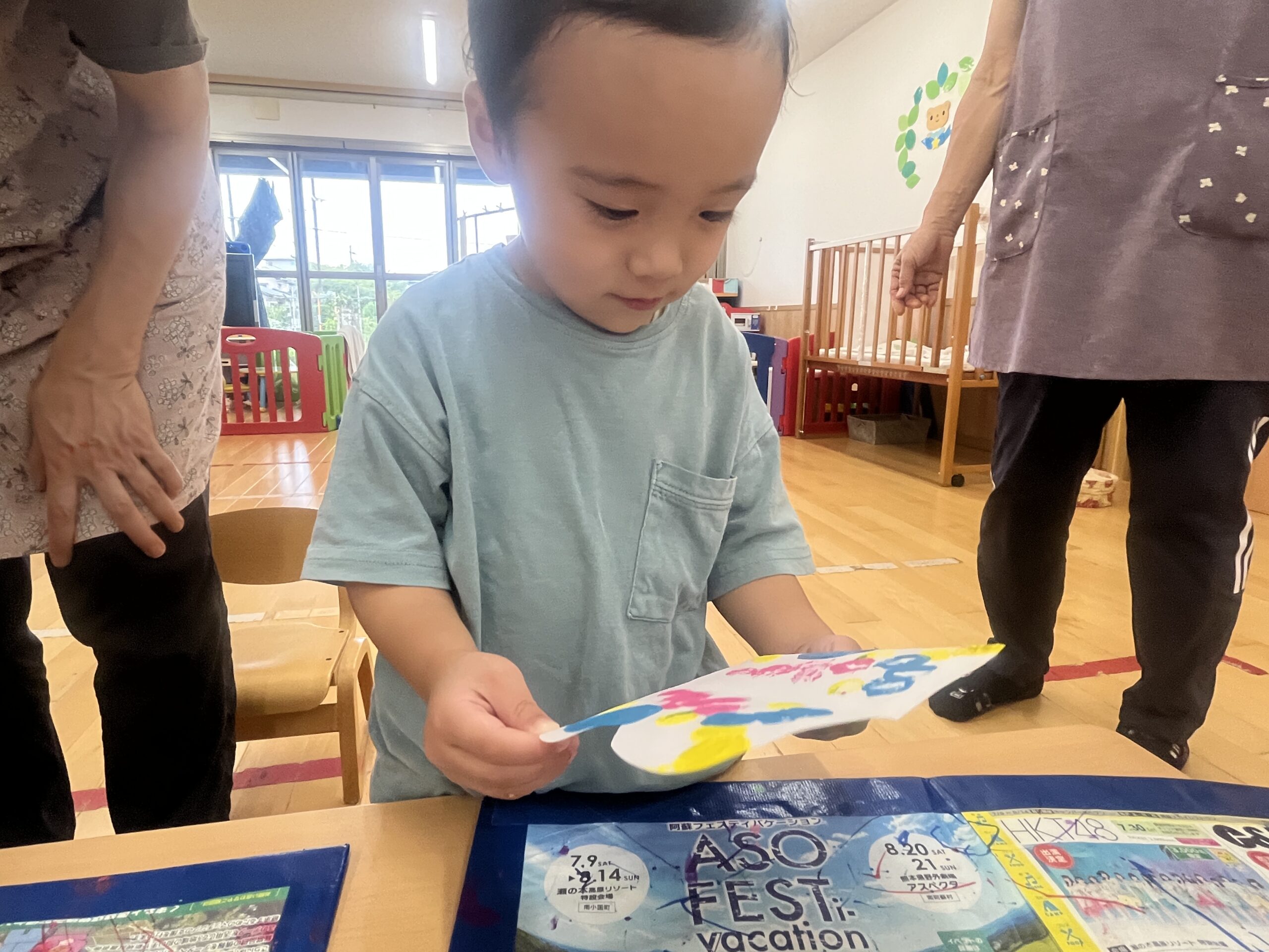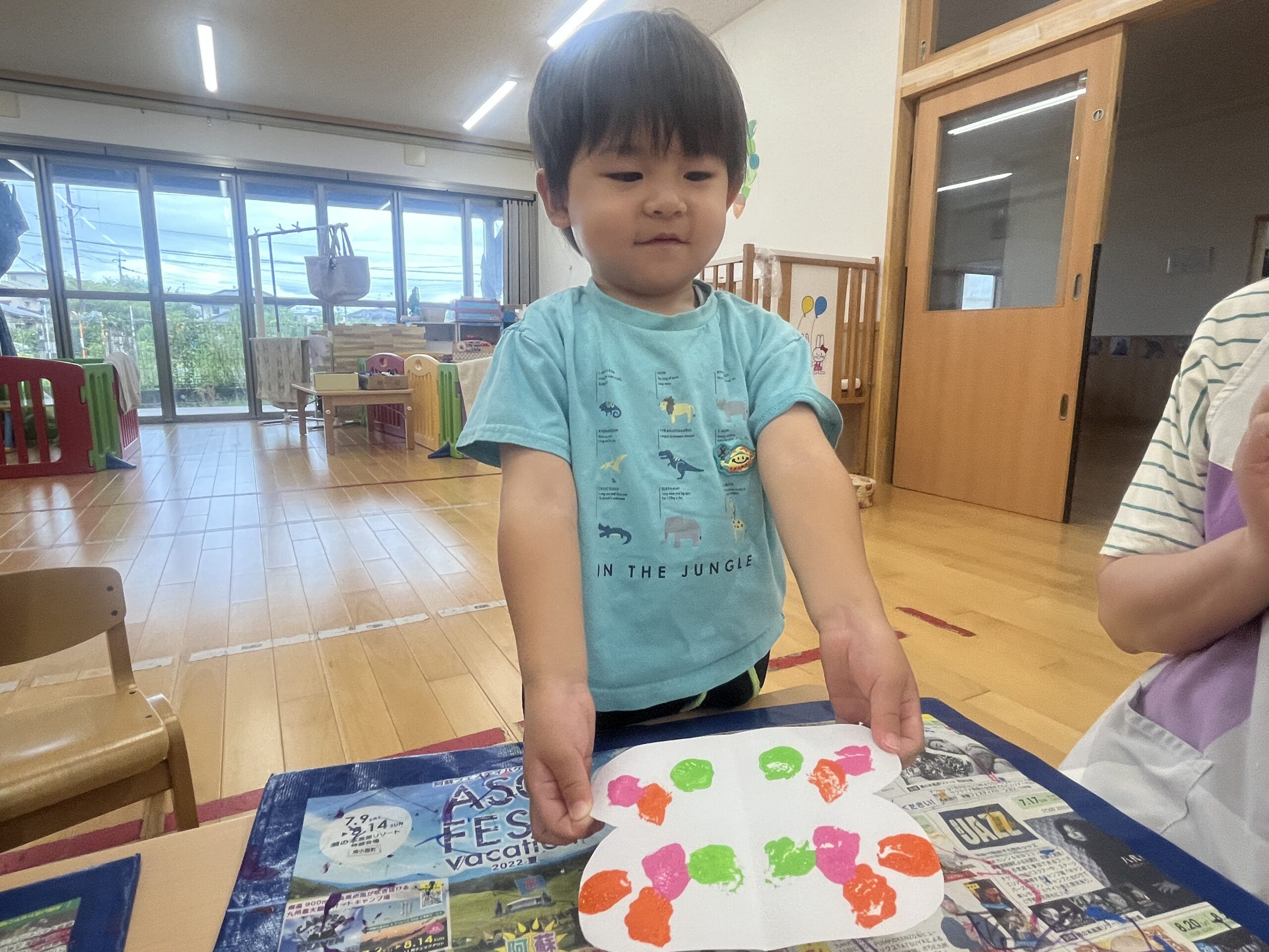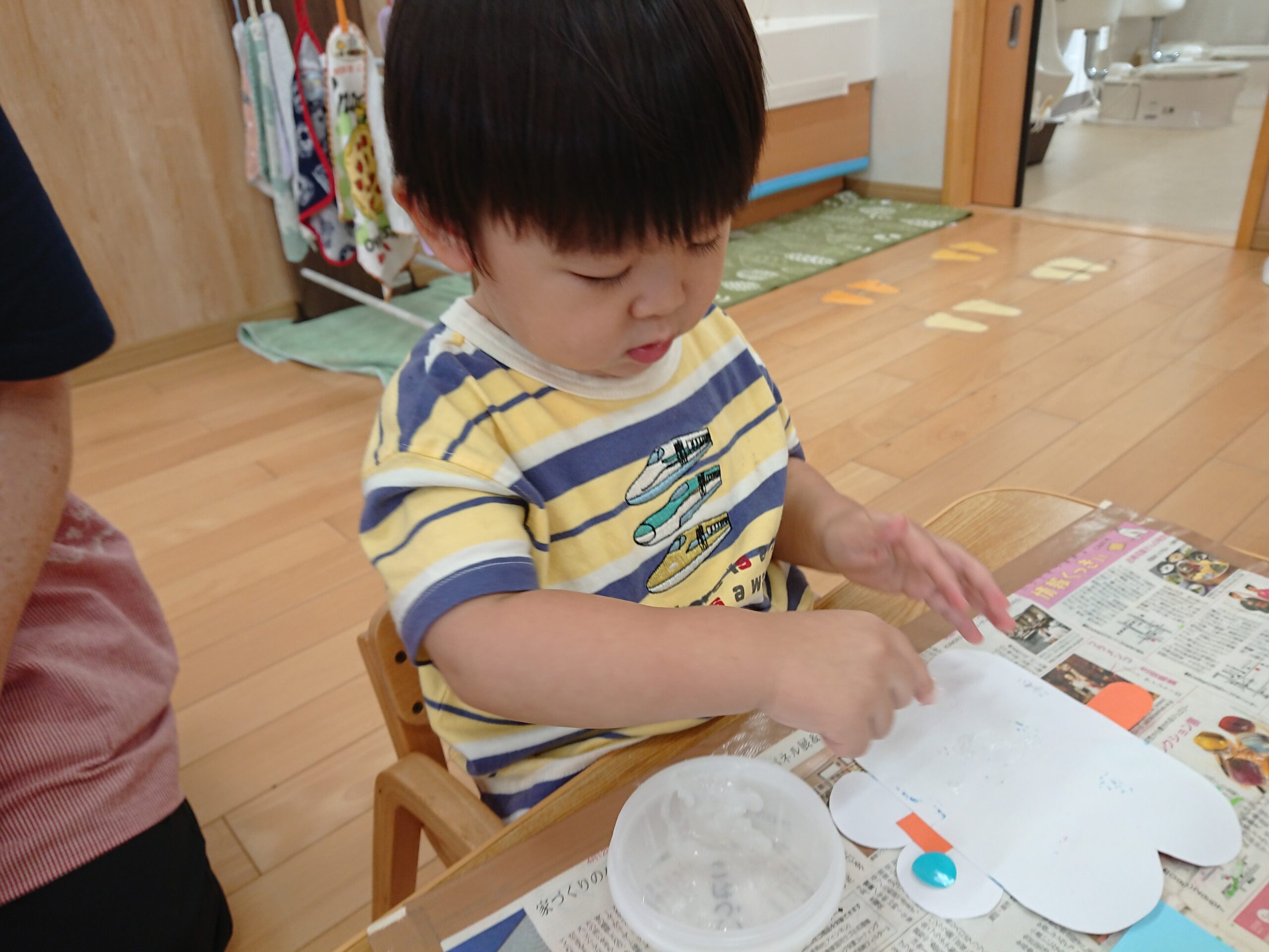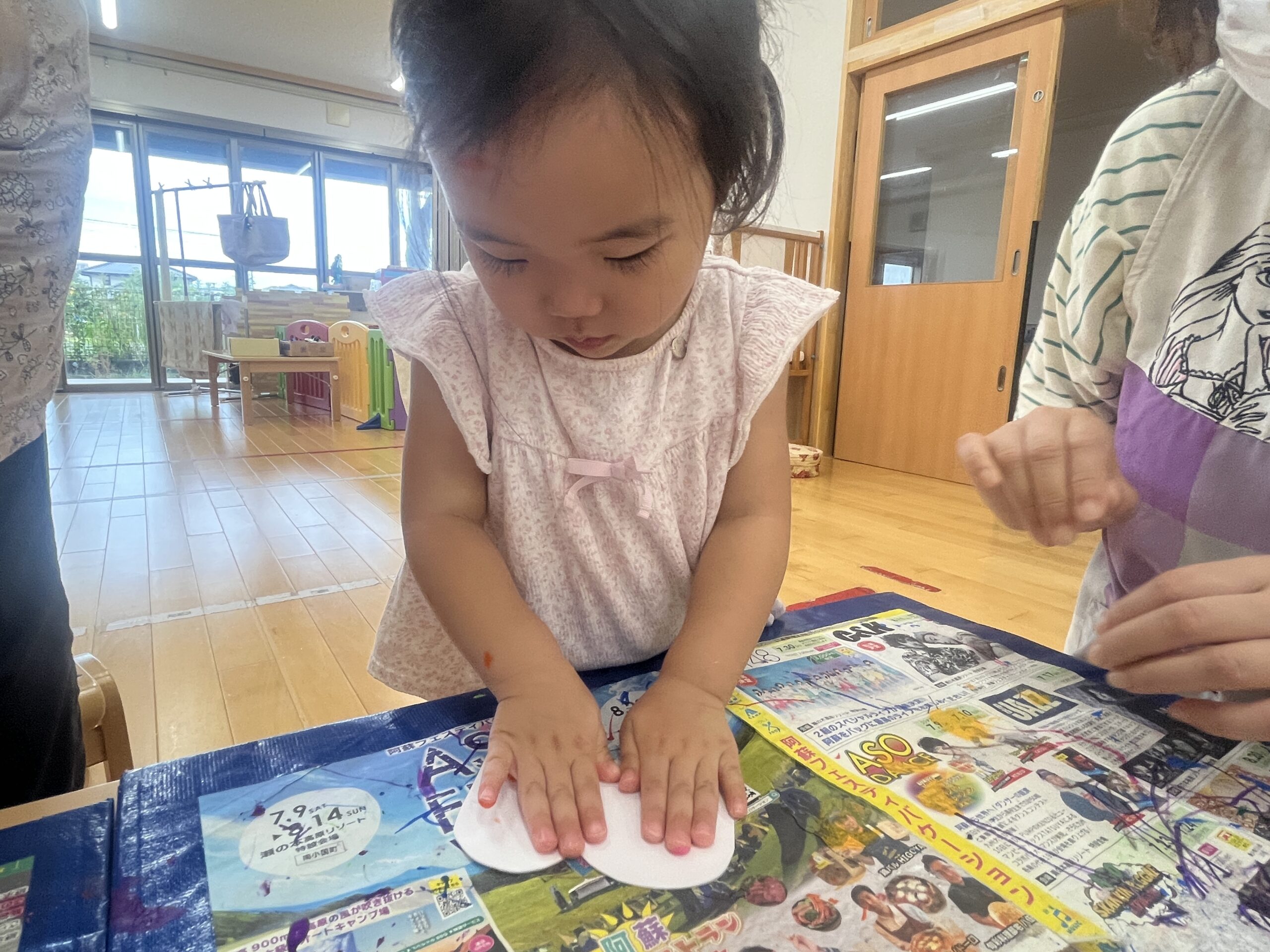 みんなでコスモスやトンボを作りましょう。まず、障子紙を絵具に浸してコスモスを作ります。