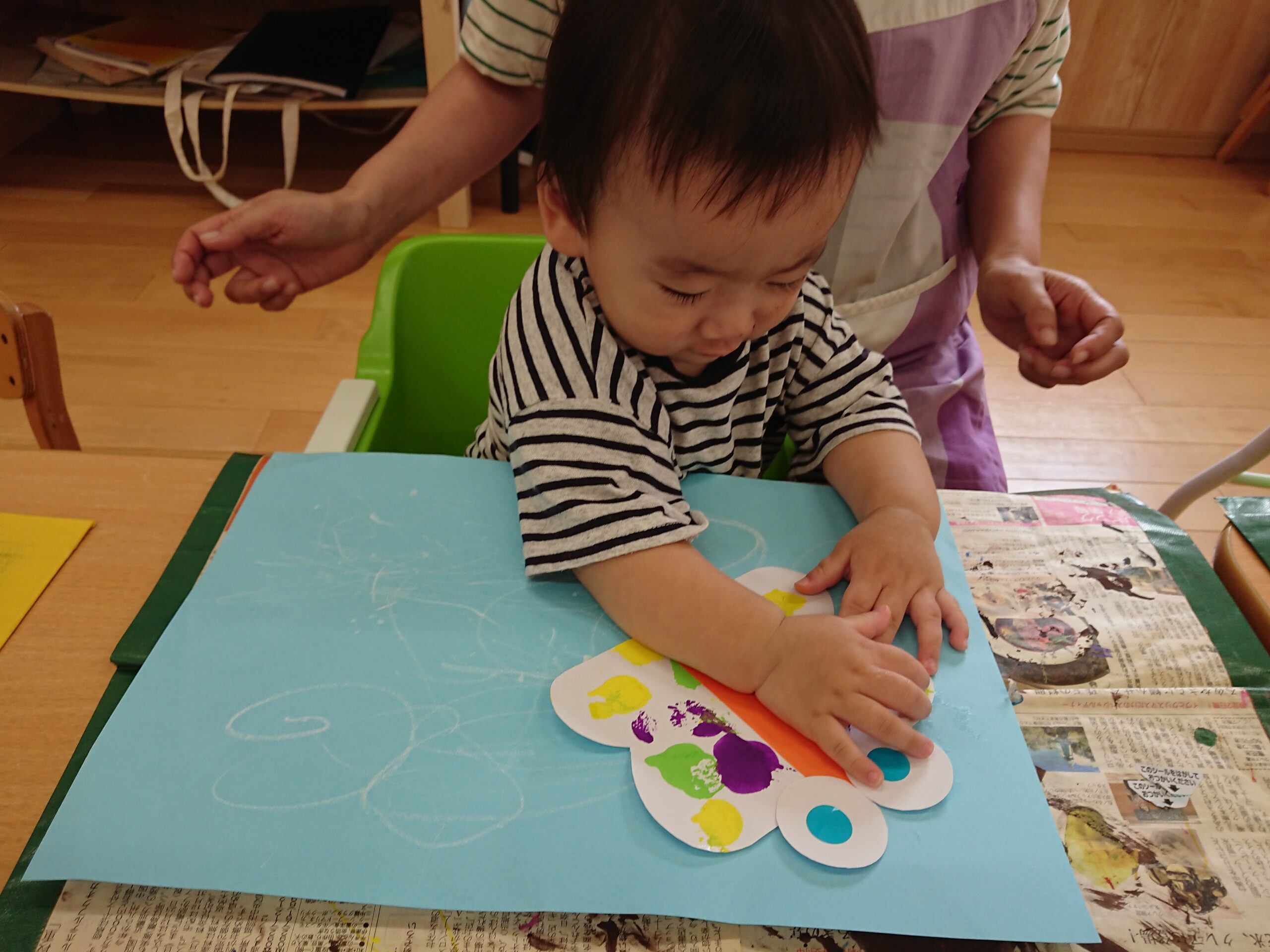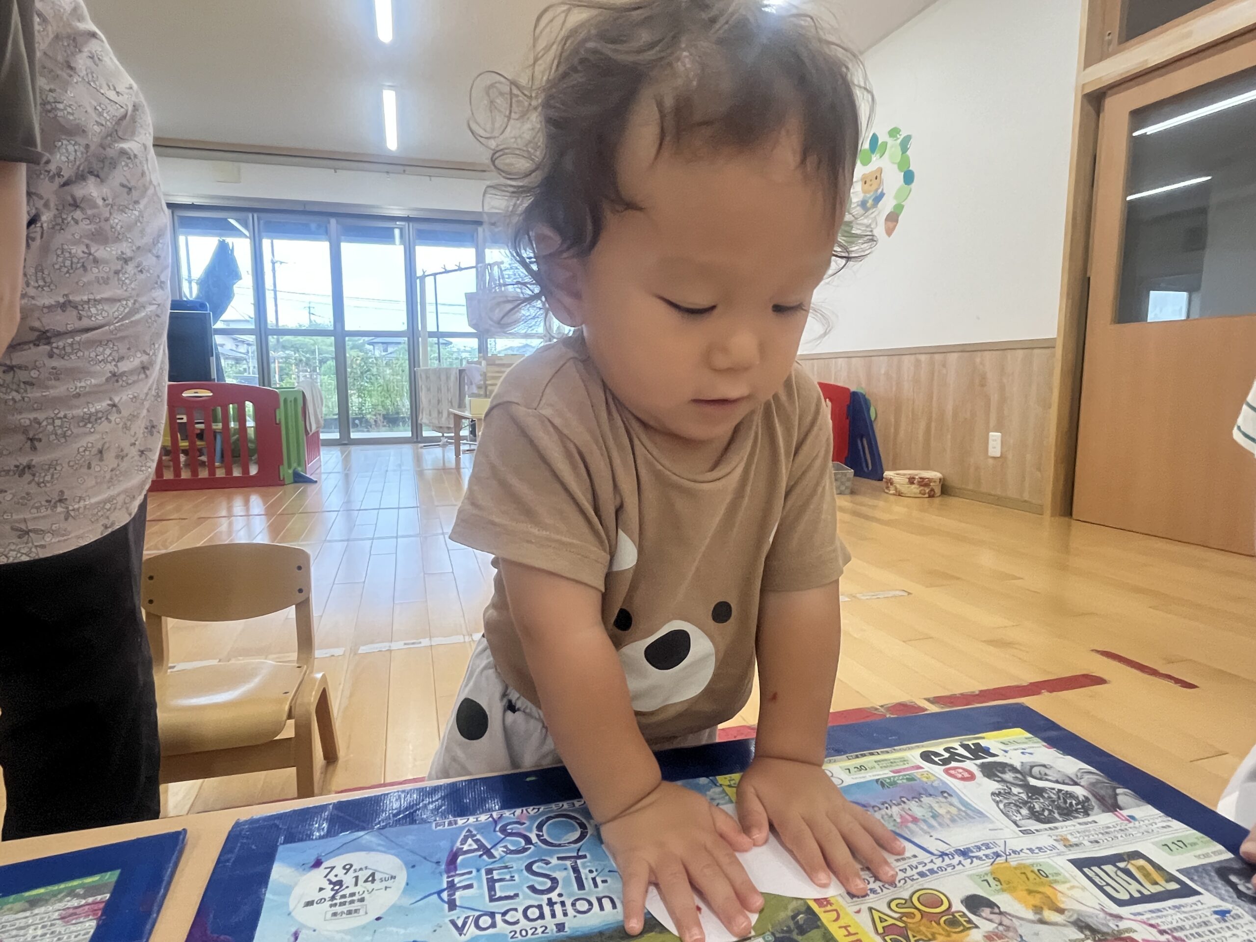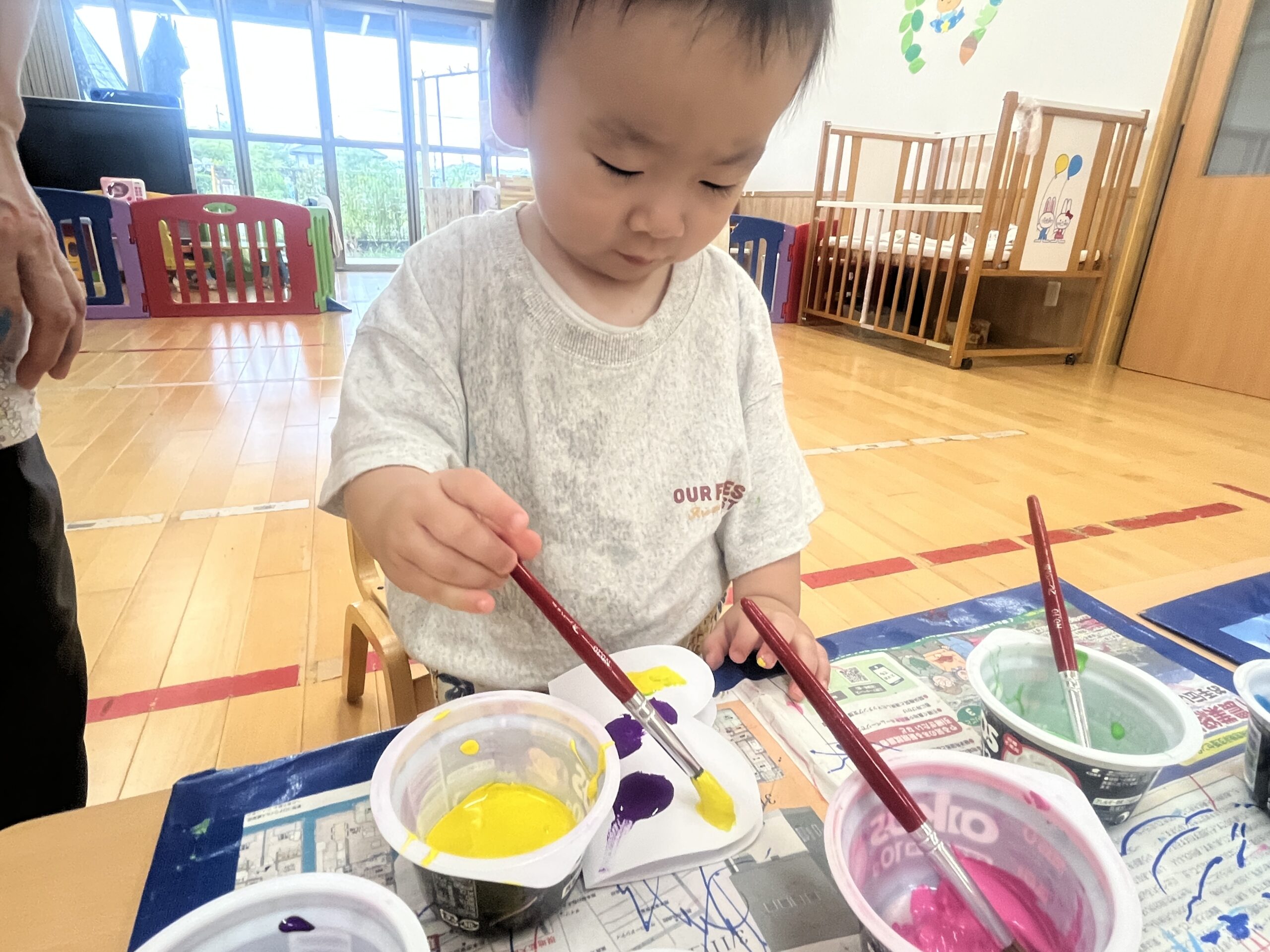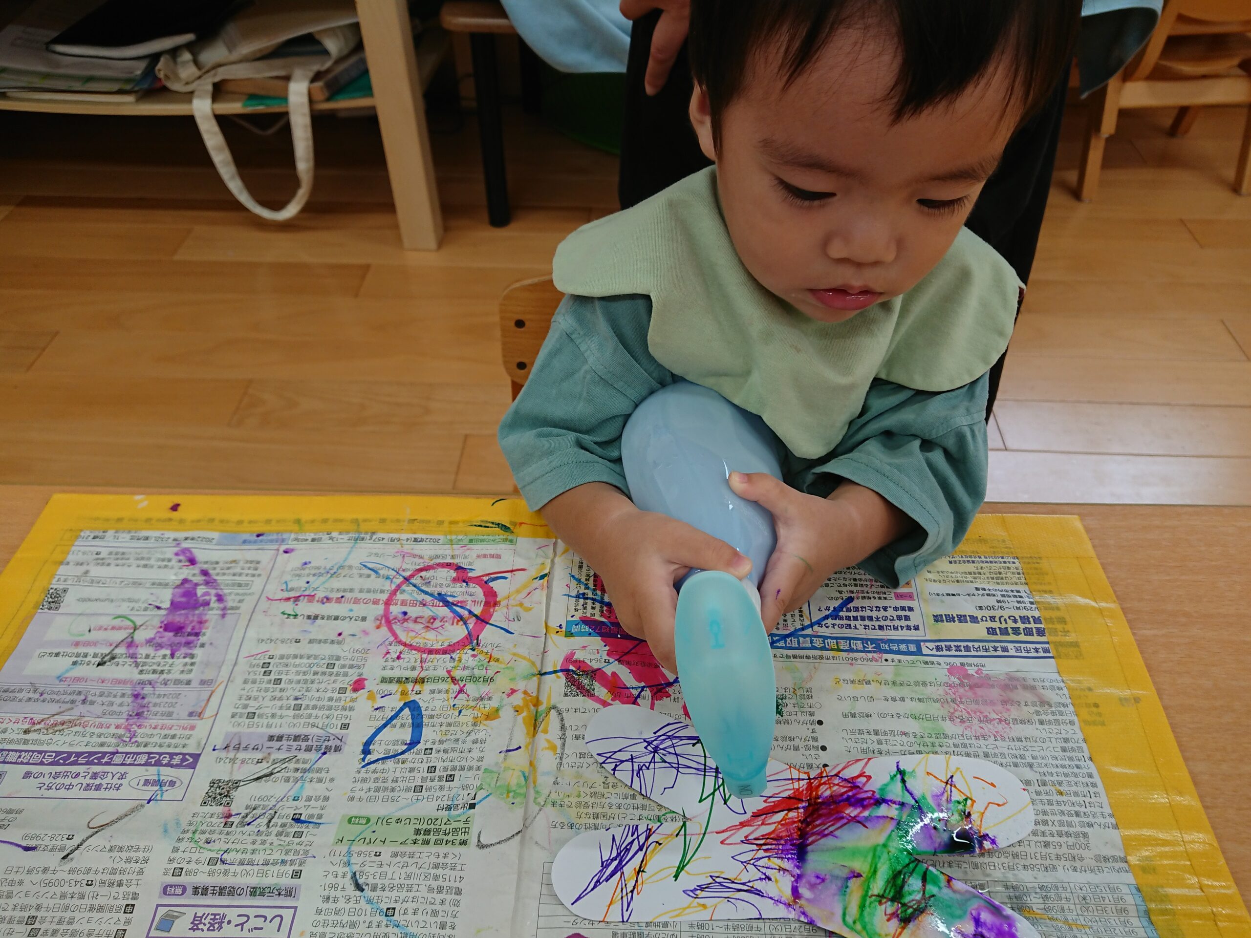 みんなでコスモスやトンボを作りましょう。まず、障子紙を絵具に浸してコスモスを作ります。