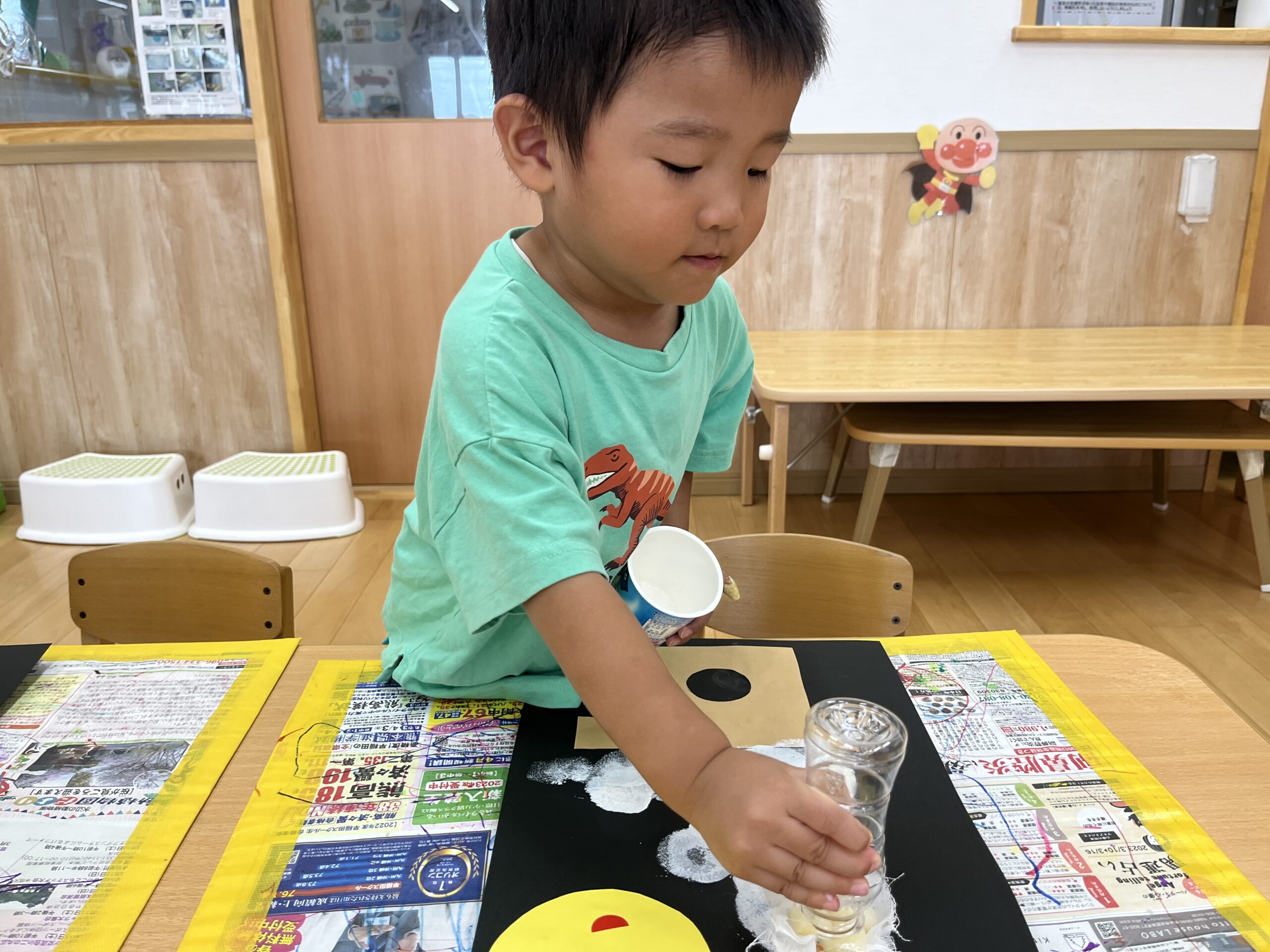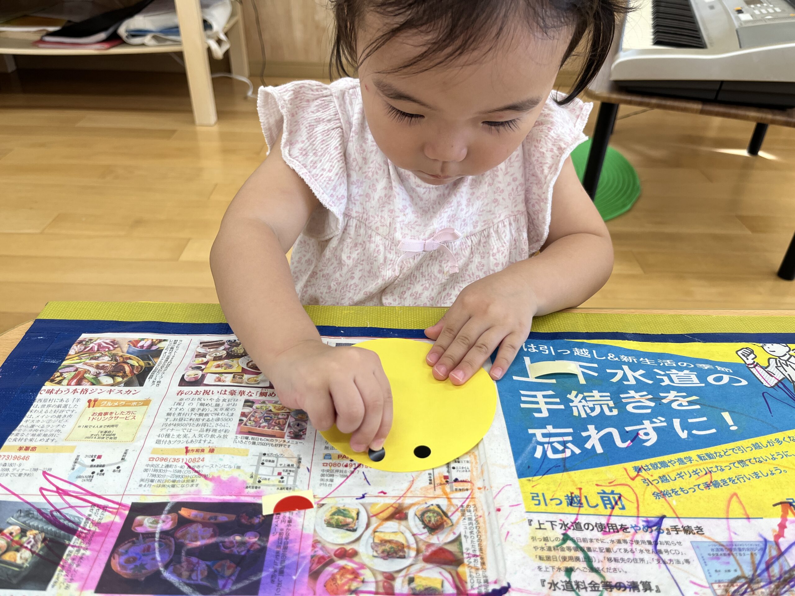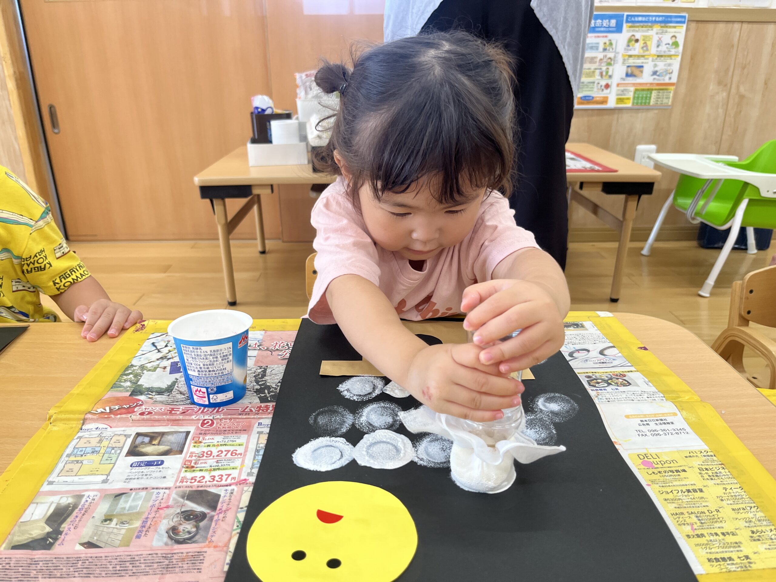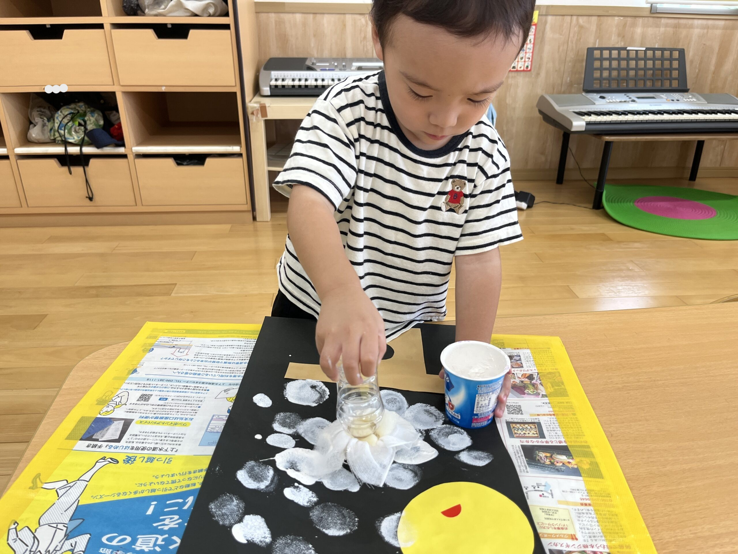 10月6日は中秋の名月です。みんなでお月見製作をしました。お月様にシールを貼って顔を作ります🌝
