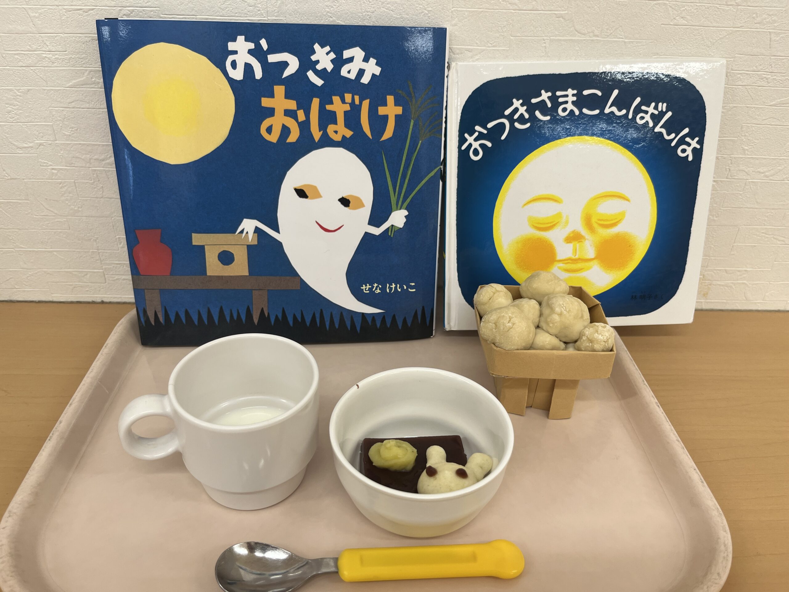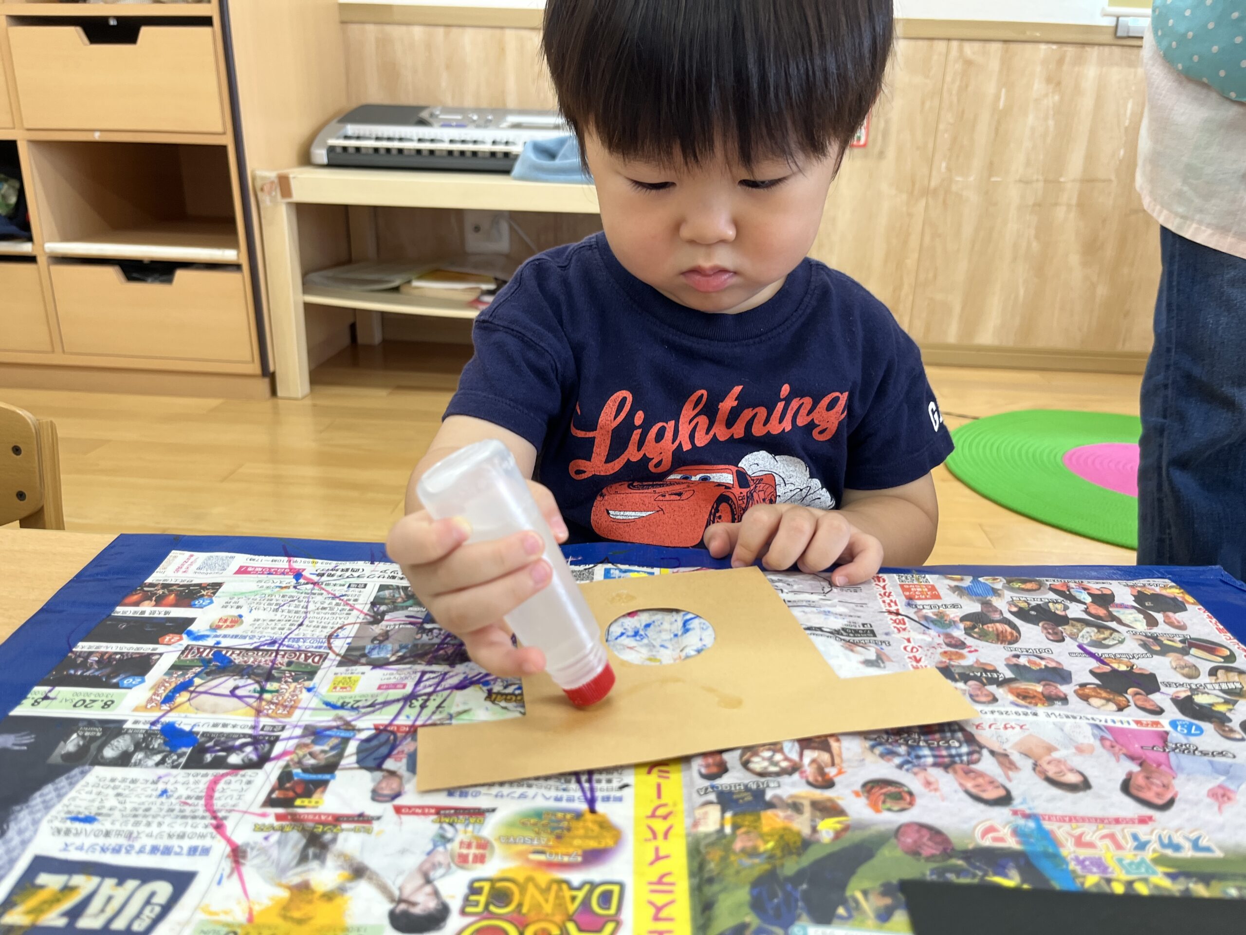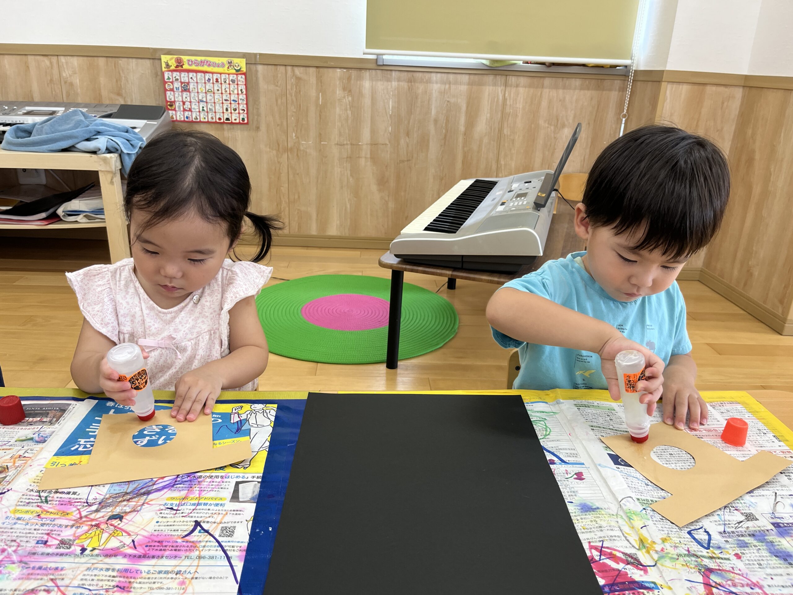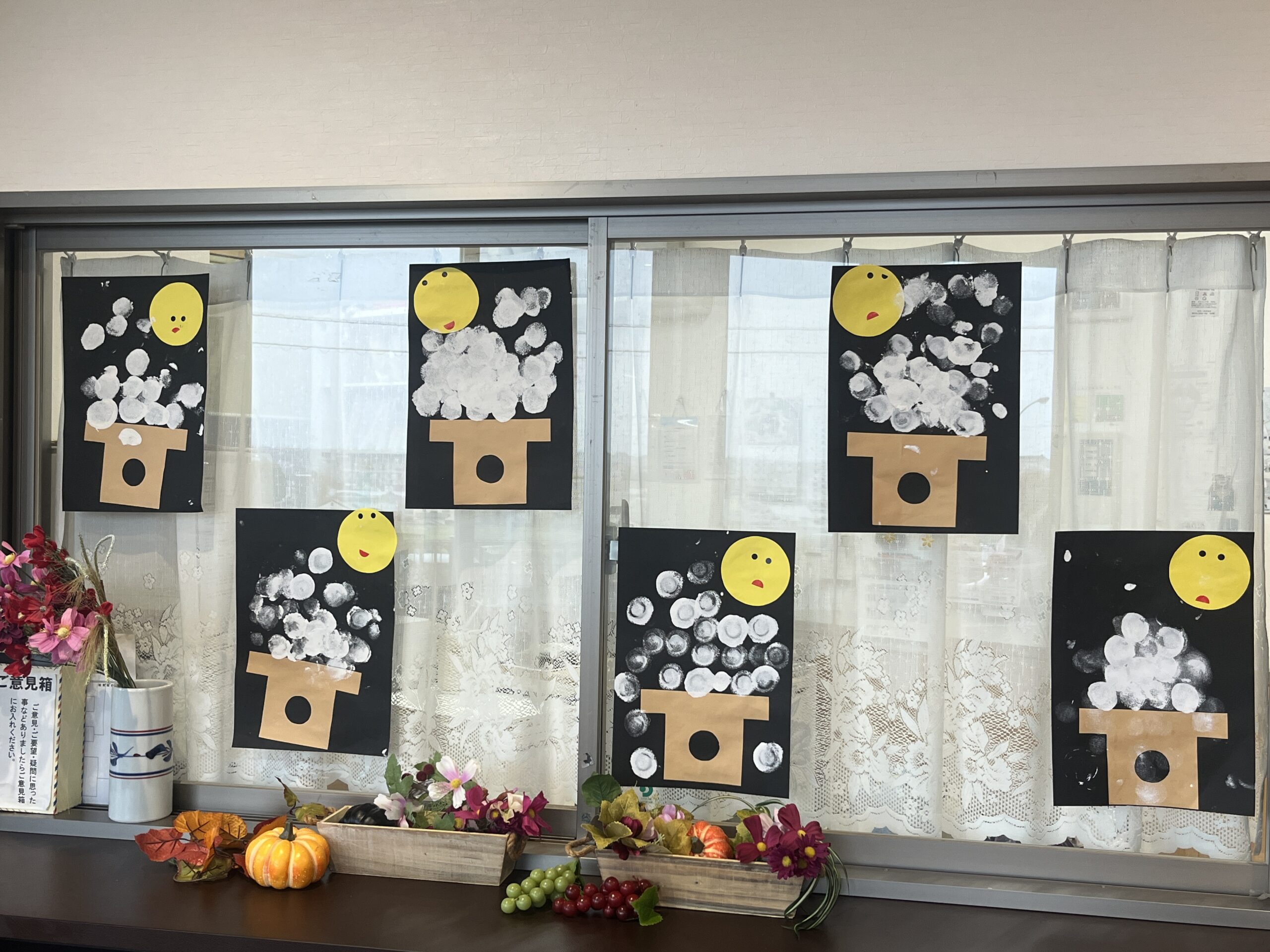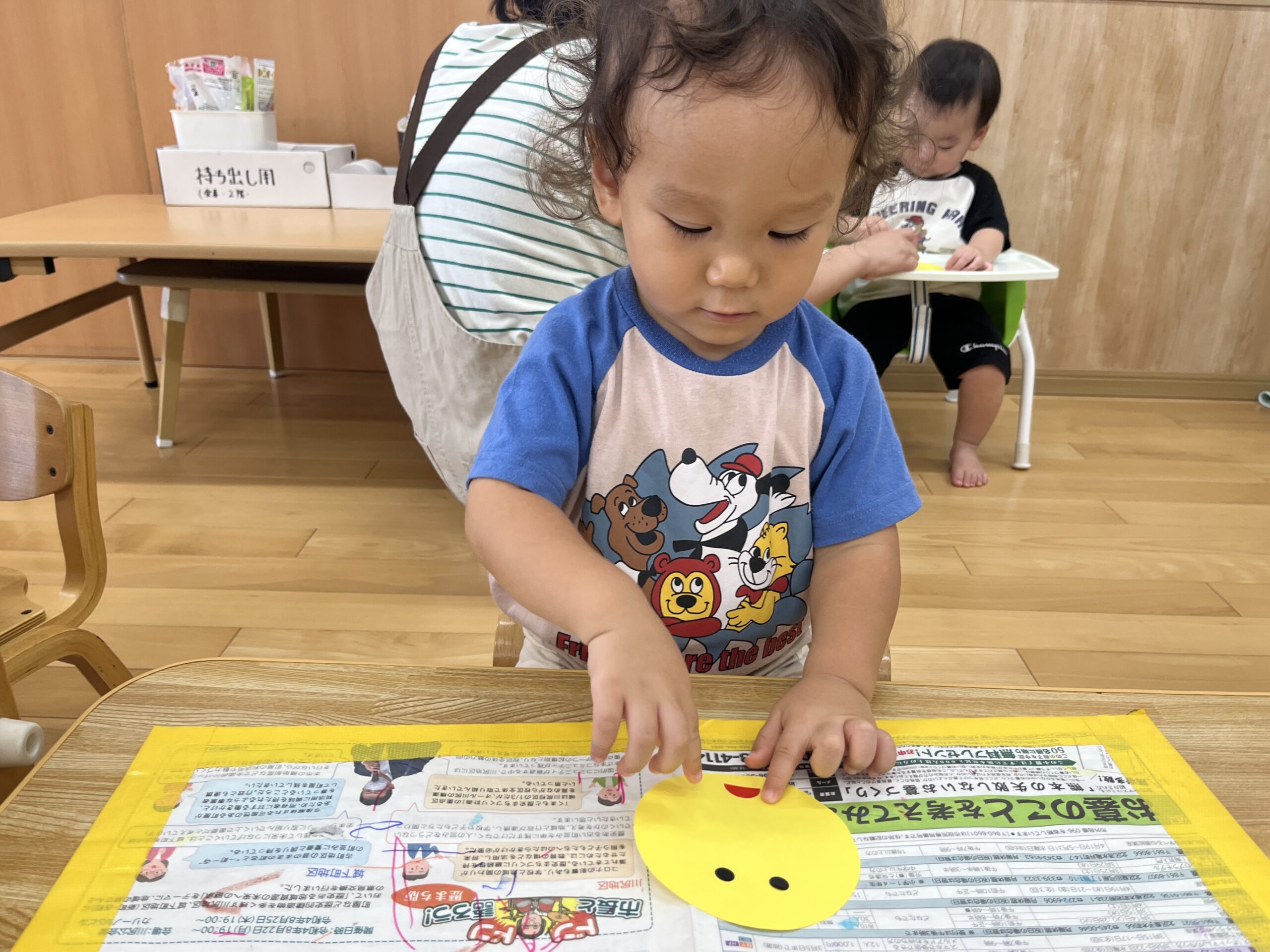 10月6日は中秋の名月です。みんなでお月見製作をしました。お月様にシールを貼って顔を作ります🌝