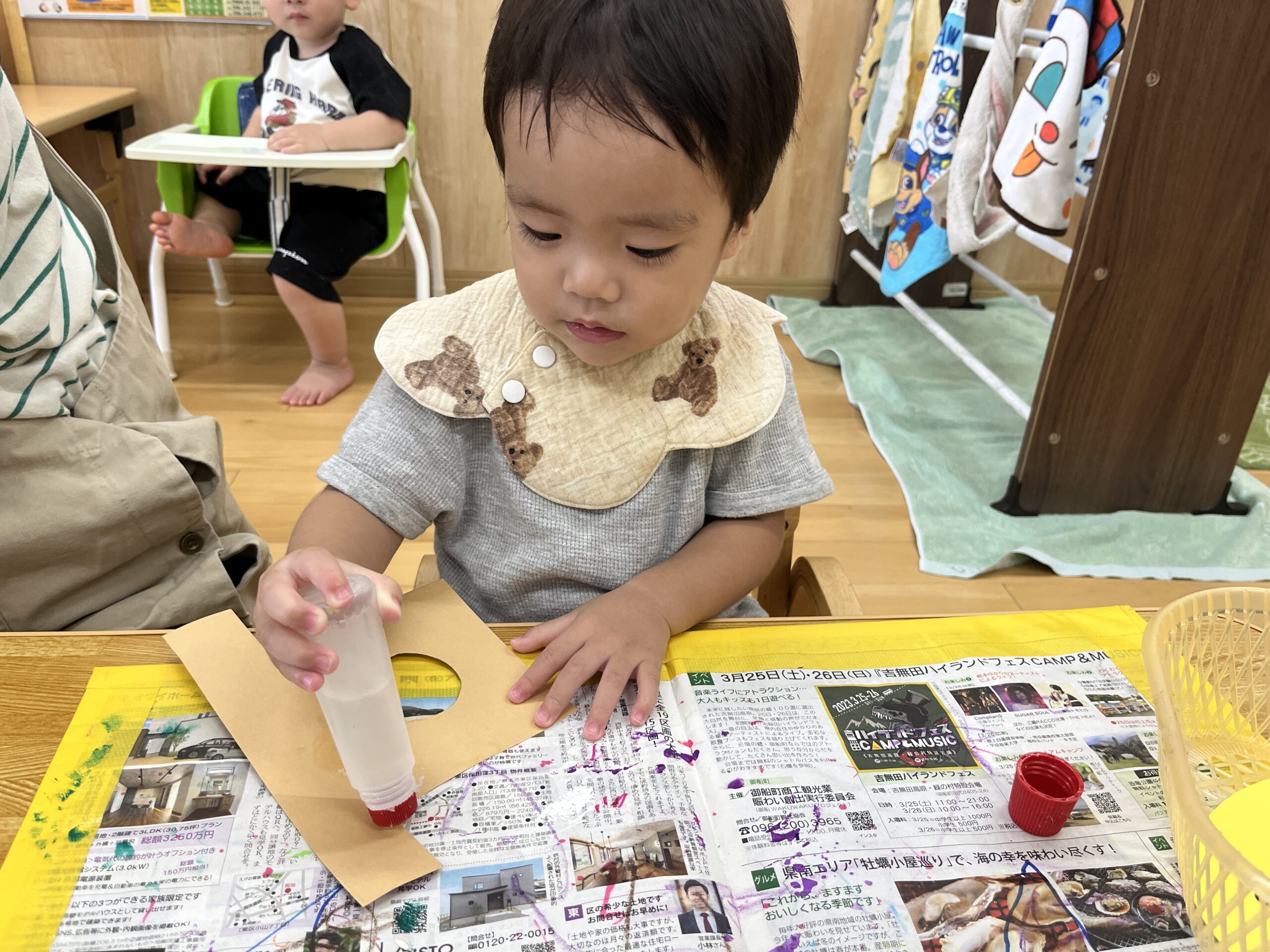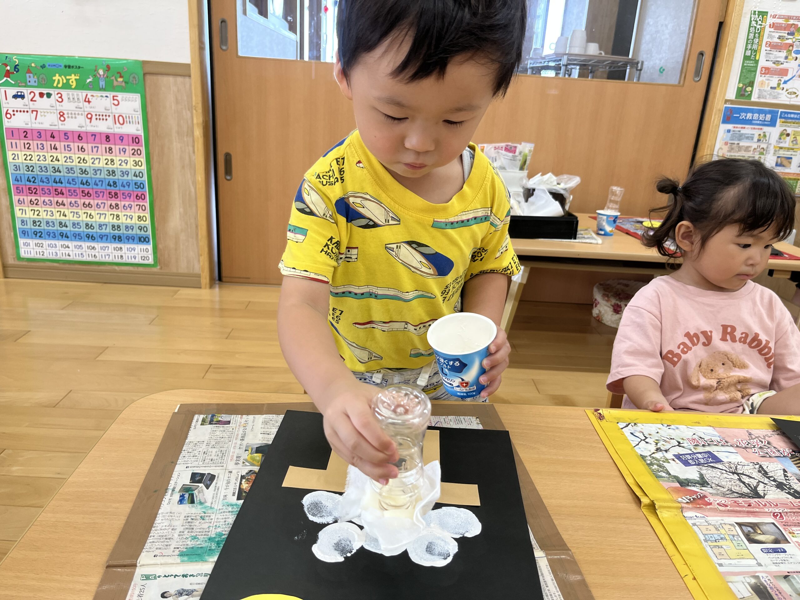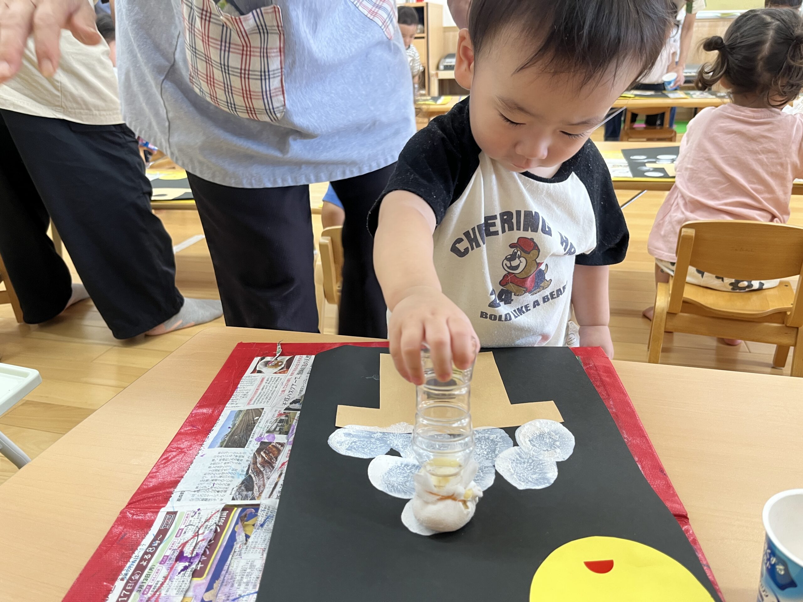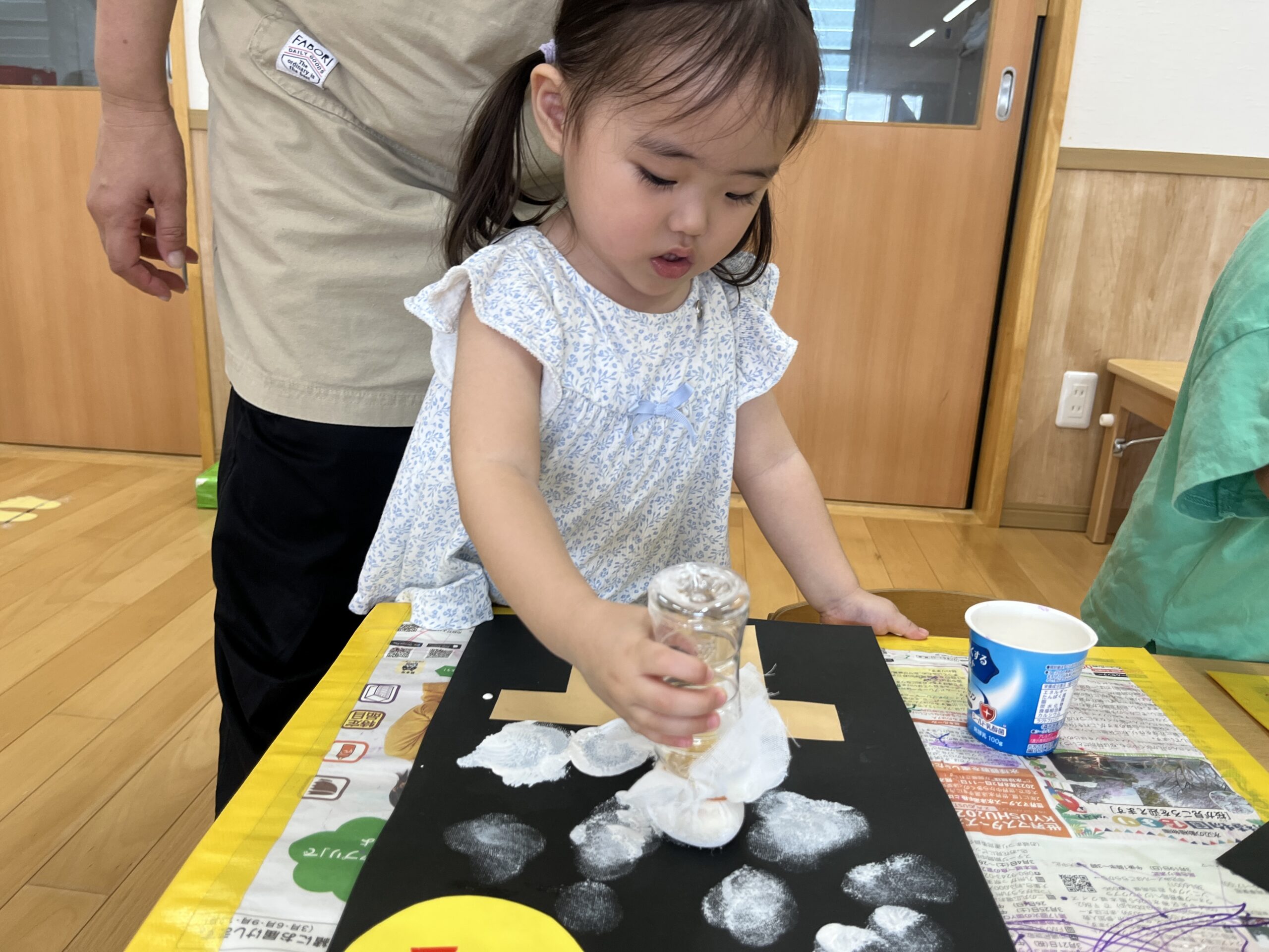 10月6日は中秋の名月です。みんなでお月見製作をしました。お月様にシールを貼って顔を作ります🌝