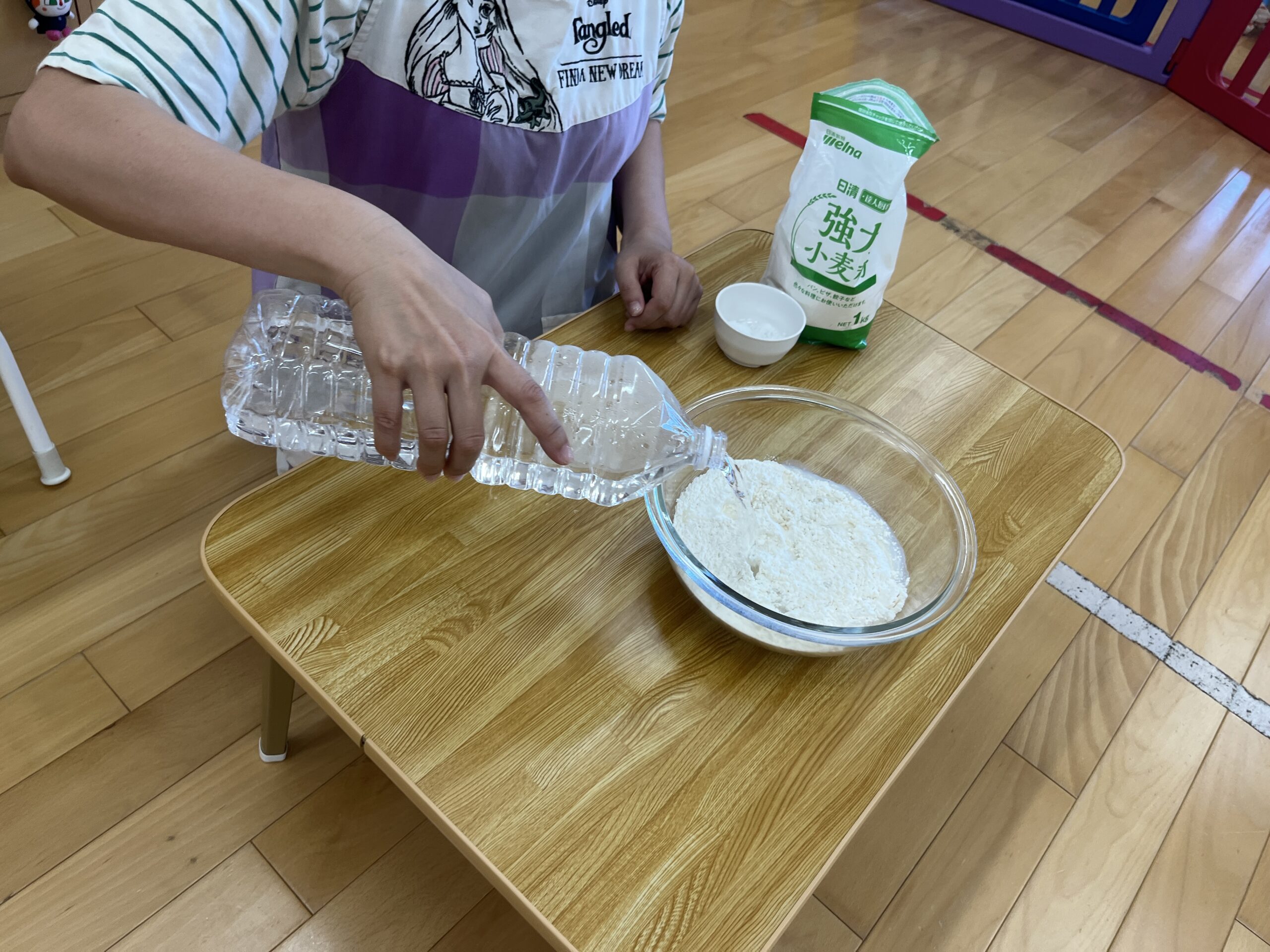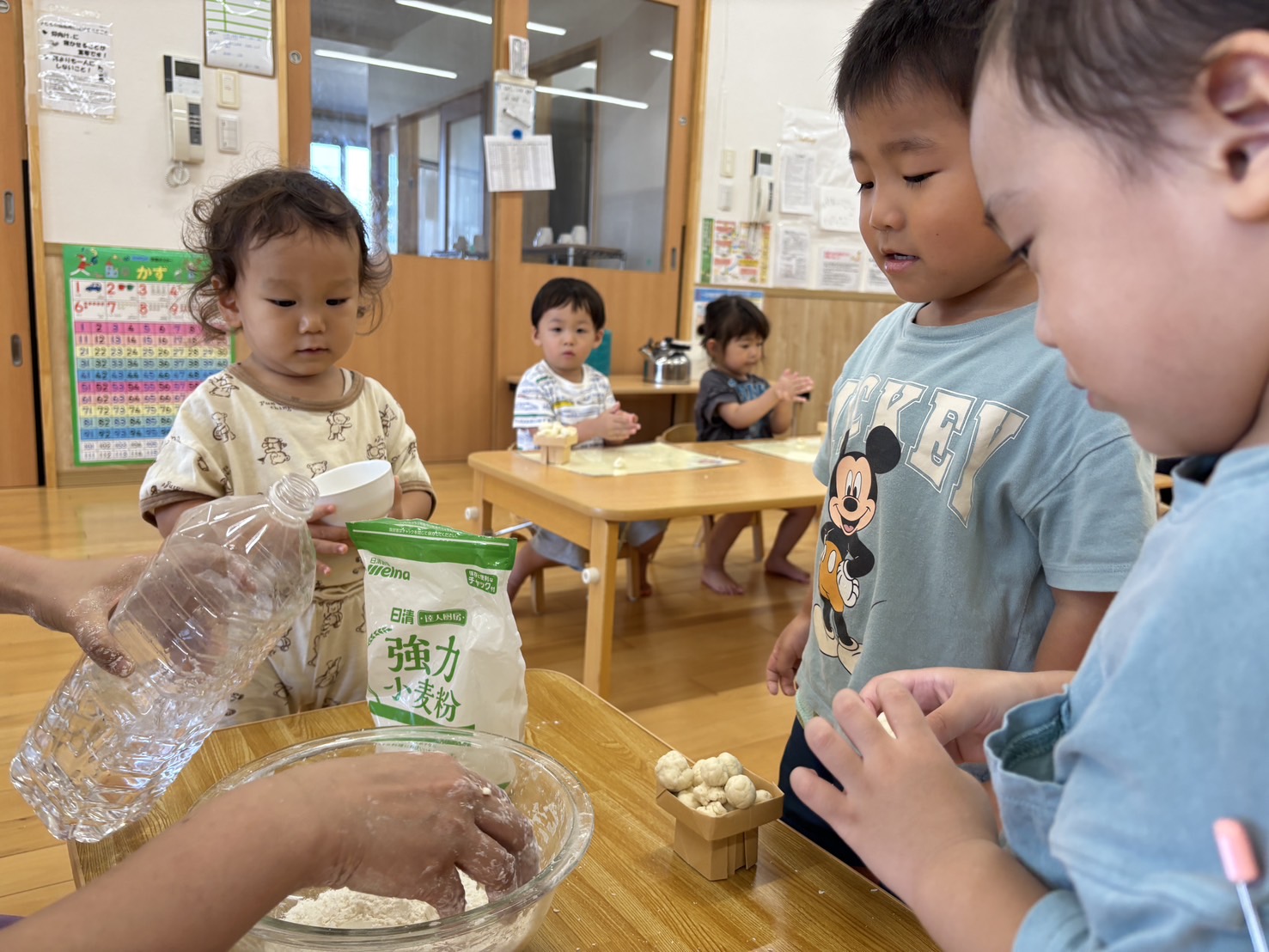 10月6日は中秋の名月でした。そこで、みんなでお月見団子を作りました。使うのは小麦粉と塩と水です。少しずつ水を入れて…