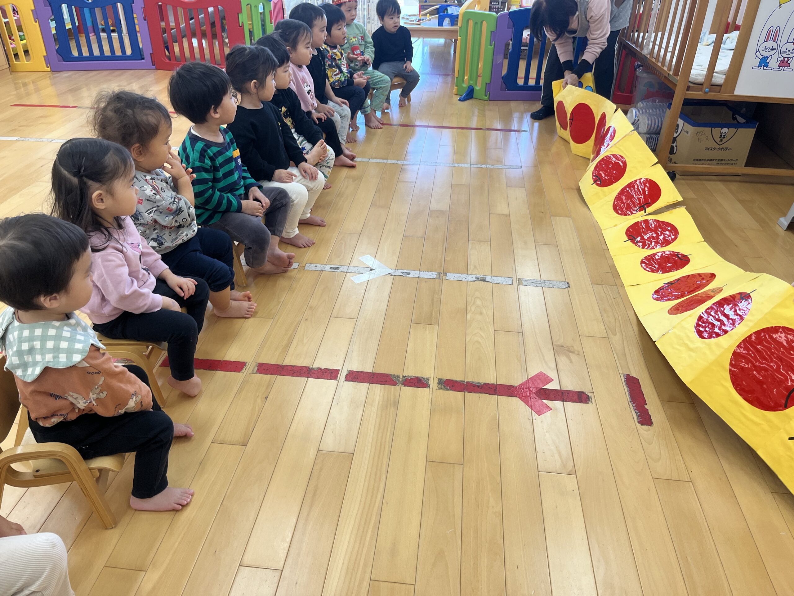 お楽しみ会の始まりです(^.^)/~~~ <お散歩りんごのペープサート> 高い所に実っているりんごを取ろうと動物たちが協力しているお話しです。あとちょっとで届くぞ~!