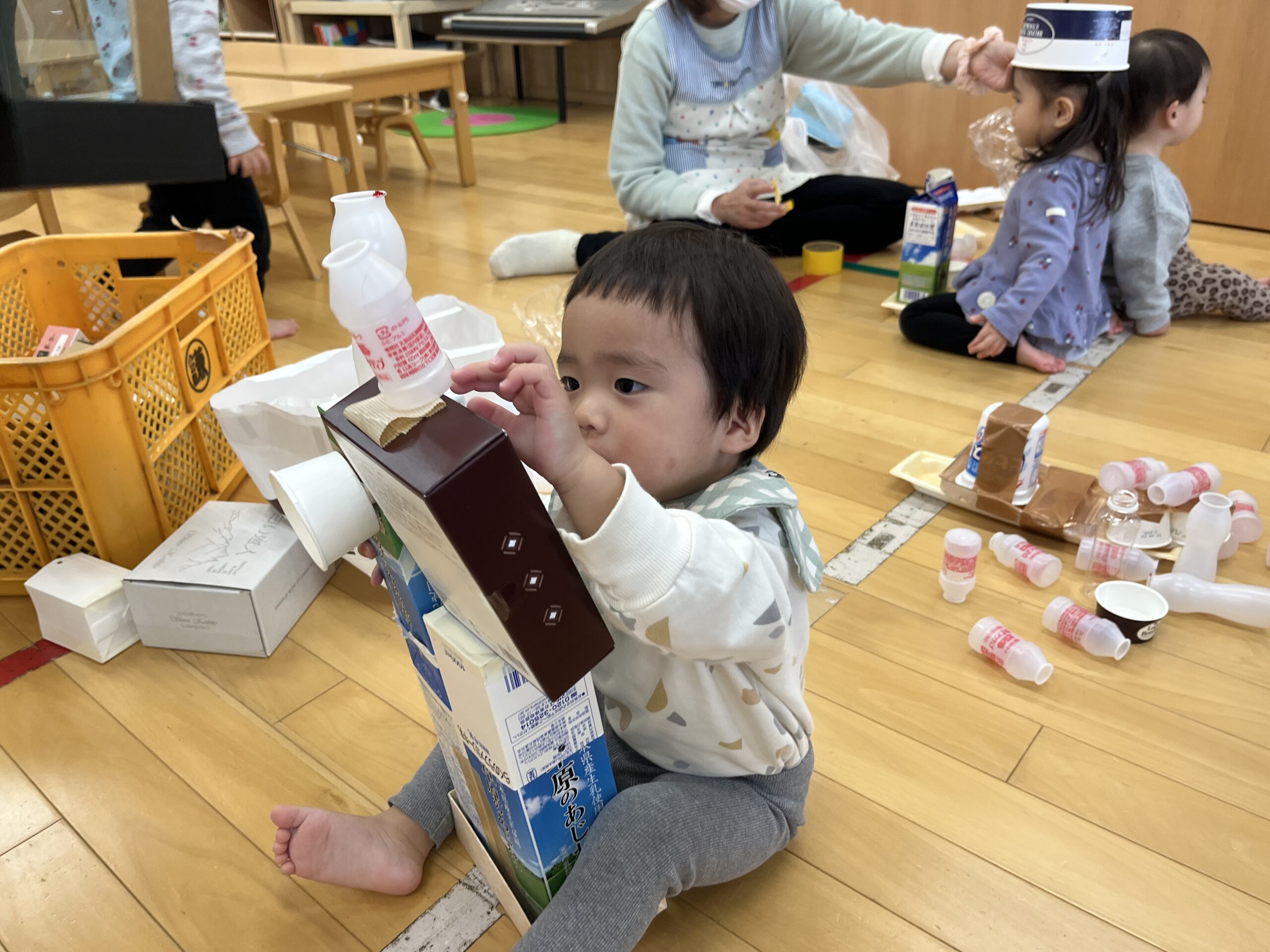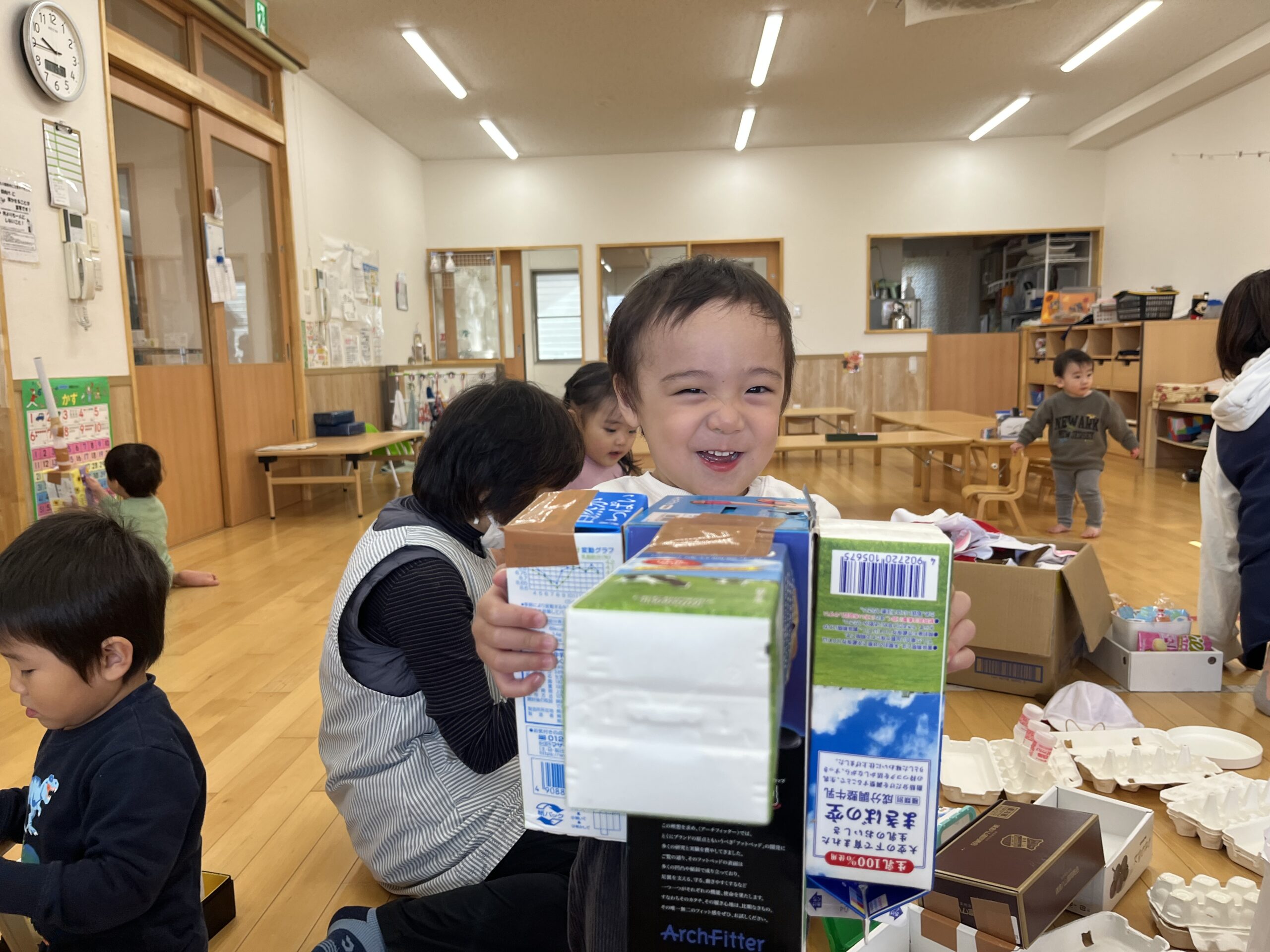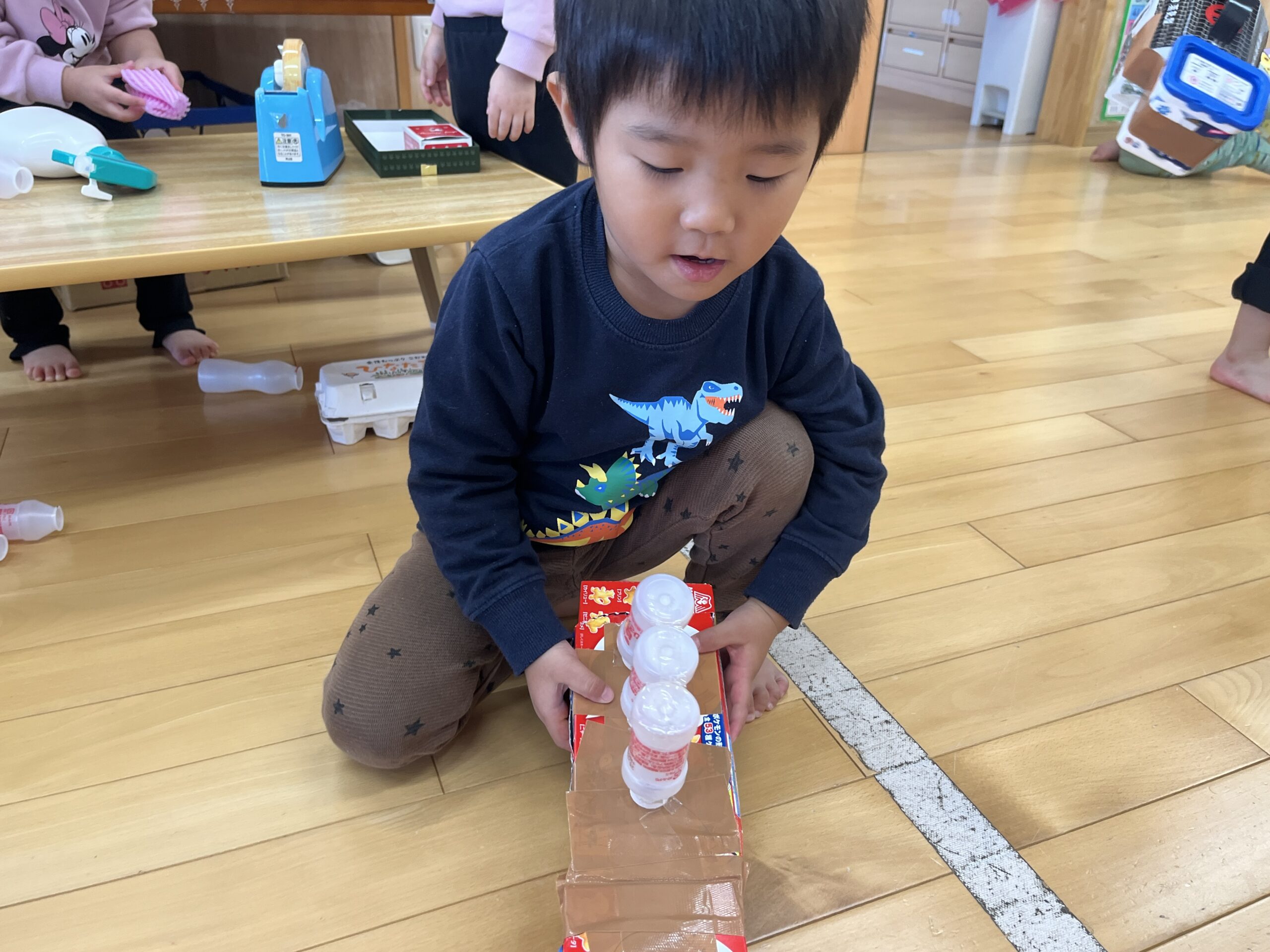 お気に入りの箱や容器を組み立てていきます くっつけるのは先生たちもお手伝いしてくれましたよ