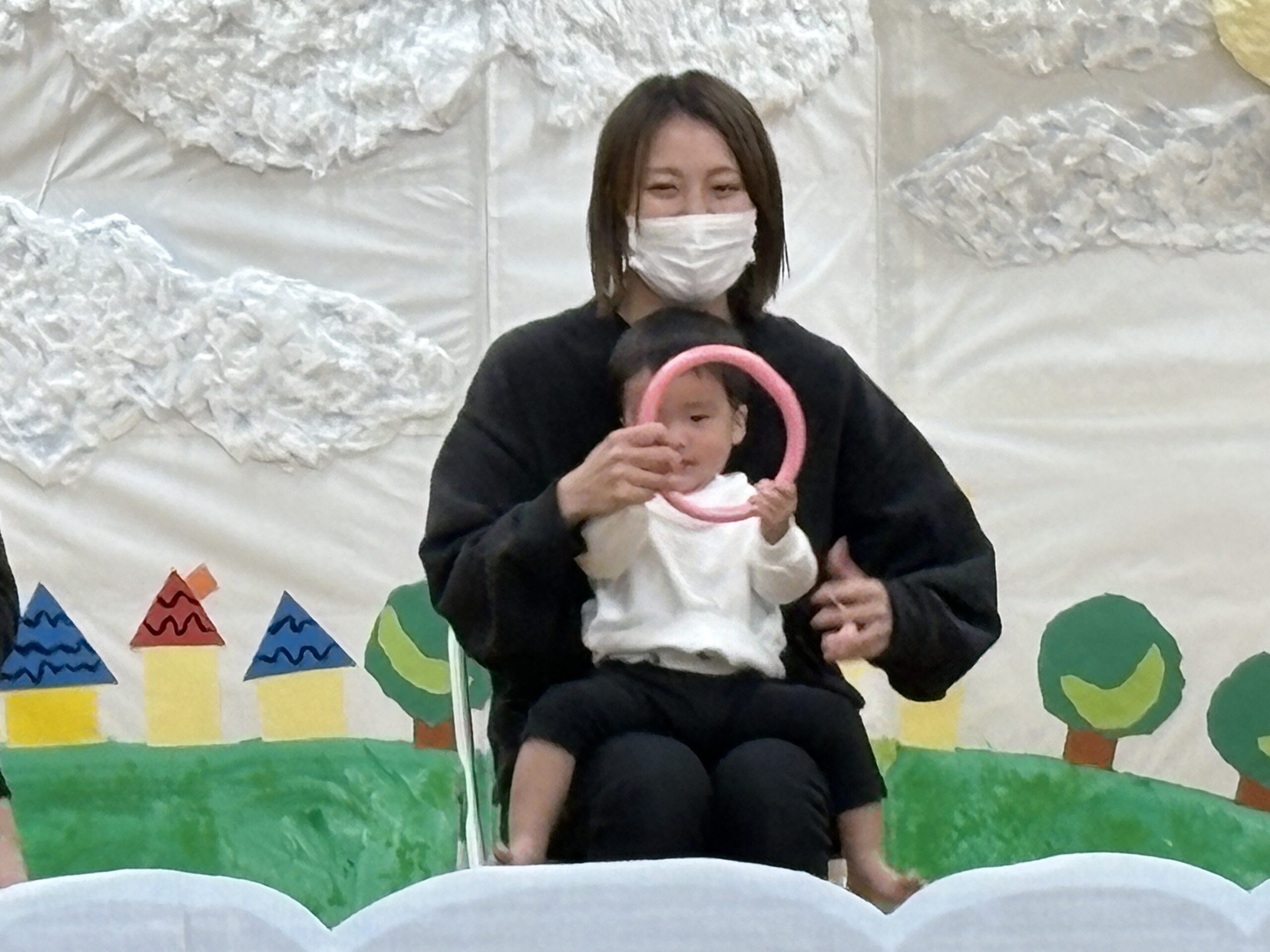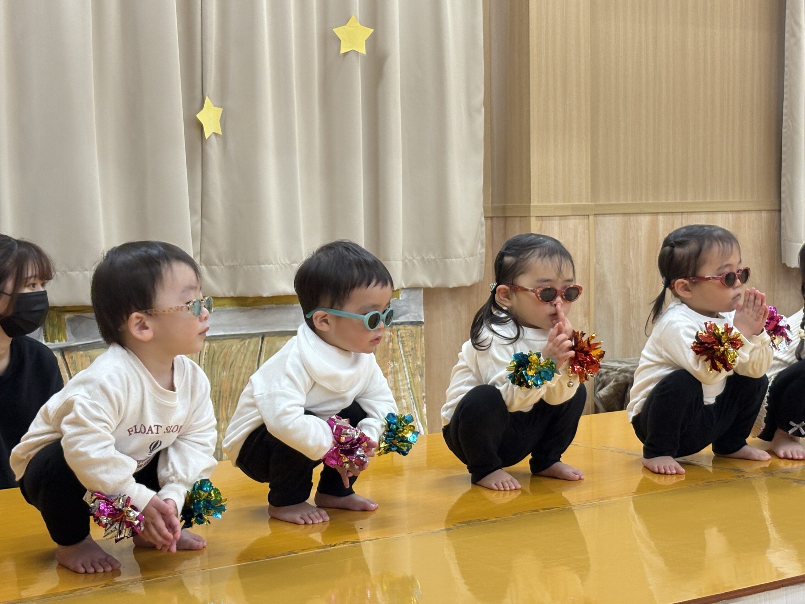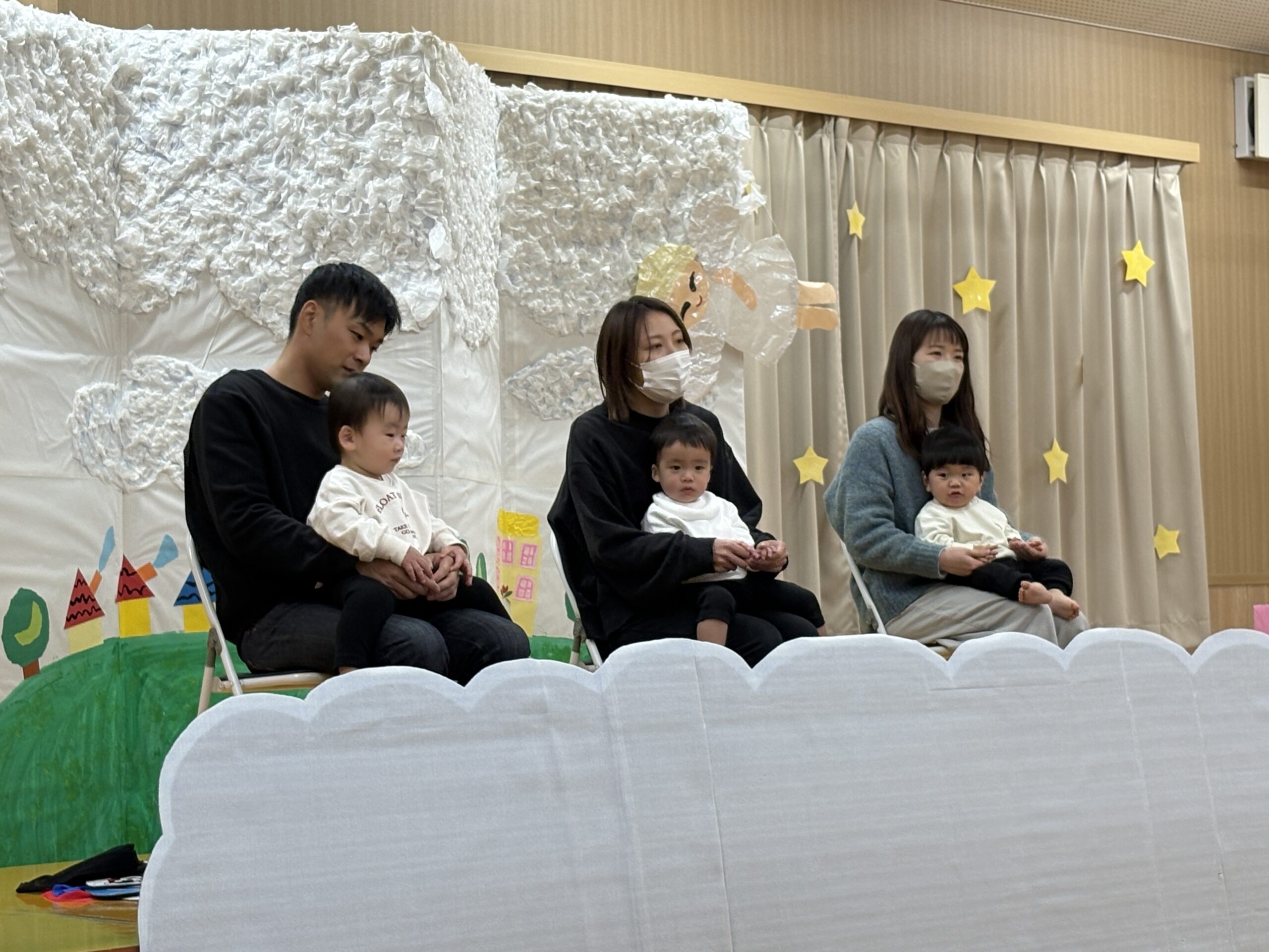 プログラム2番は0歳児さんの表現あそびです。♫バスに乗ってゆられてるGO!GO!