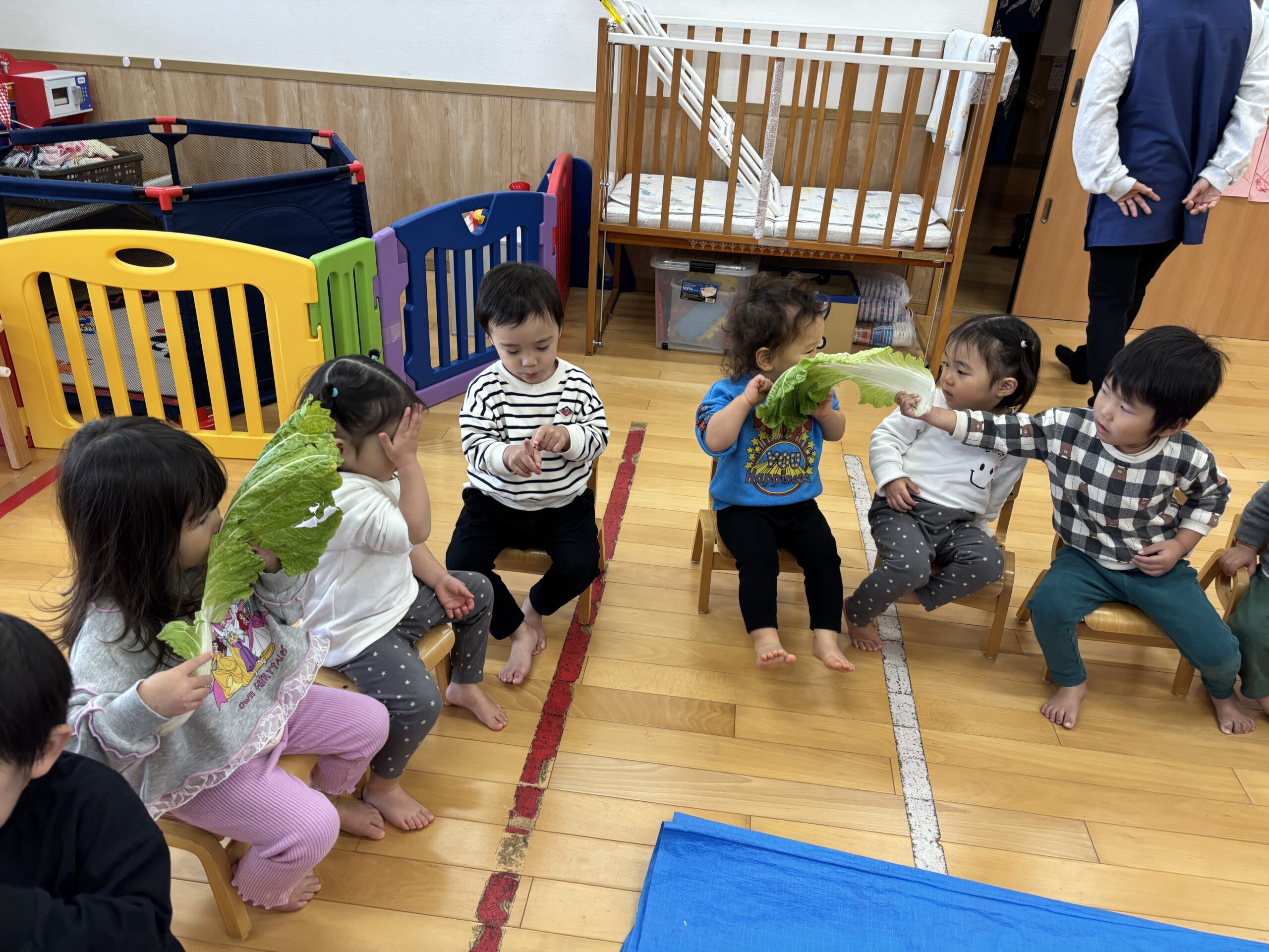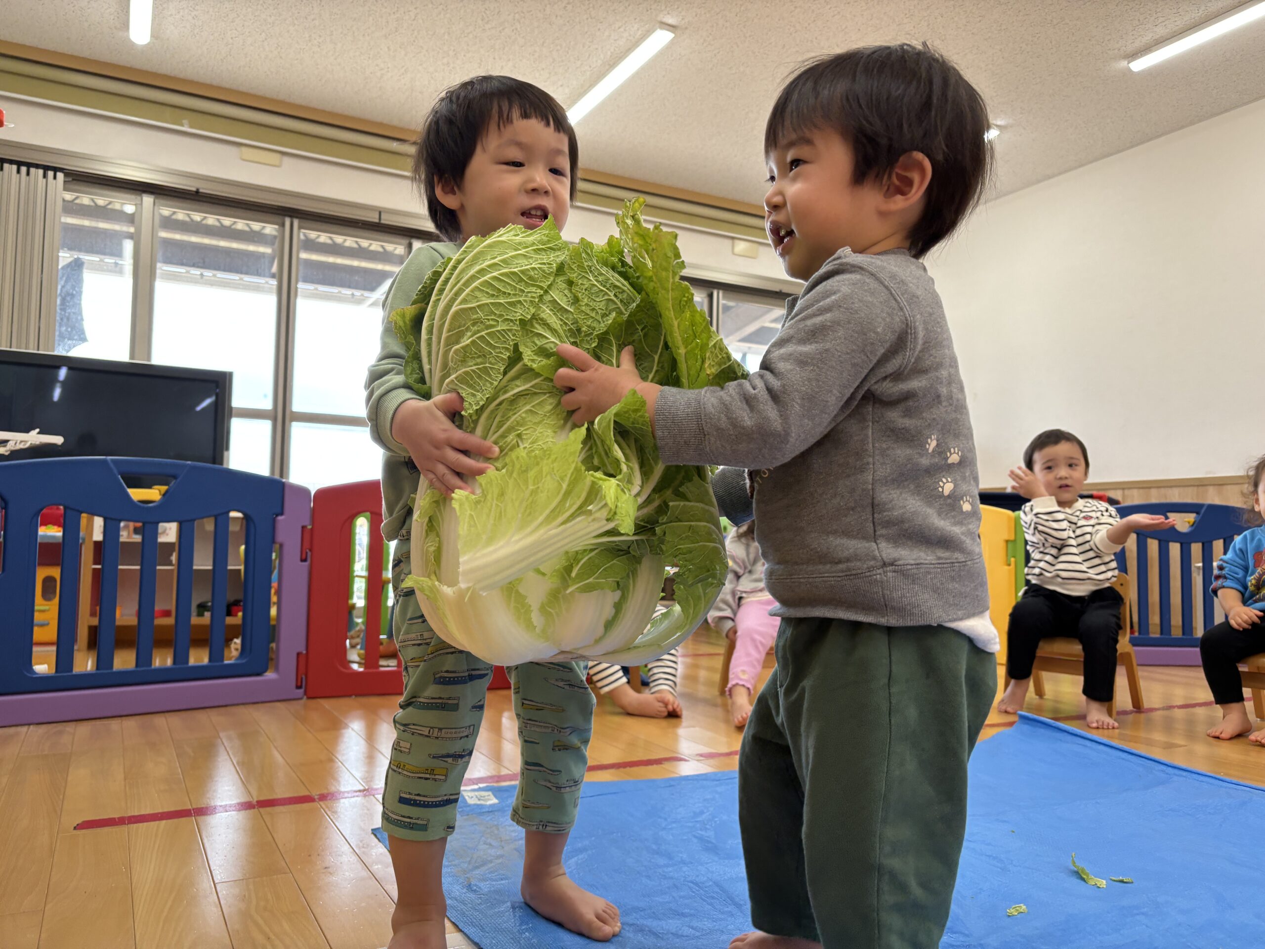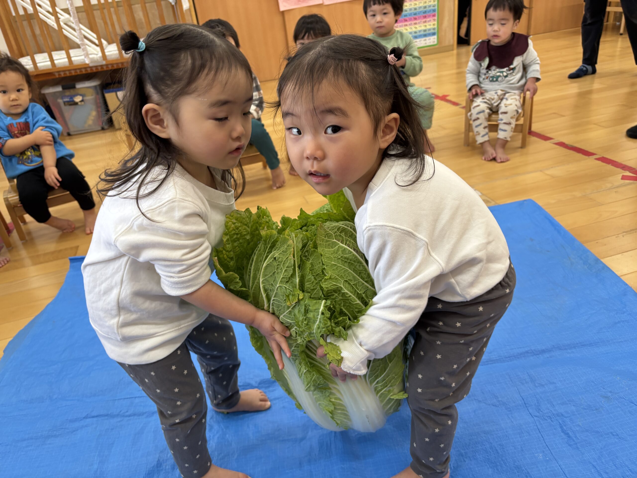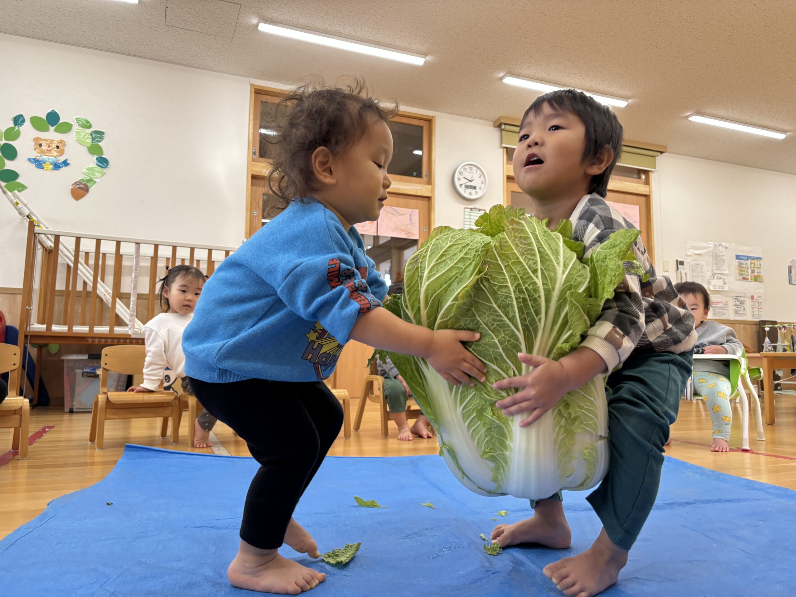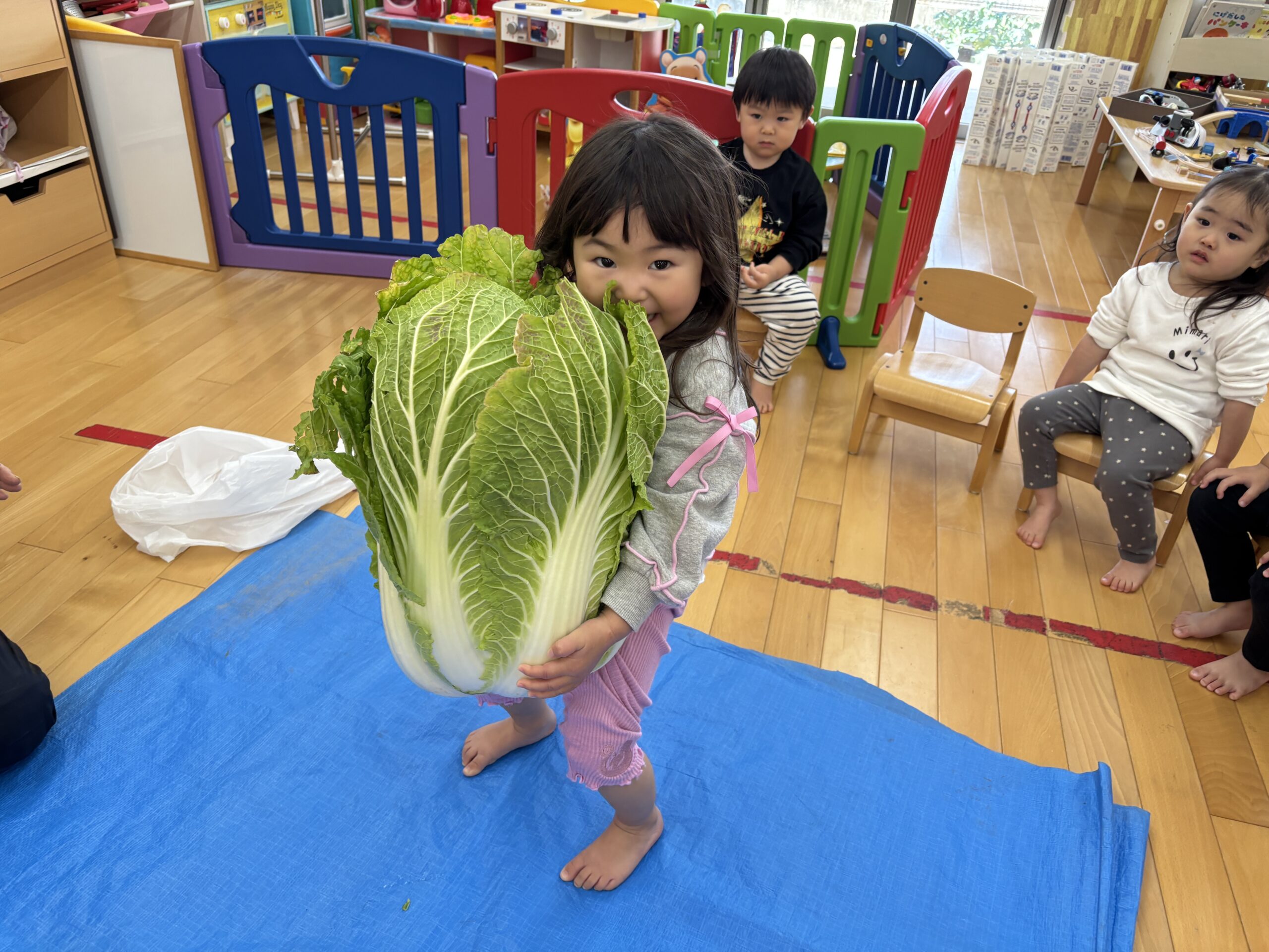 大きな白菜で力比べをしました💪ん~持ち上がるかな~⁈