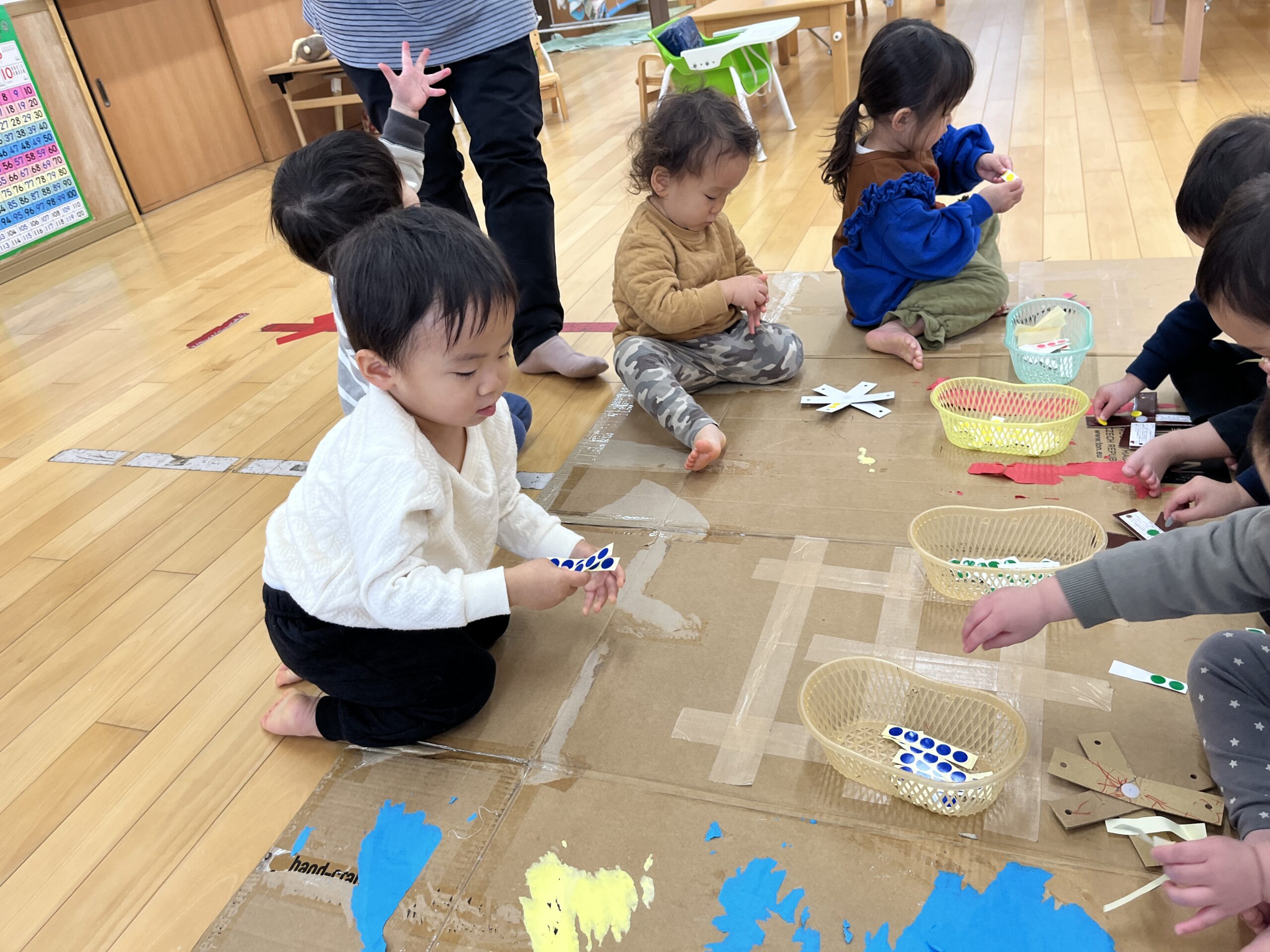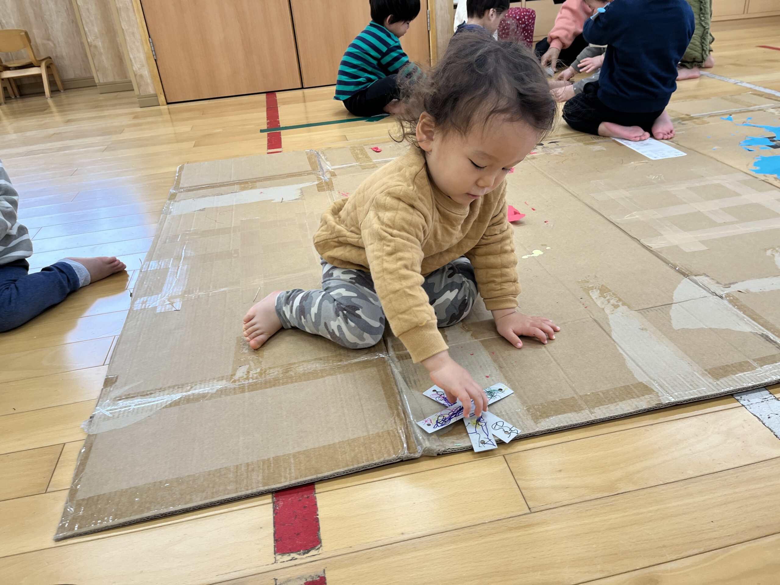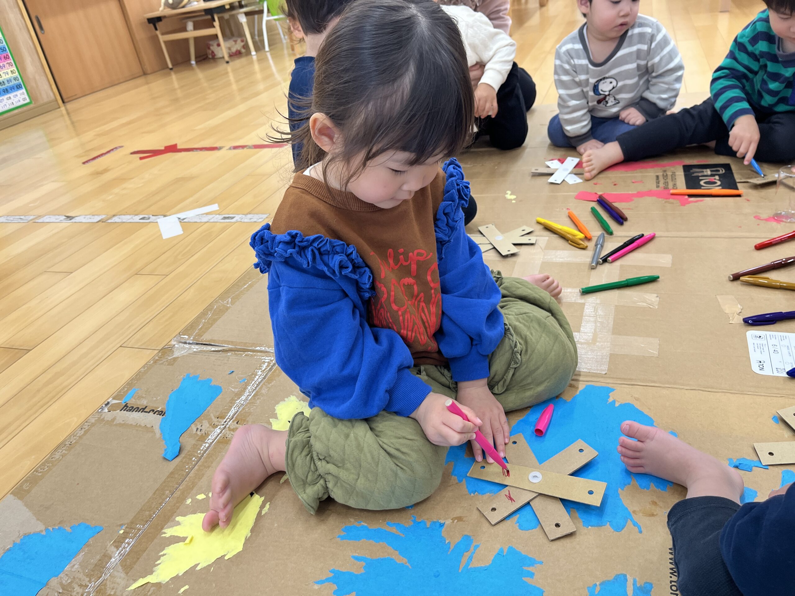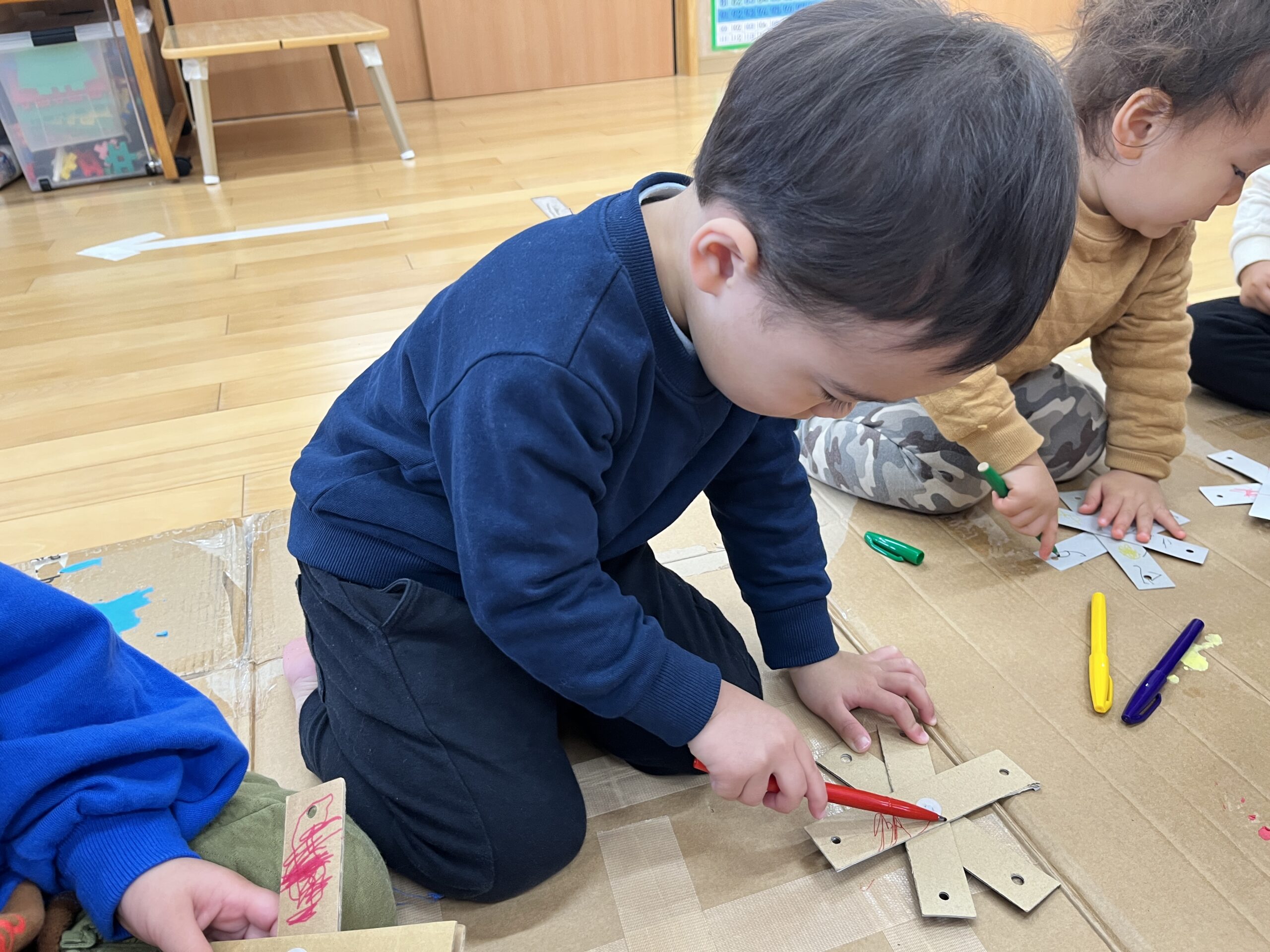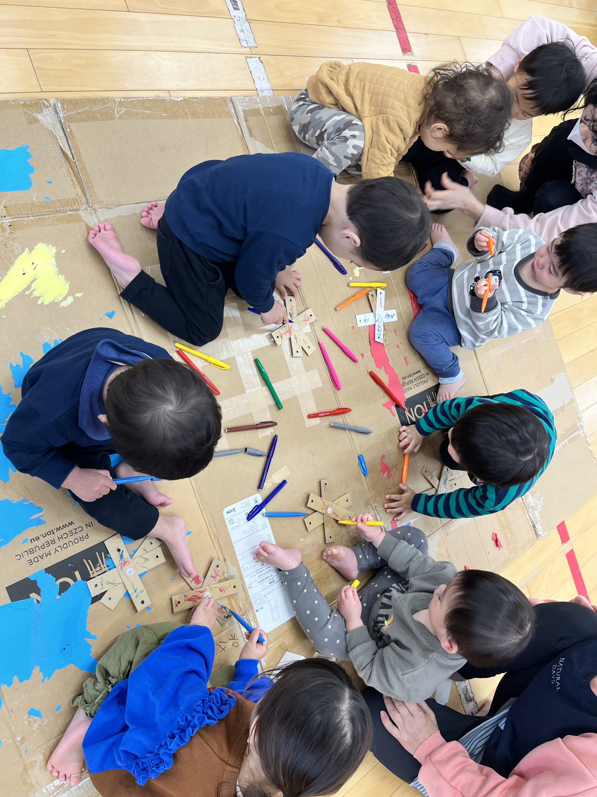 令和8年、最初の遊びはコマ作りです。プラネジで段ボール板を止めて色を付けます🖋