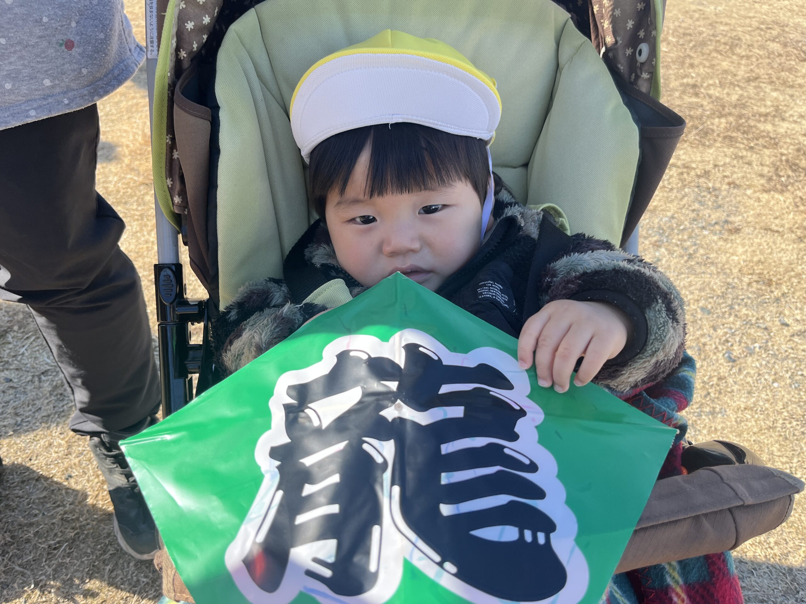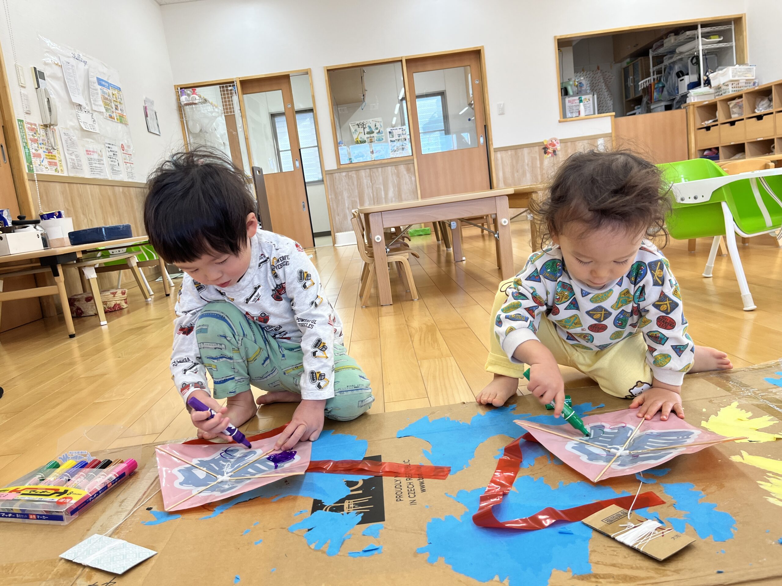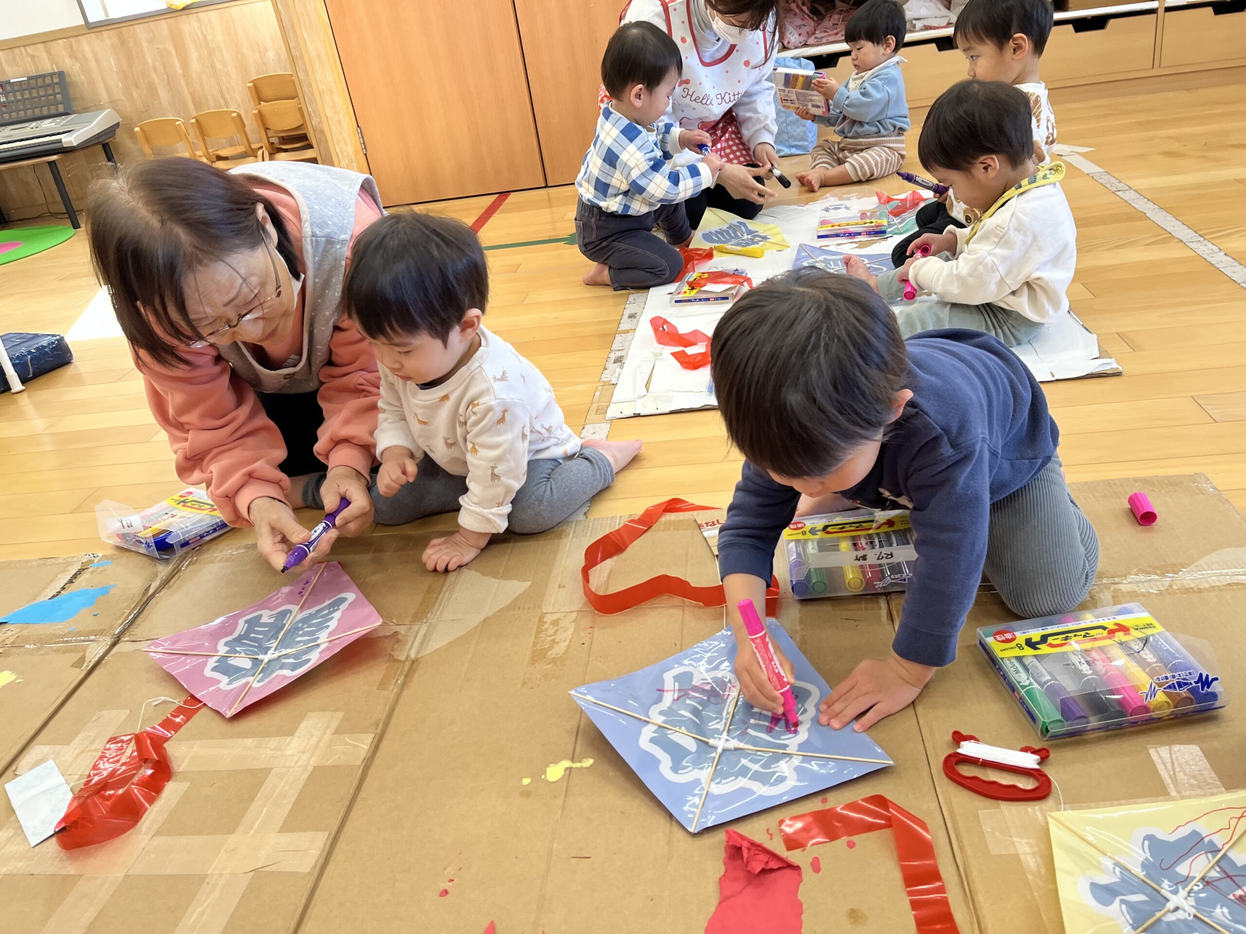 凧はね、手を挙げて走って、風に乗せて揚げるんだよ!先生がやり方を教えてくれました。それでは、凧が空高く上がるように、絵を描きをしましょう🖊