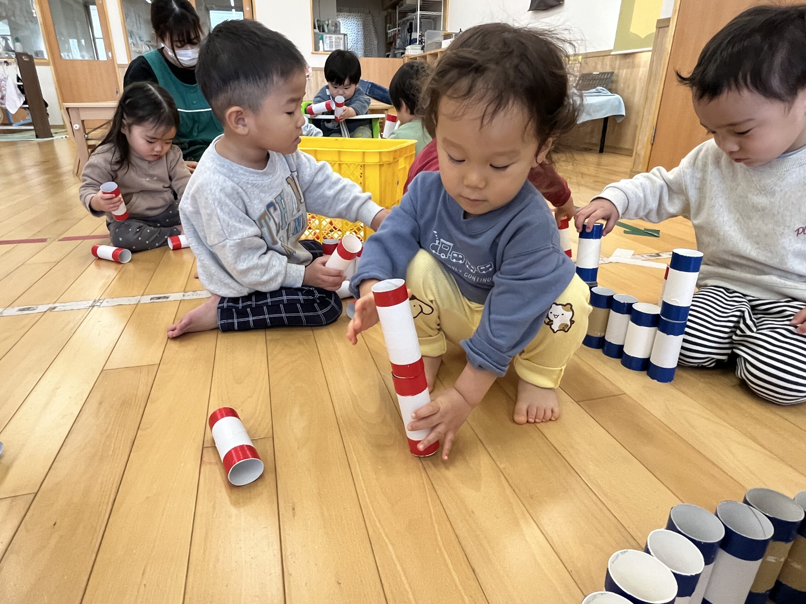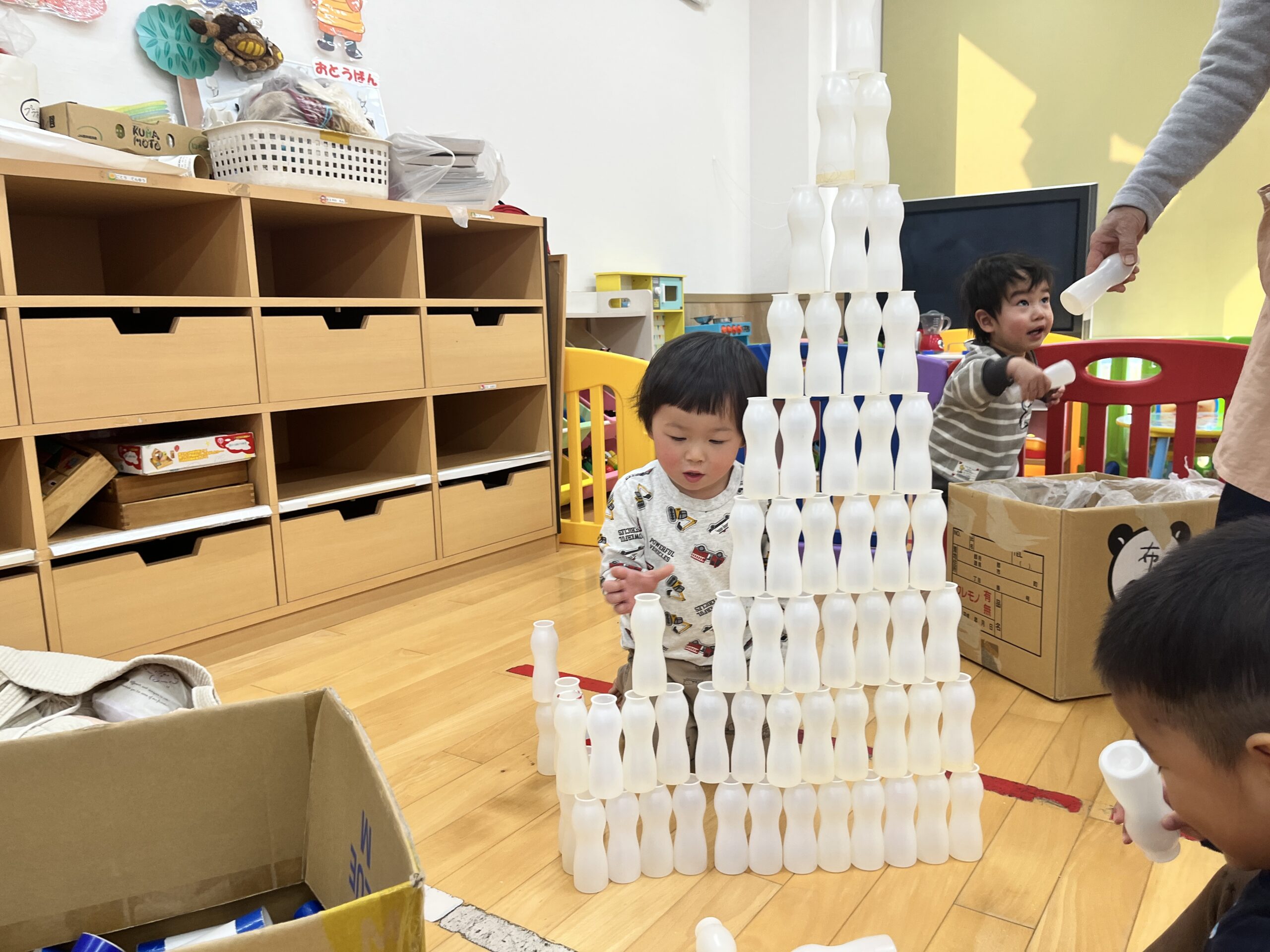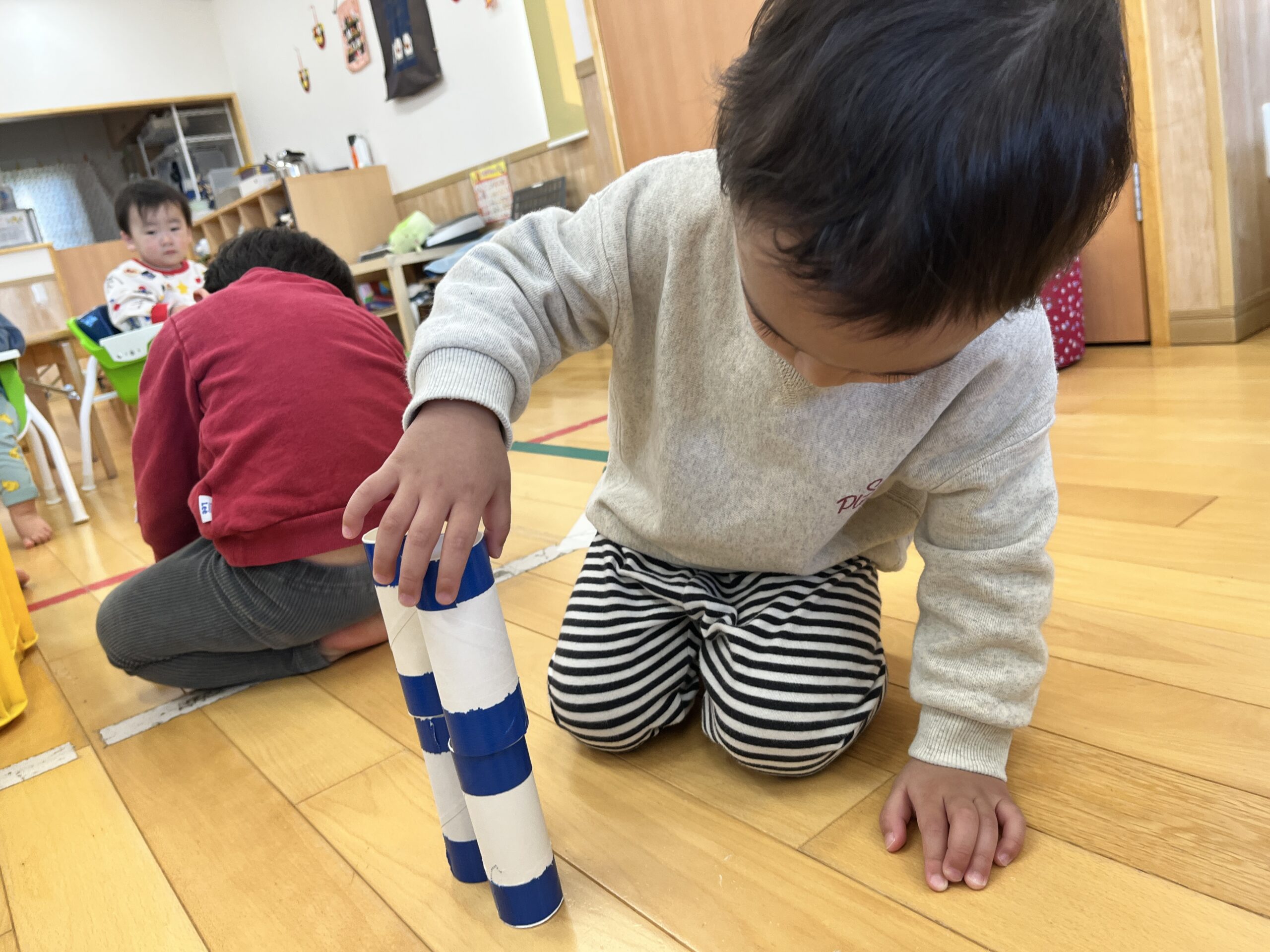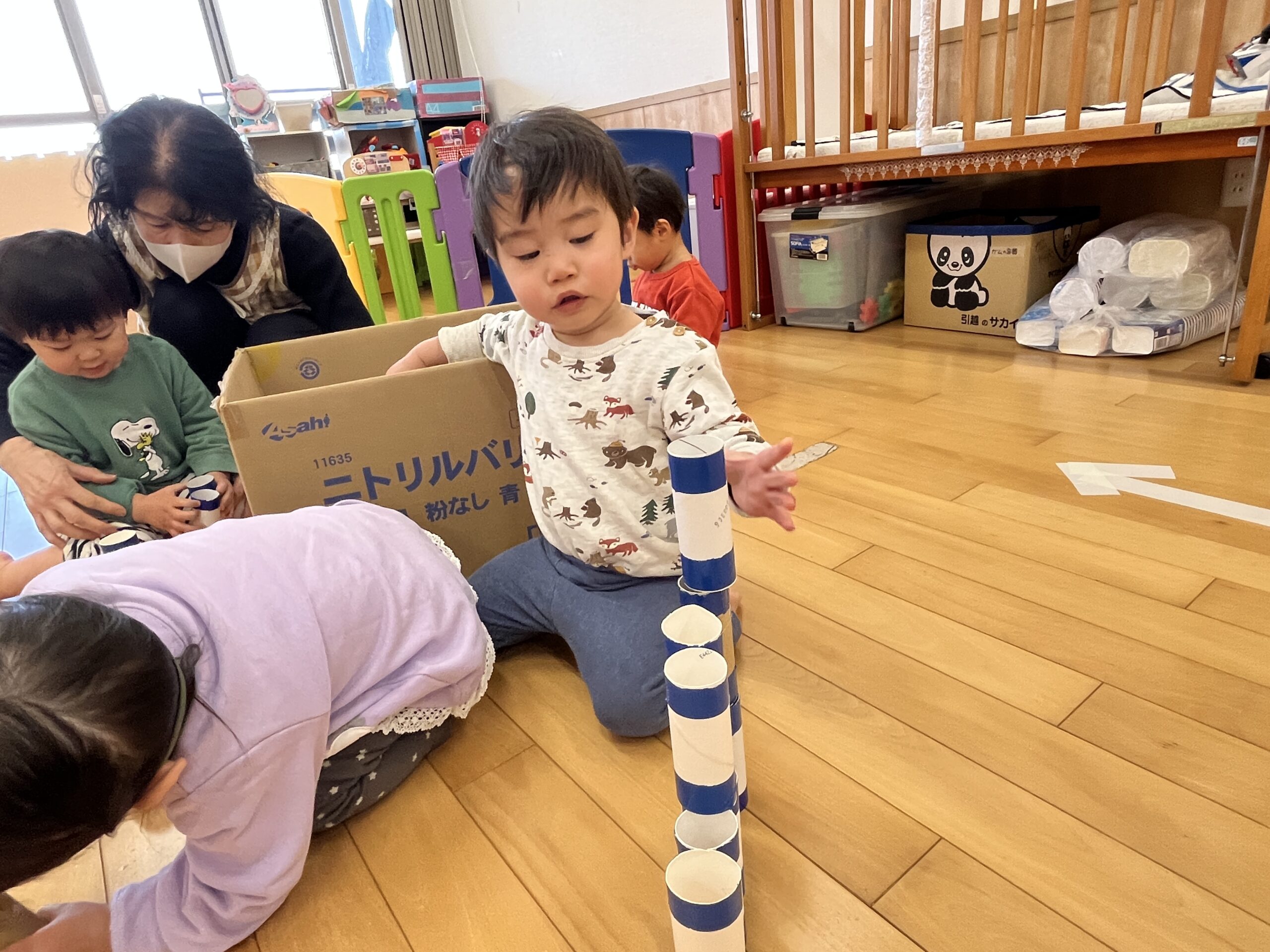 日頃から色々な素材を組み立てて遊んでいる子ども達です。今回は、ペーパー芯や容器を積み上げて遊びました。