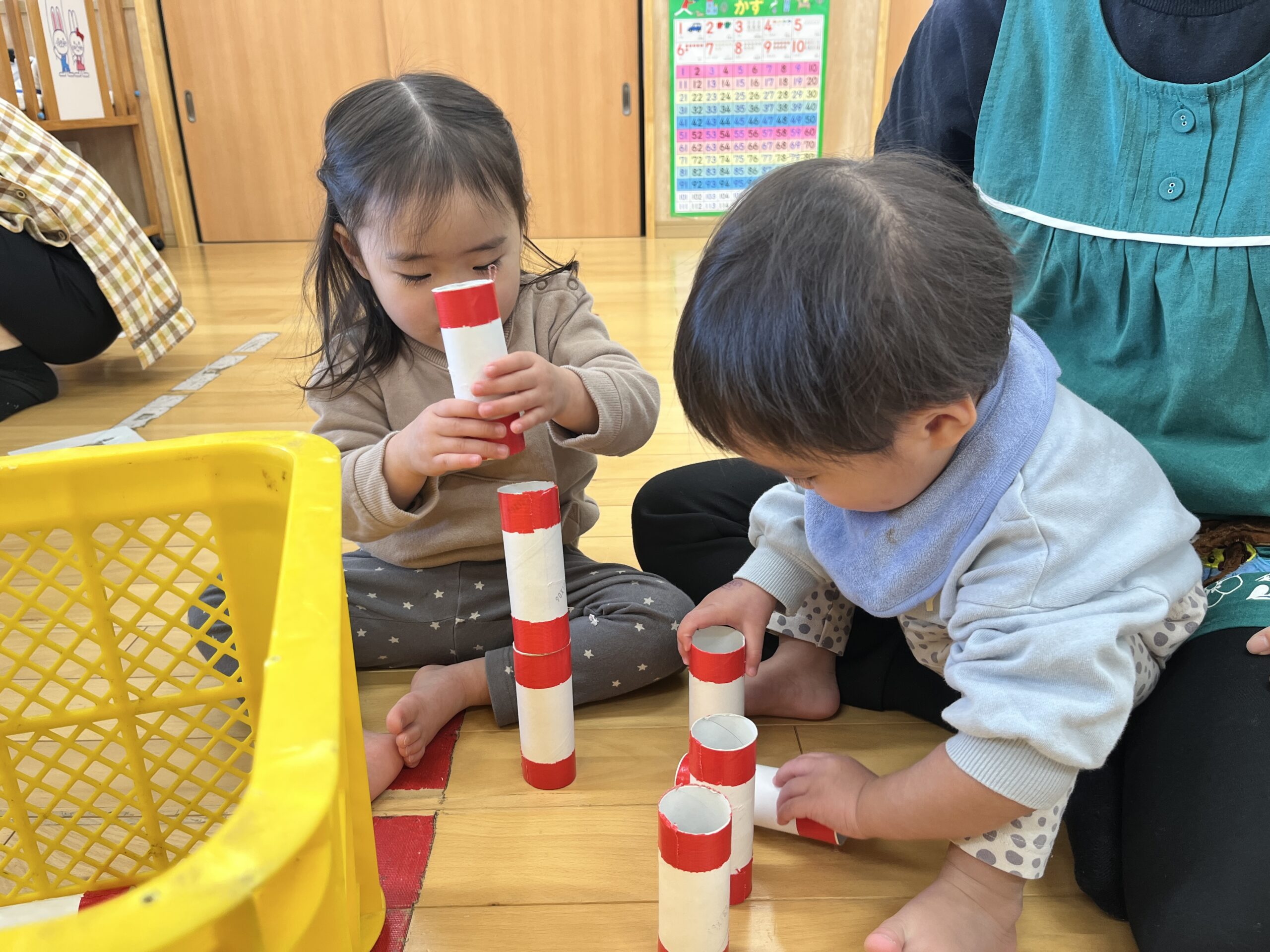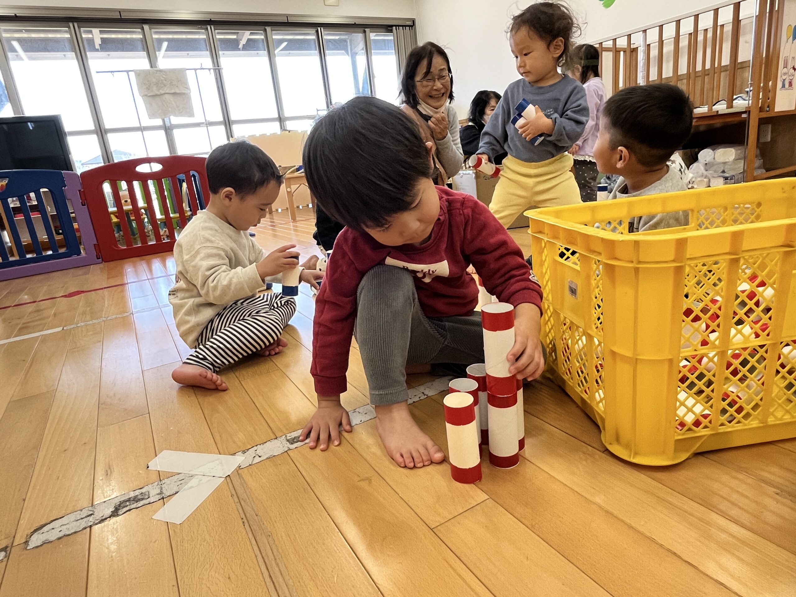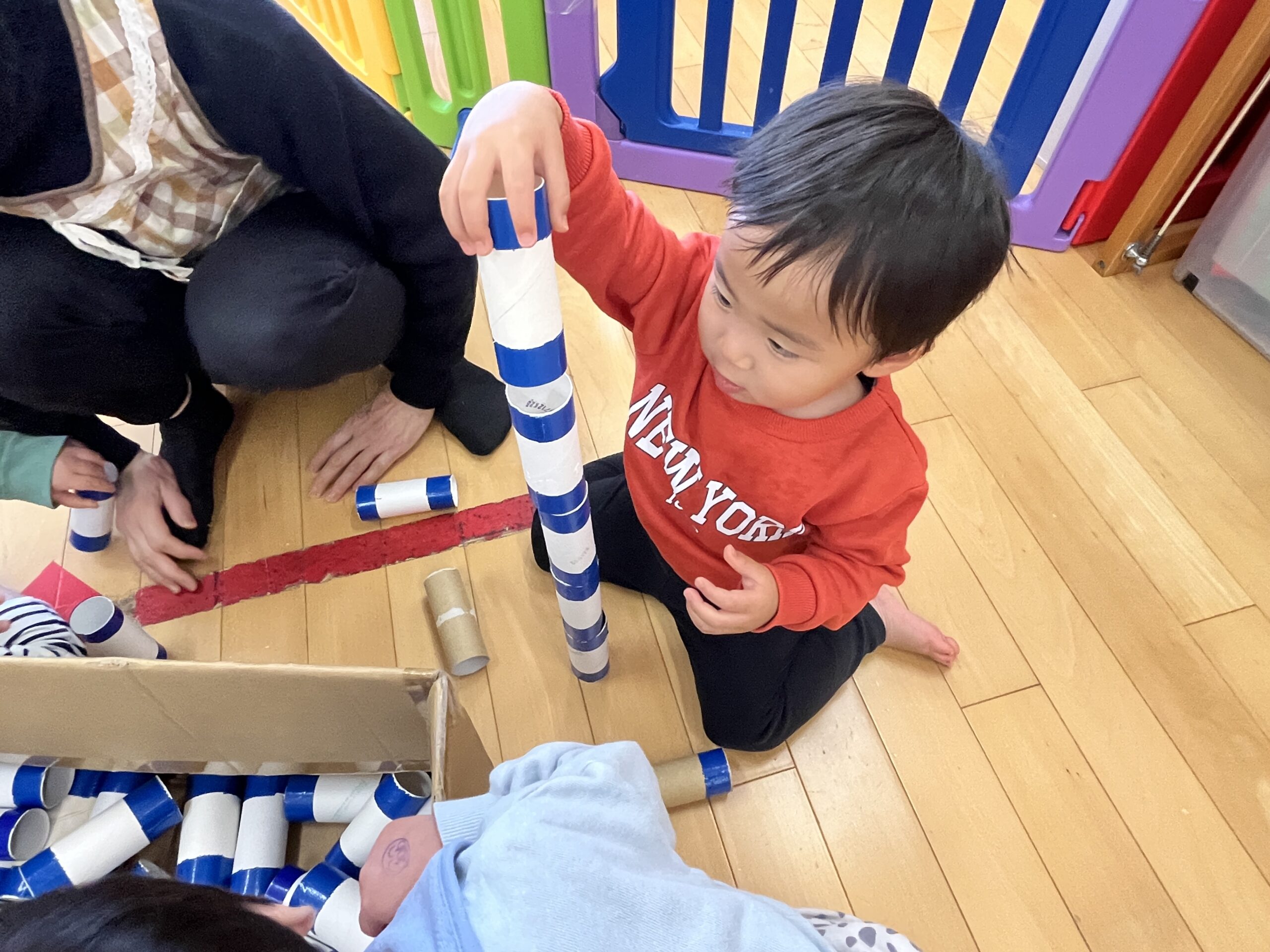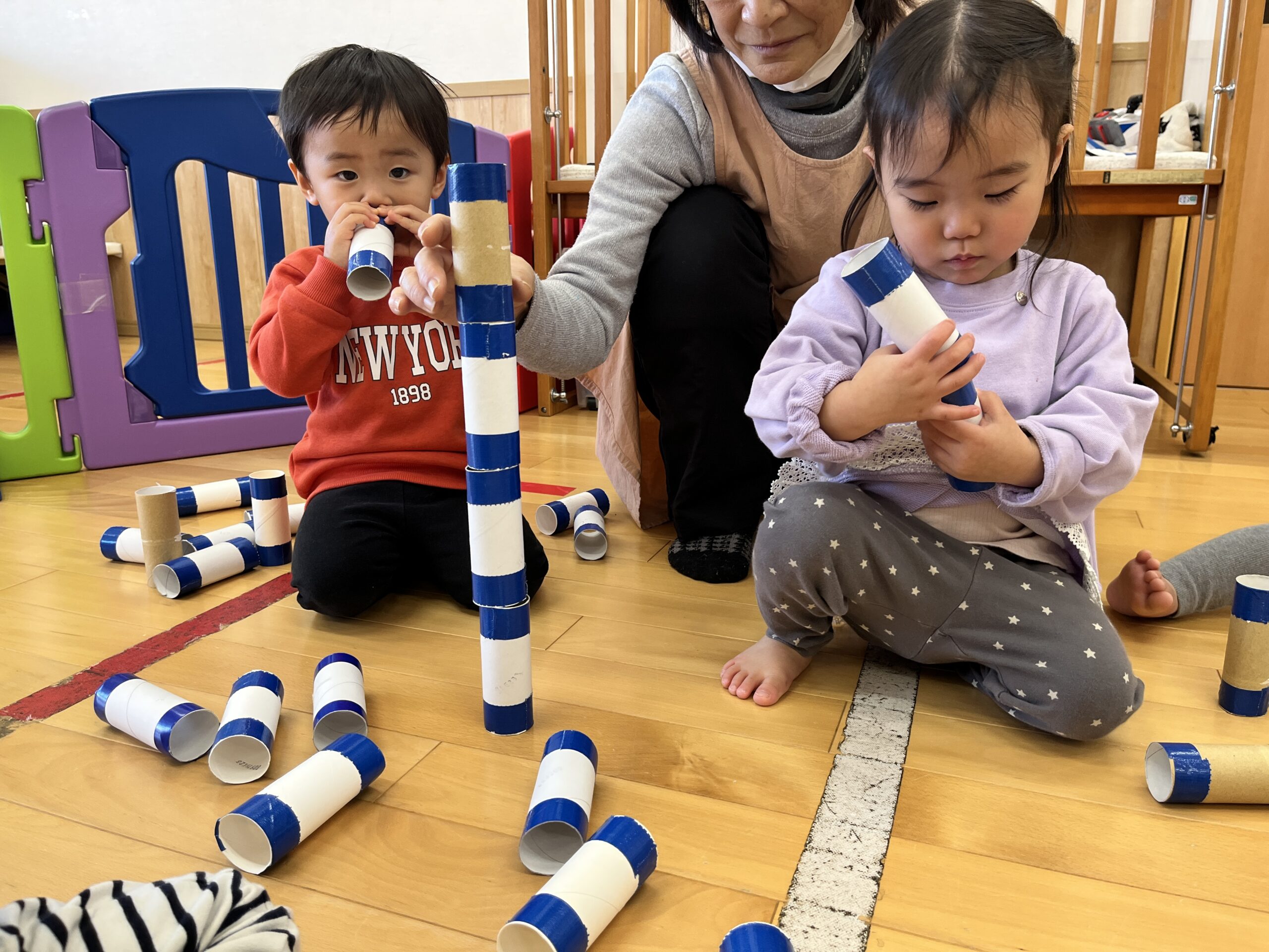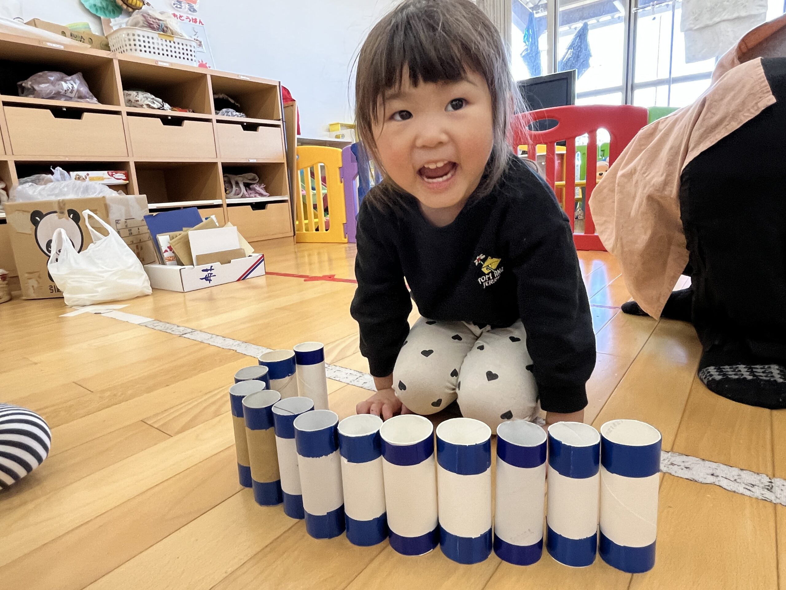 日頃から色々な素材を組み立てて遊んでいる子ども達です。今回は、ペーパー芯や容器を積み上げて遊びました。