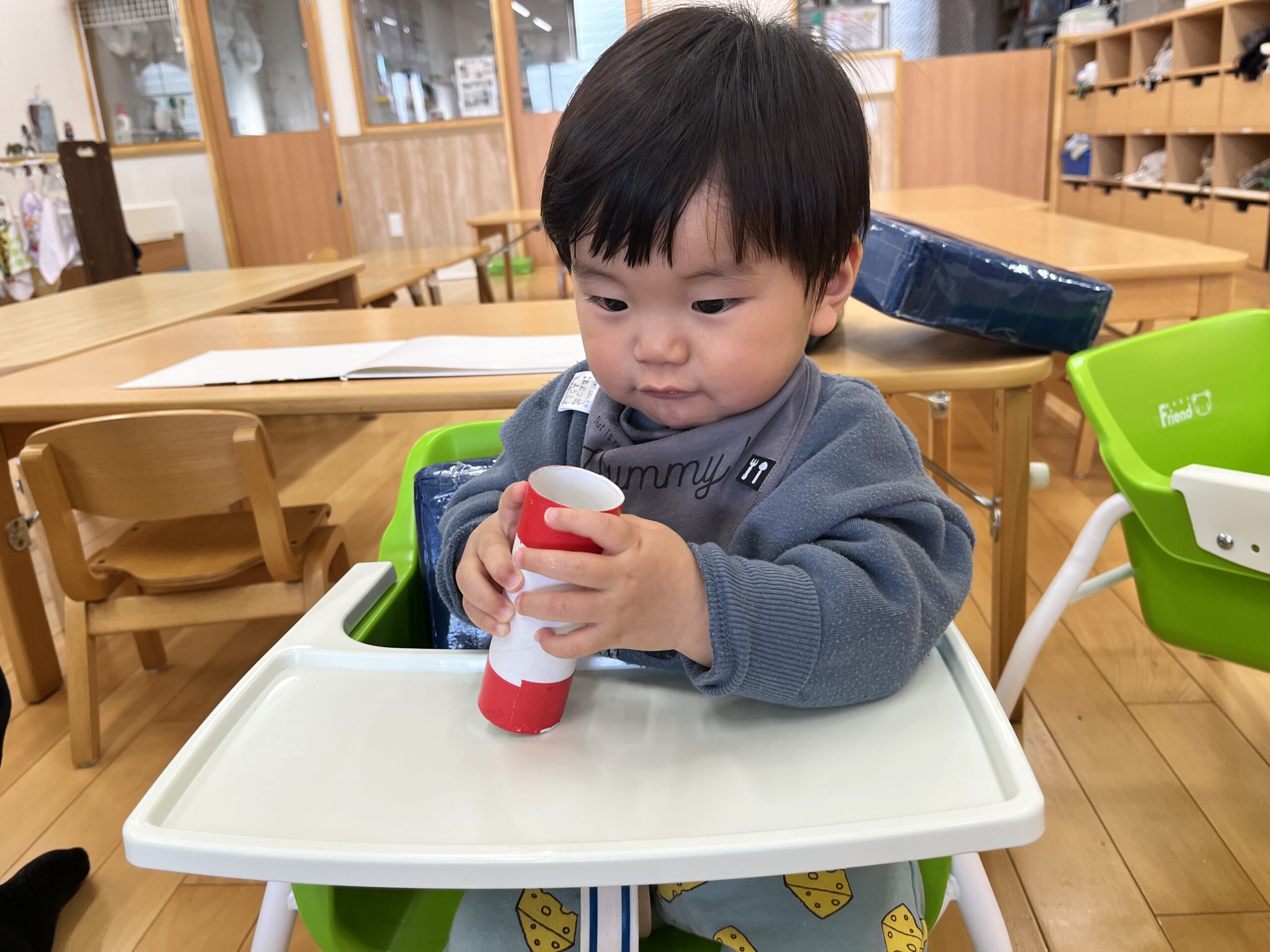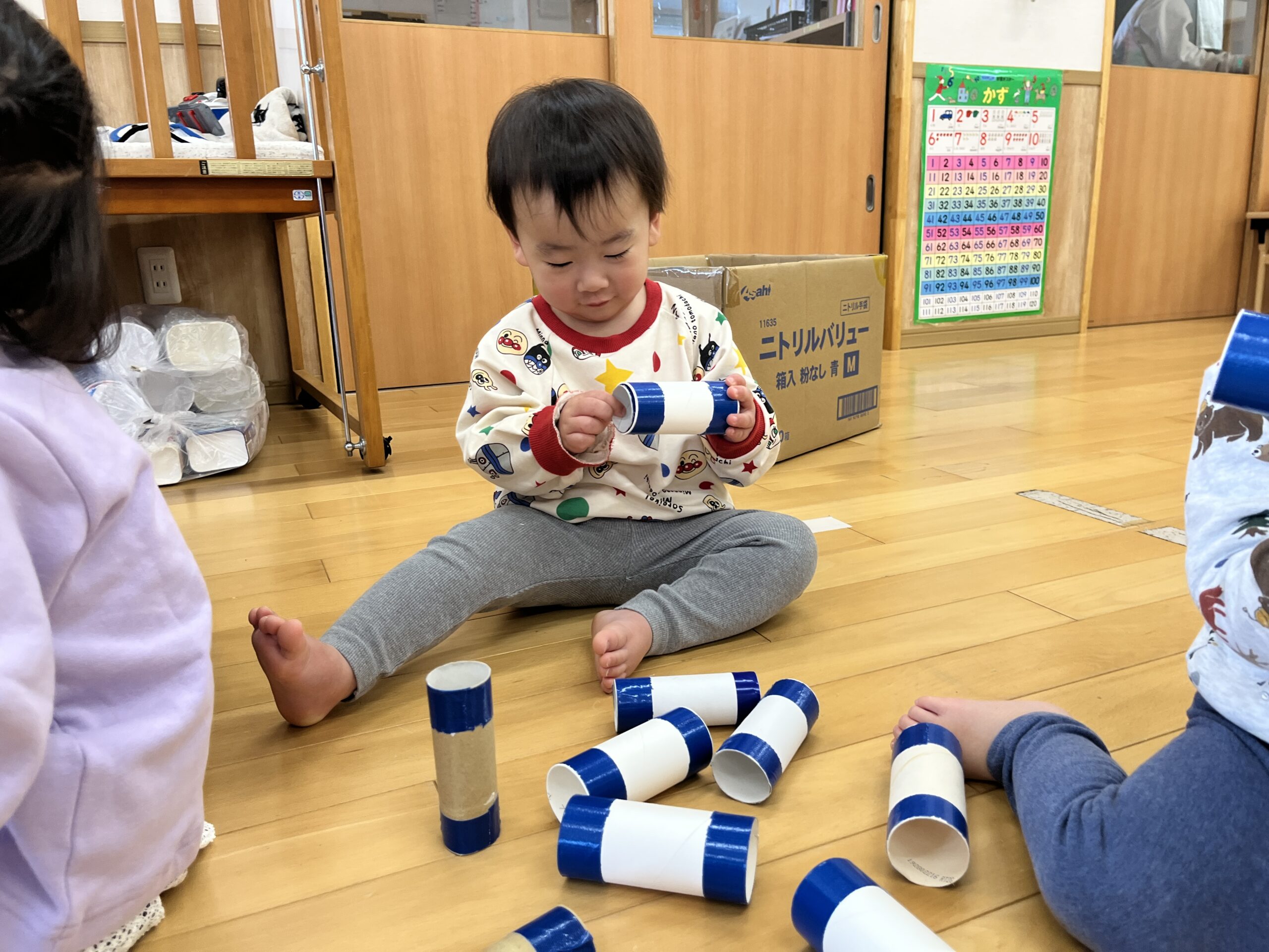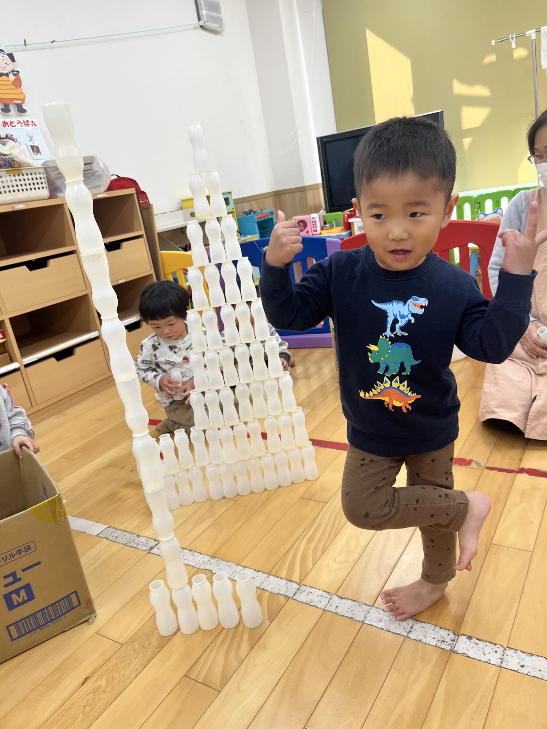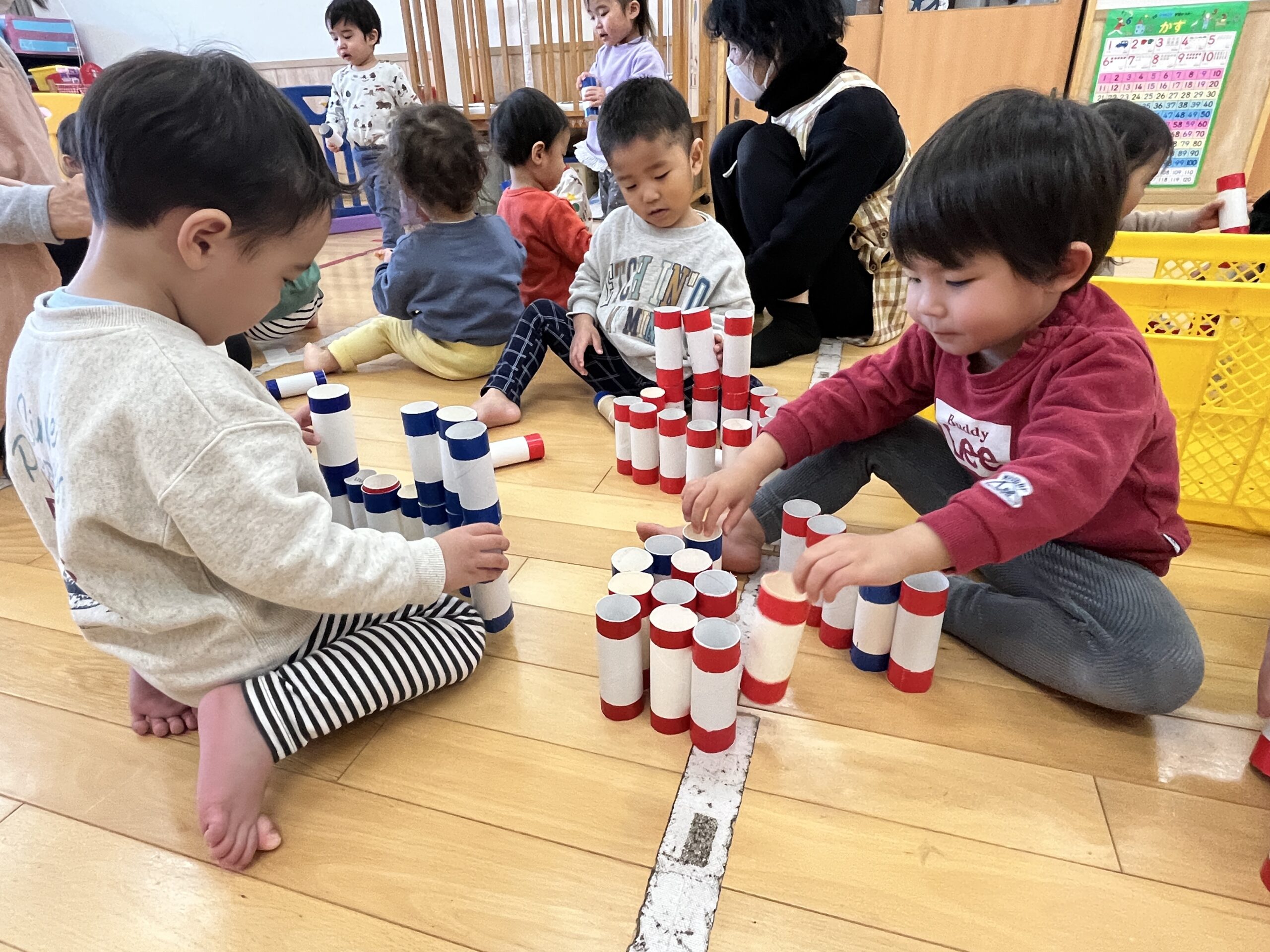 日頃から色々な素材を組み立てて遊んでいる子ども達です。今回は、ペーパー芯や容器を積み上げて遊びました。