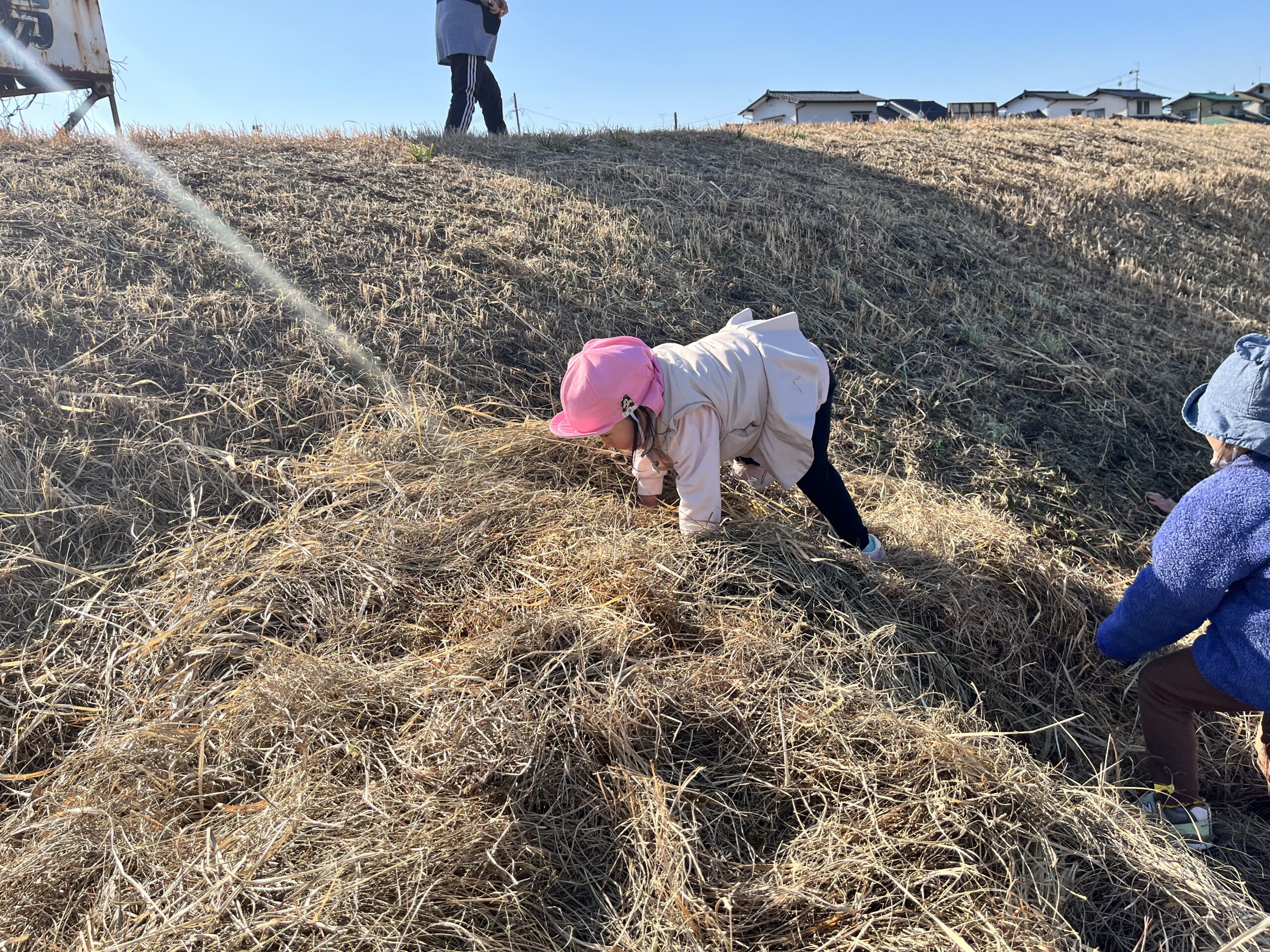ふかふかの草の山で遊んだり