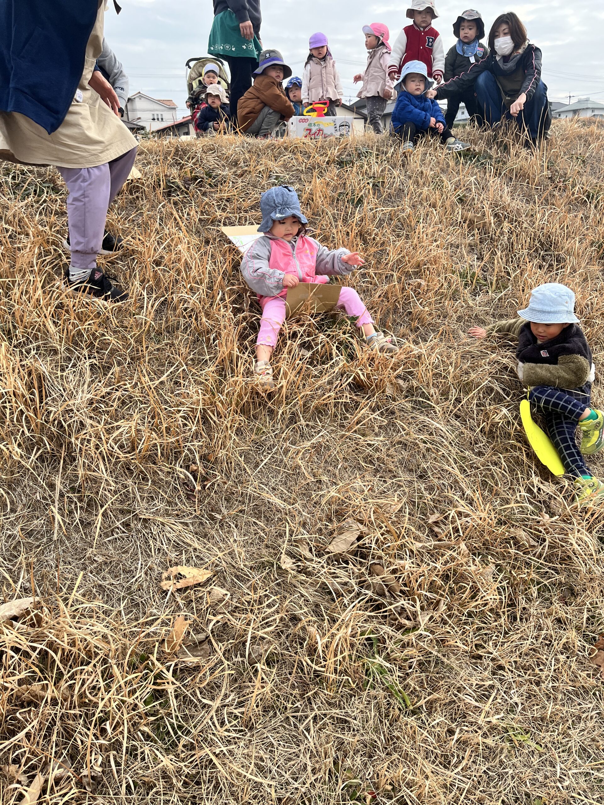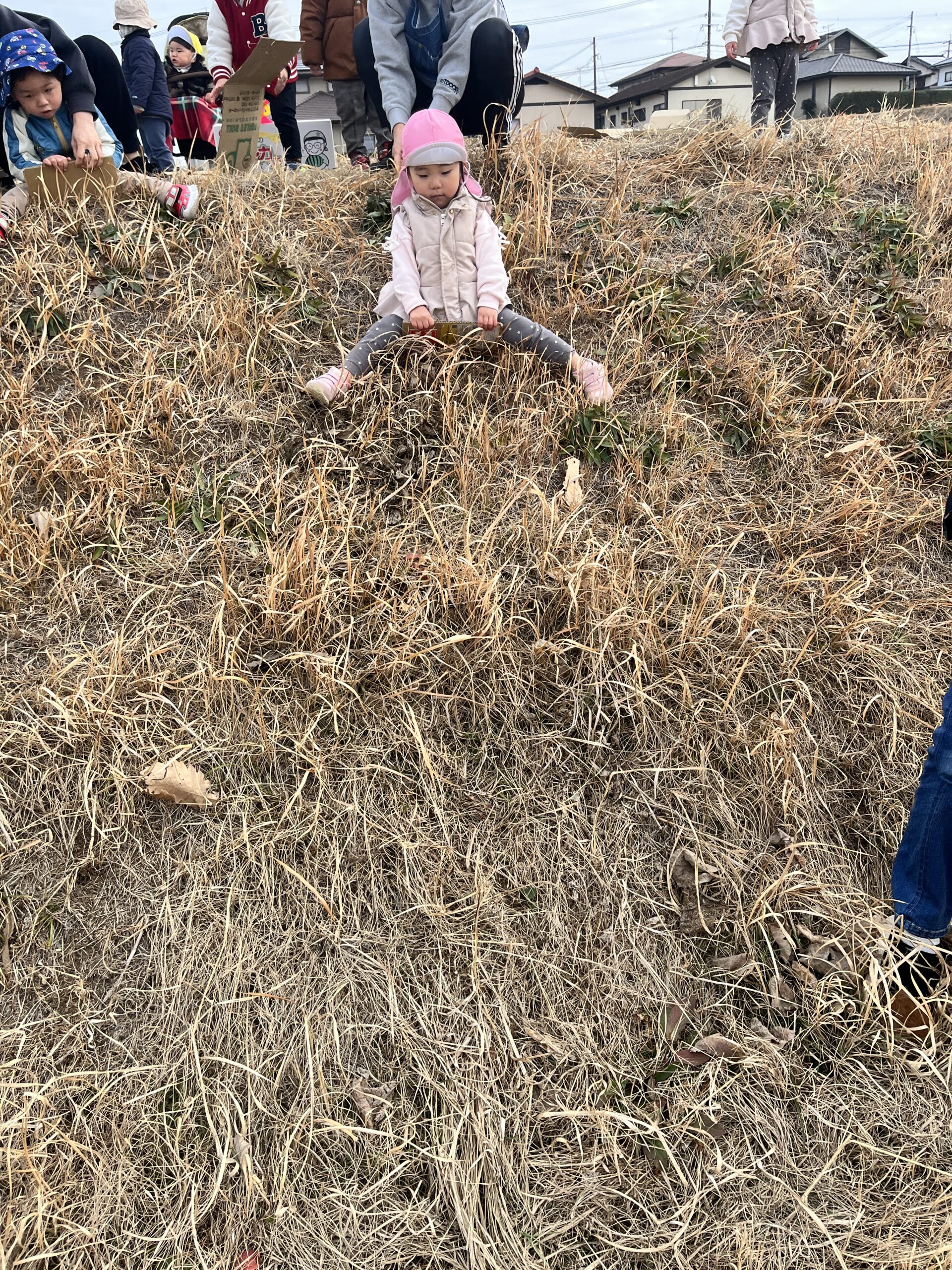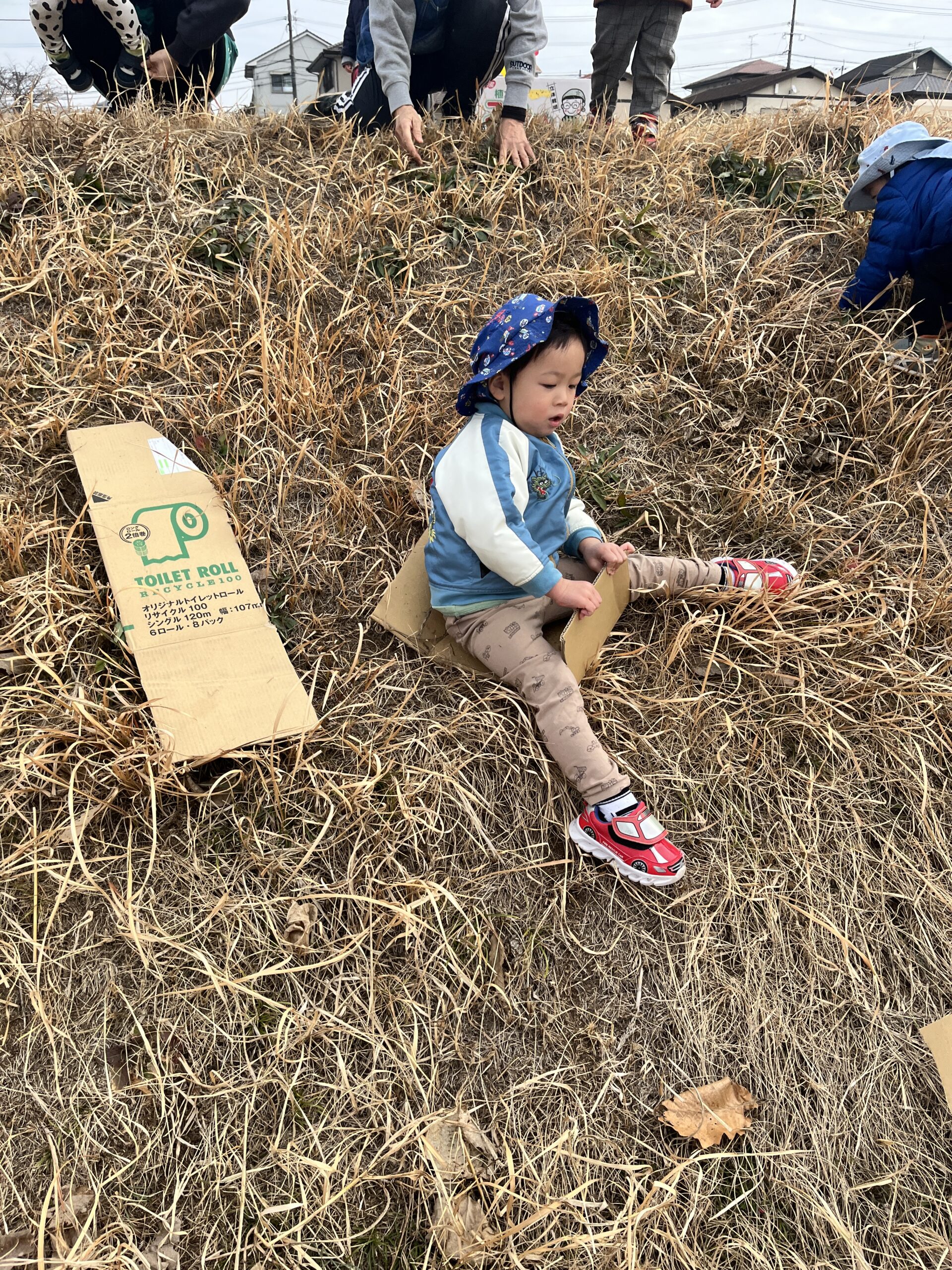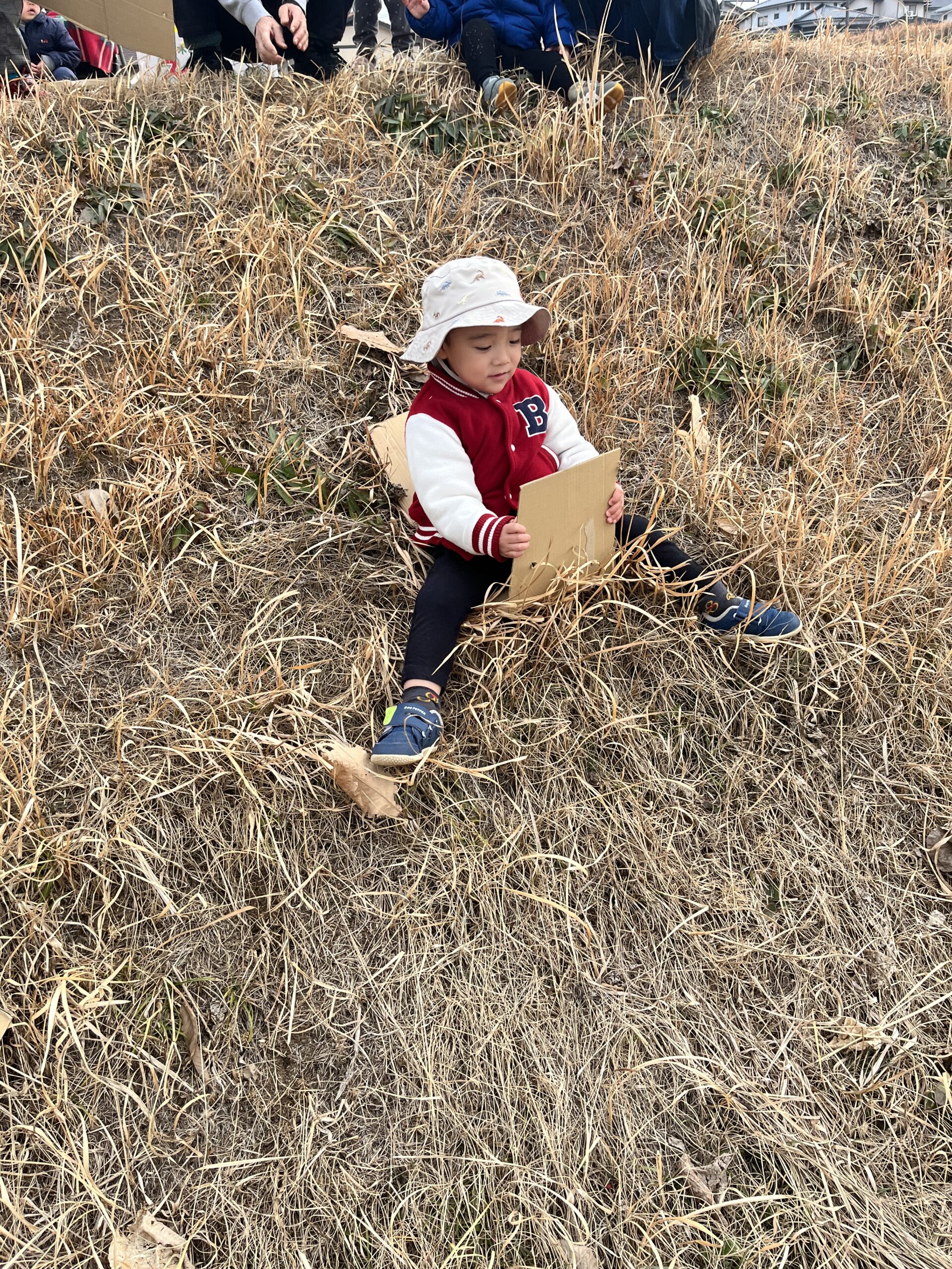 転んでもぜんぜん痛くありません(^^) 段ボール板を使って草滑りもしました🛷 先ずは先生が滑り方を見せてくれました。段ボール板にまたがり、板をしっかり持ってスタートします