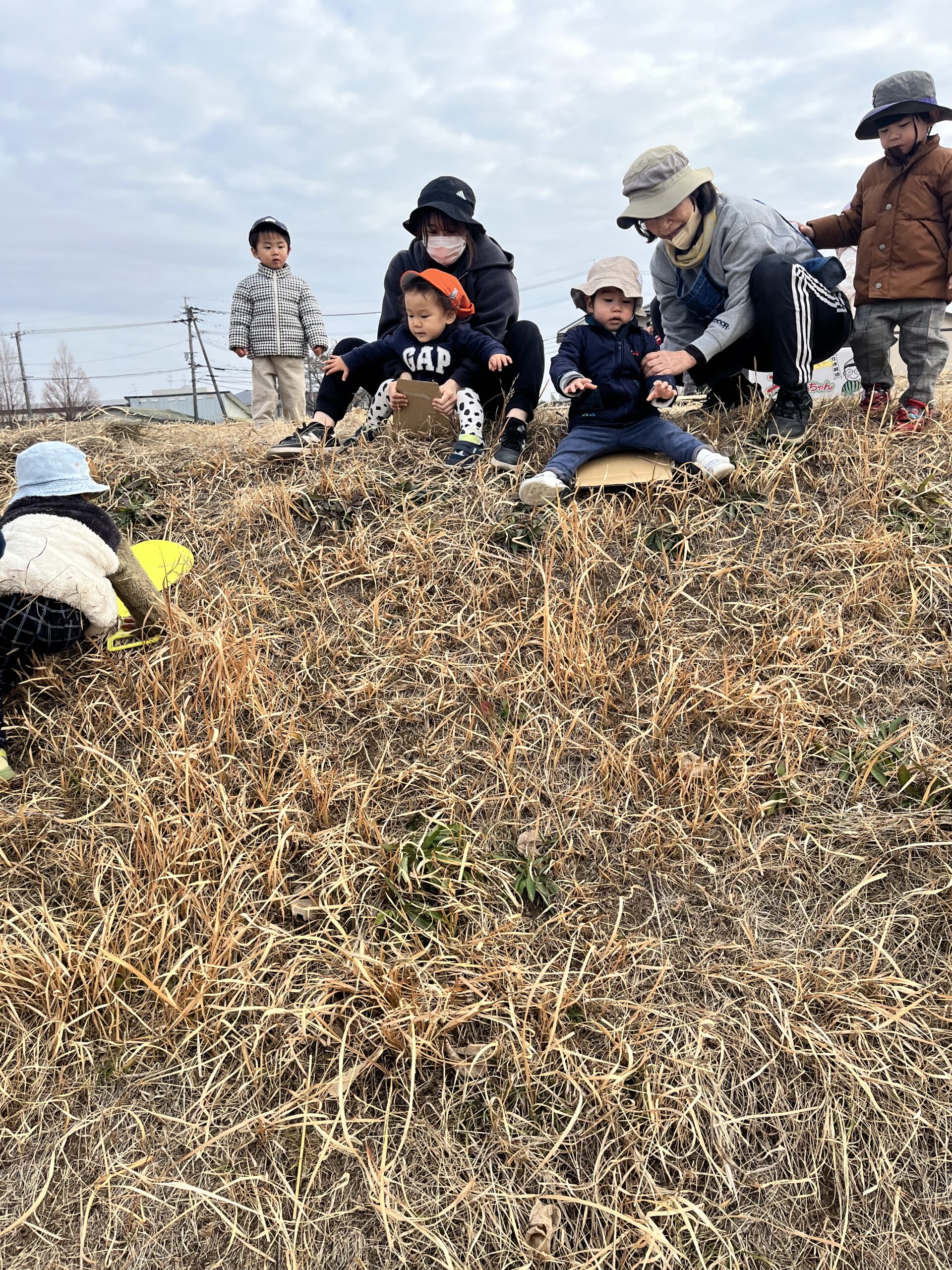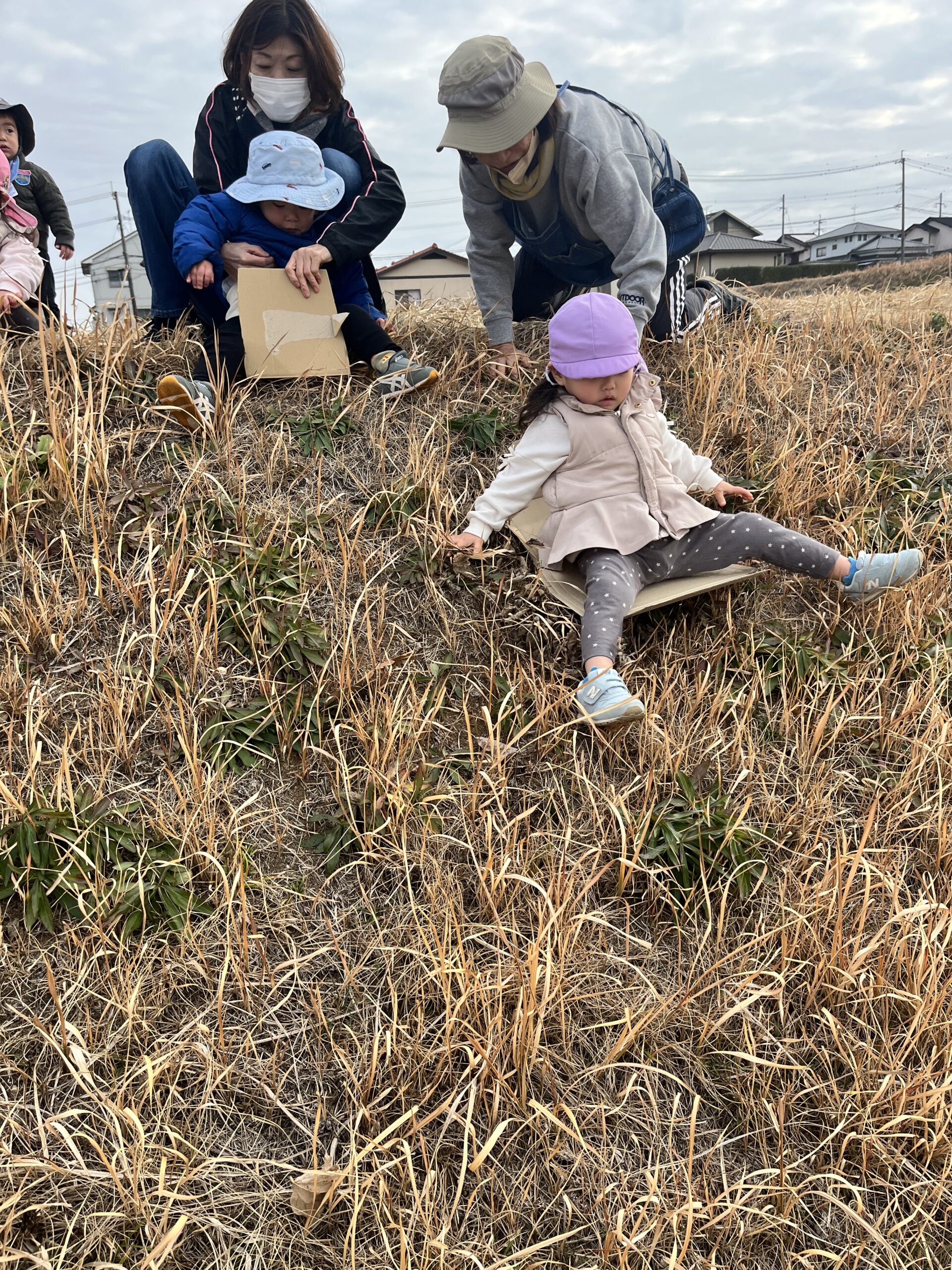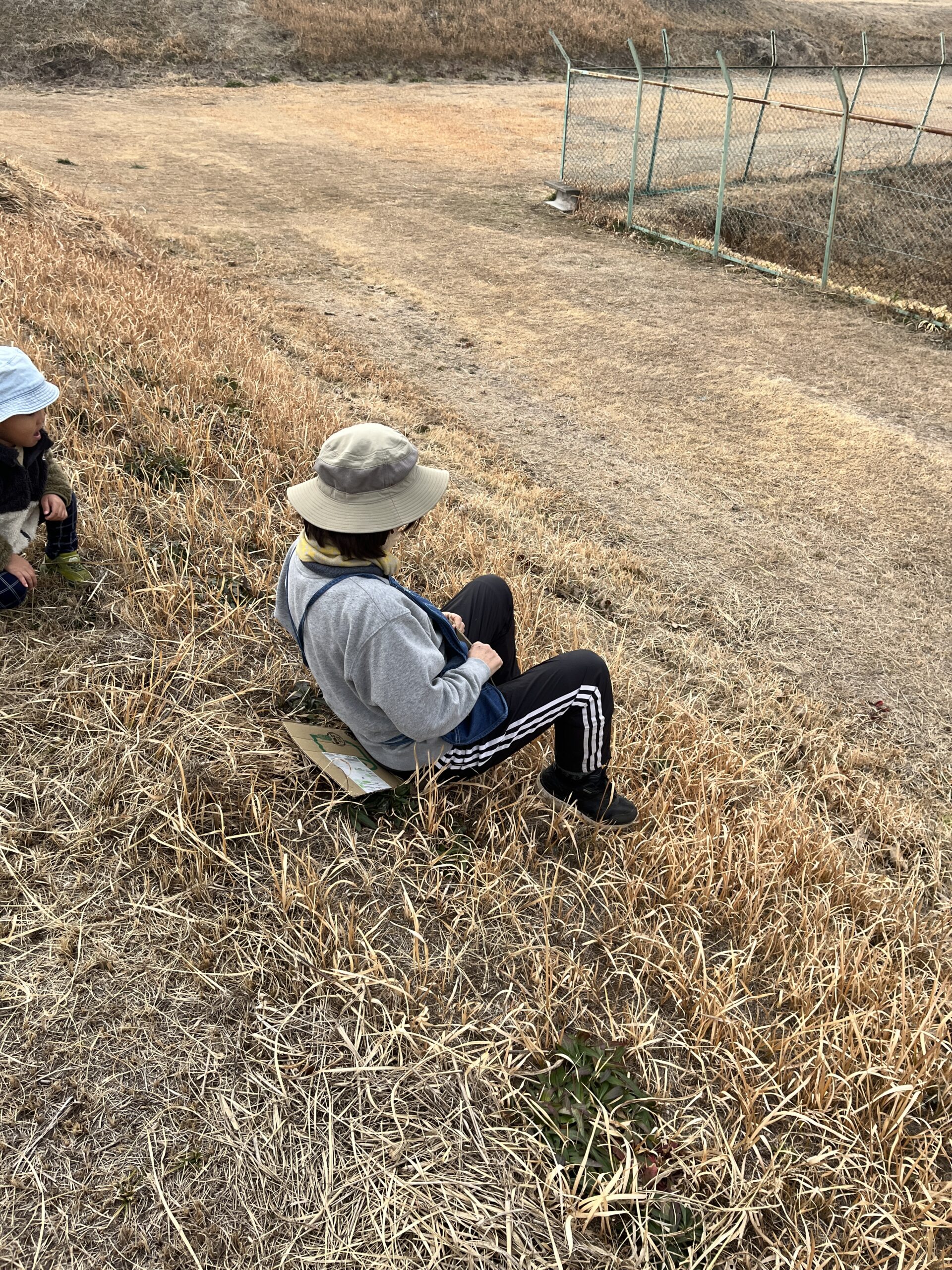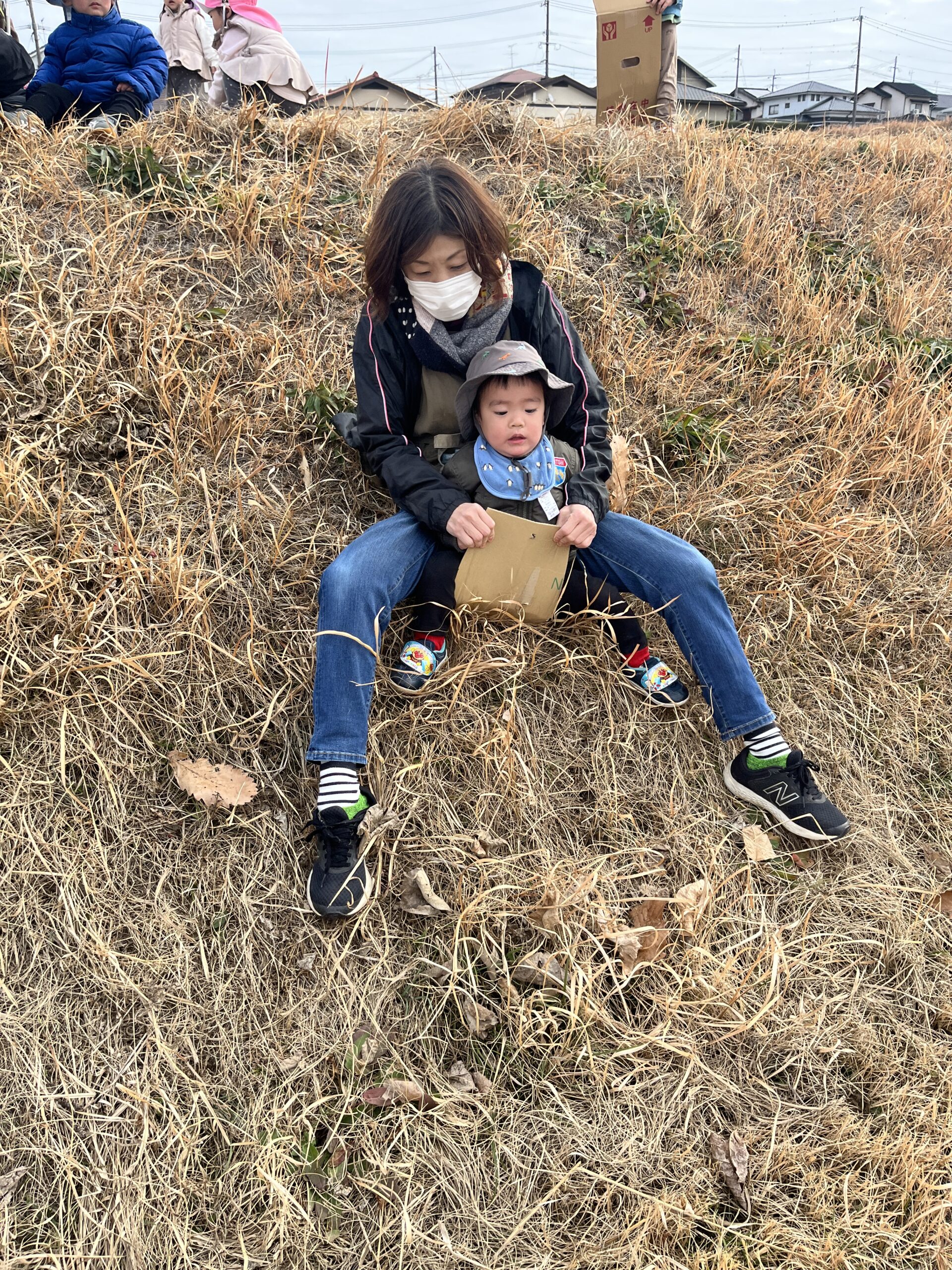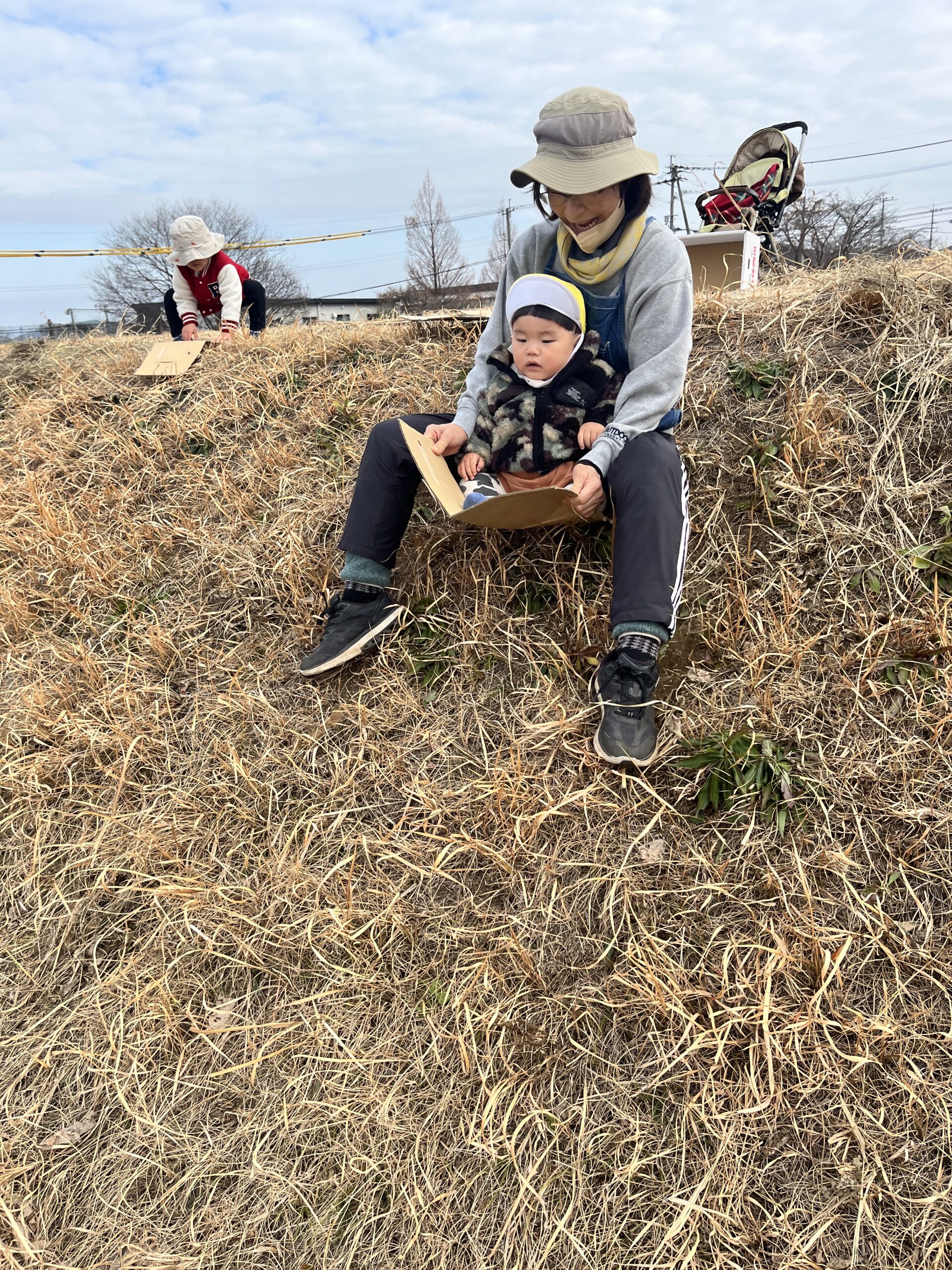 転んでもぜんぜん痛くありません(^^) 段ボール板を使って草滑りもしました🛷 先ずは先生が滑り方を見せてくれました。段ボール板にまたがり、板をしっかり持ってスタートします