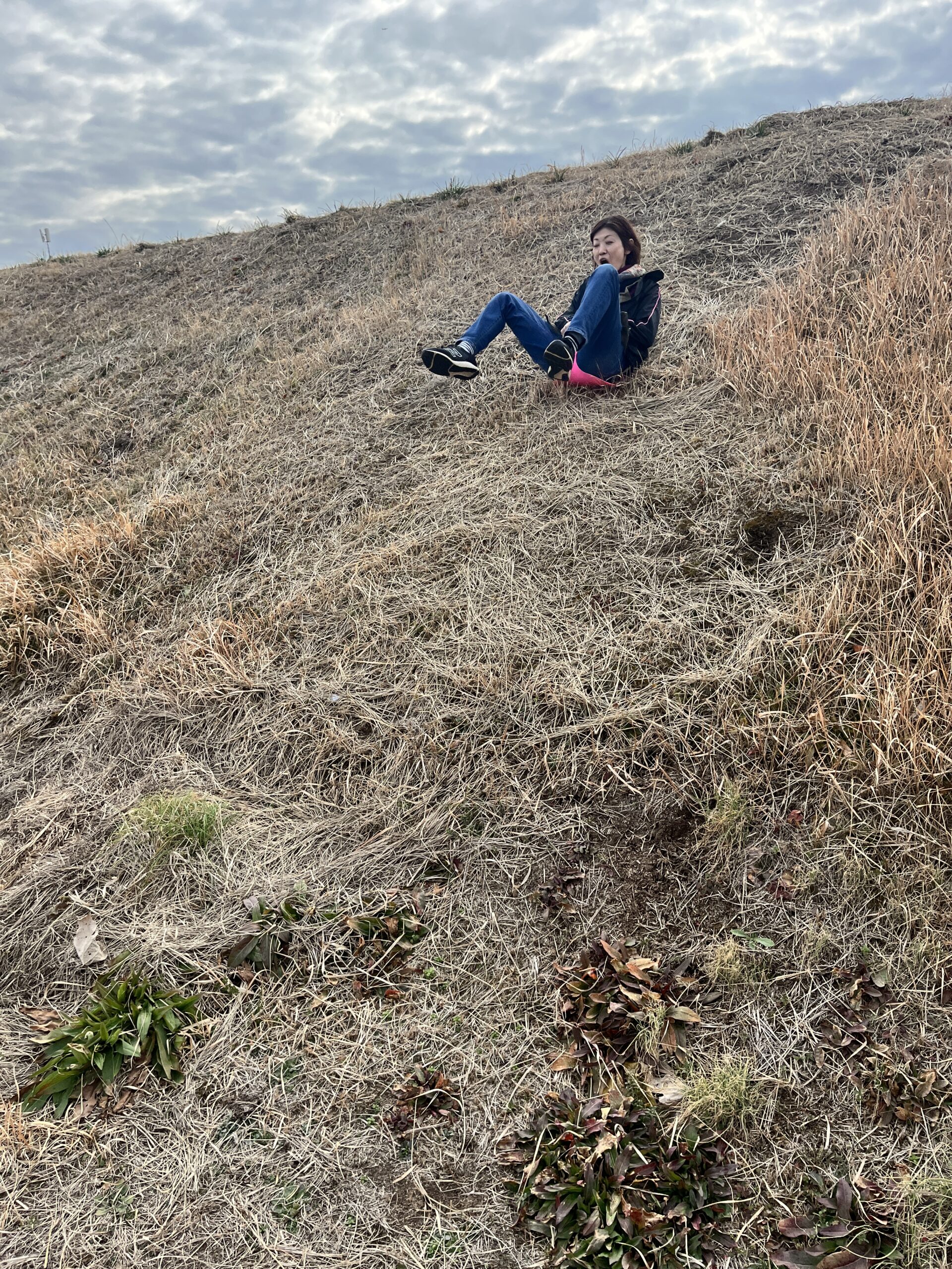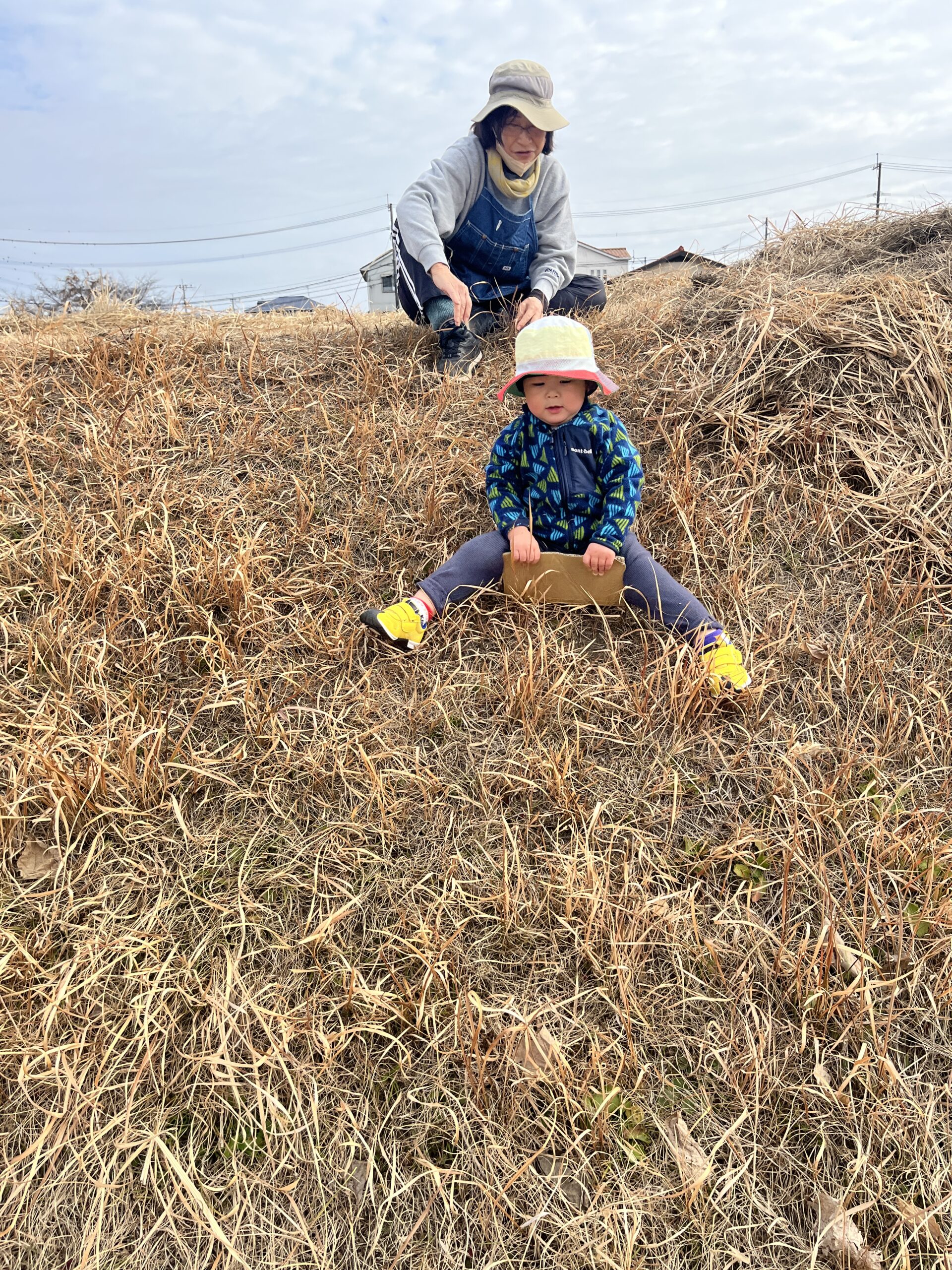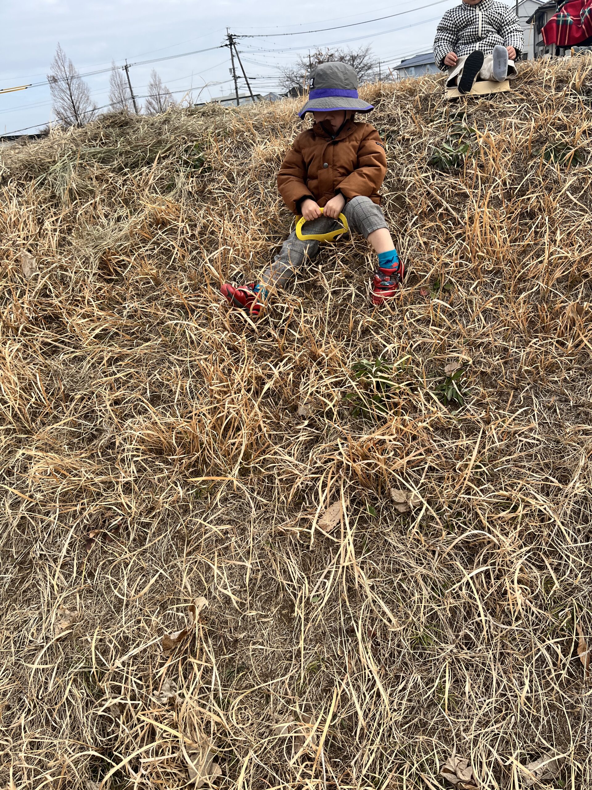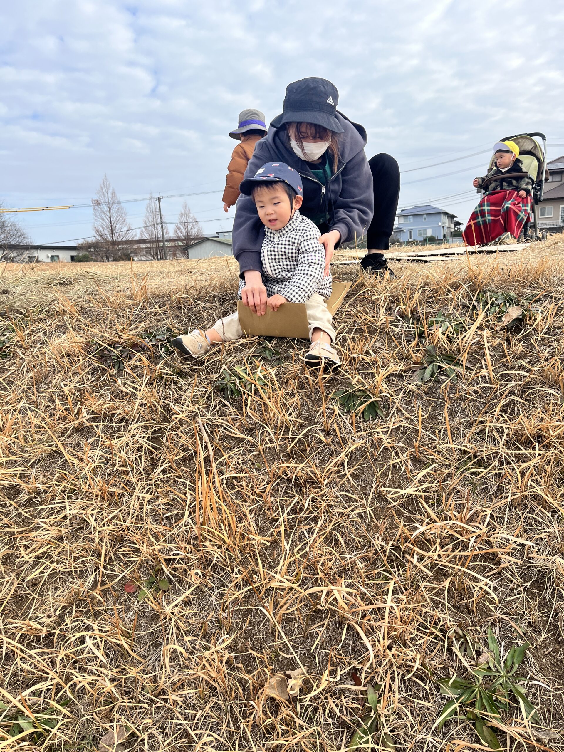 転んでもぜんぜん痛くありません(^^) 段ボール板を使って草滑りもしました🛷 先ずは先生が滑り方を見せてくれました。段ボール板にまたがり、板をしっかり持ってスタートします