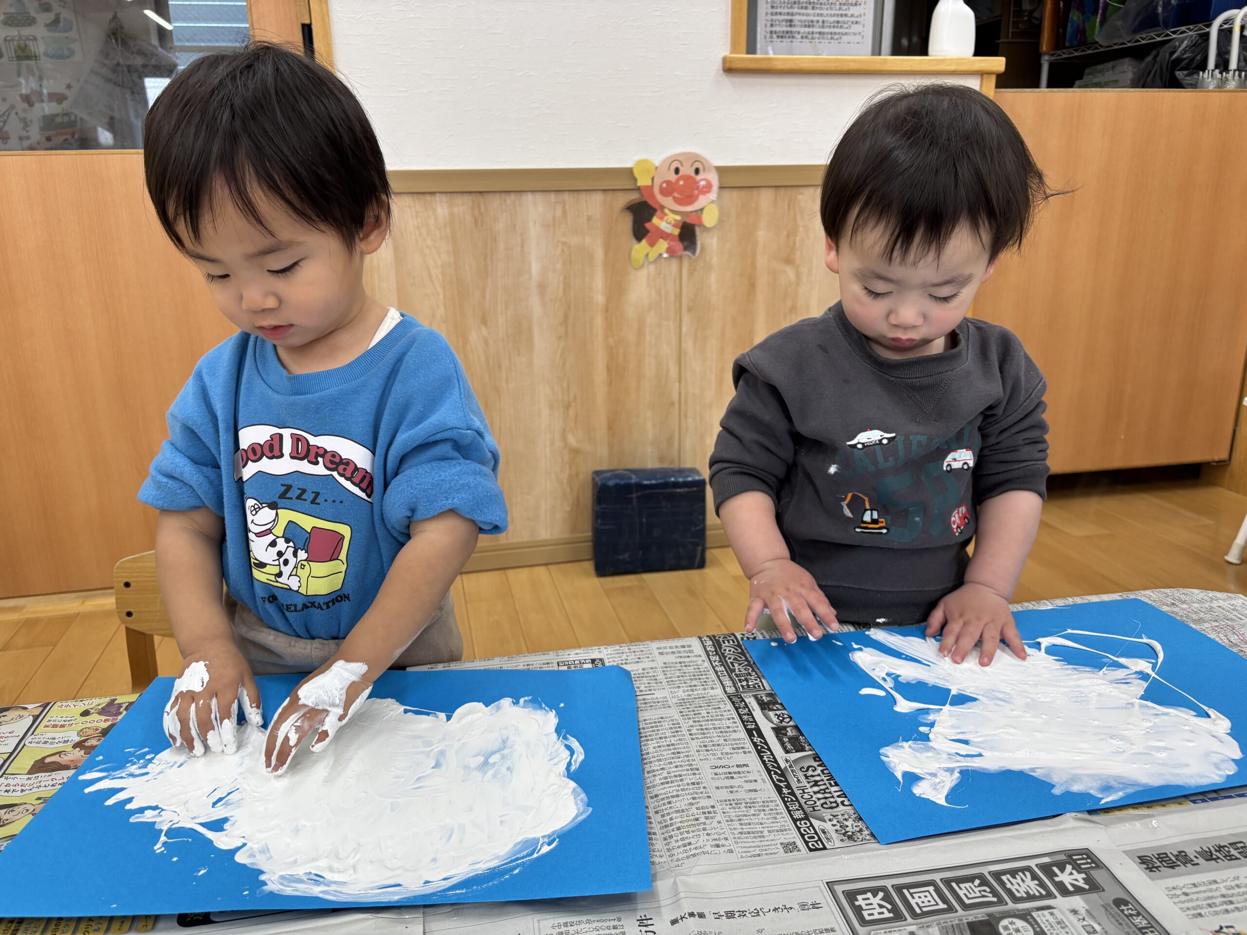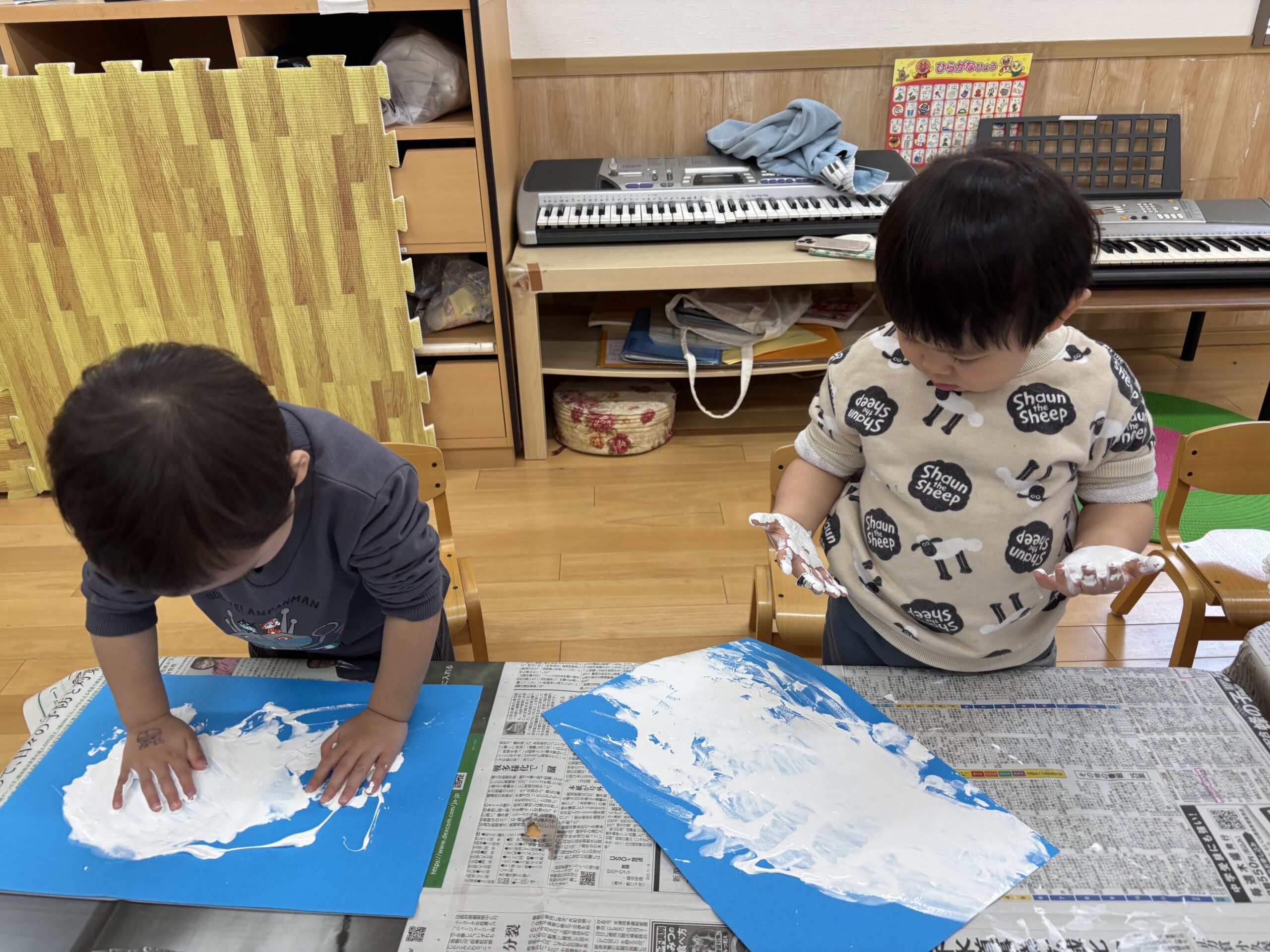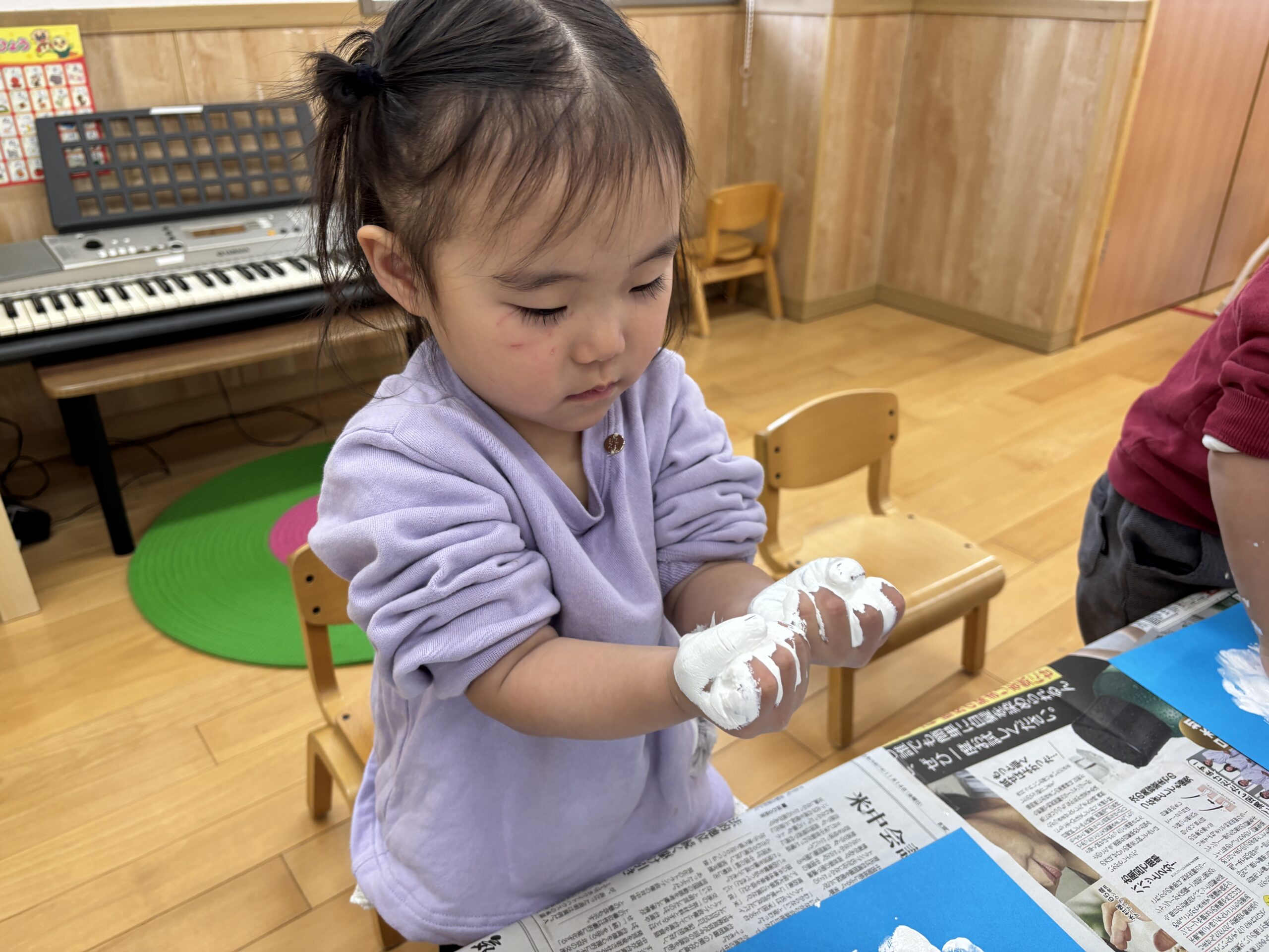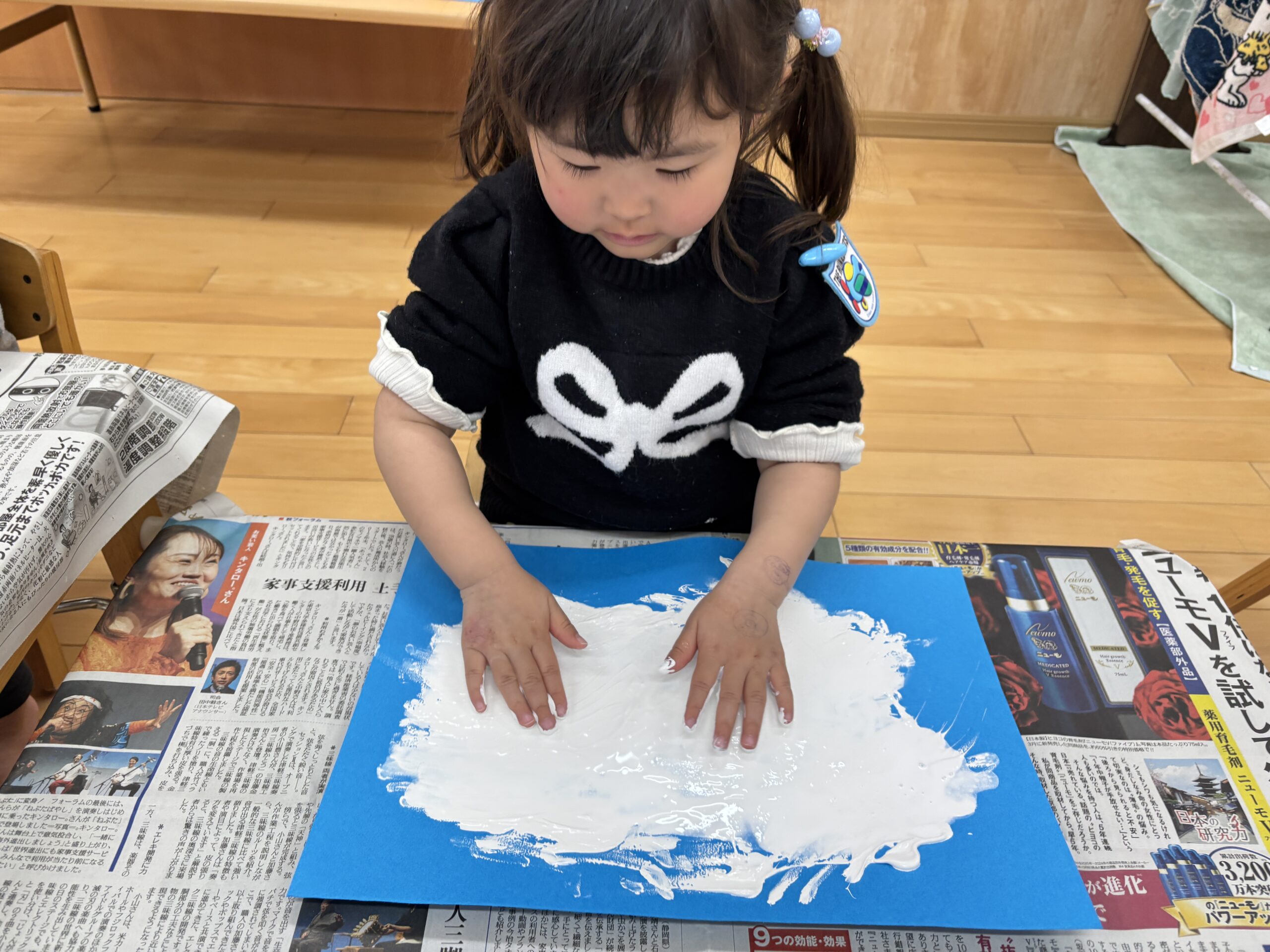 熊本にも雪が降った日。子どもたちは「雪合戦して遊んだよ」「雪だるま作ったよ」などいろいろ教えてくれました。じゃあ保育園でも雪遊びしよう!でもね、、、もう溶けていました😭じゃあ、絵の具で雪遊びごっこしよう!そうしよう!雪と同じ白い絵具を指先を使って広げていきましょう