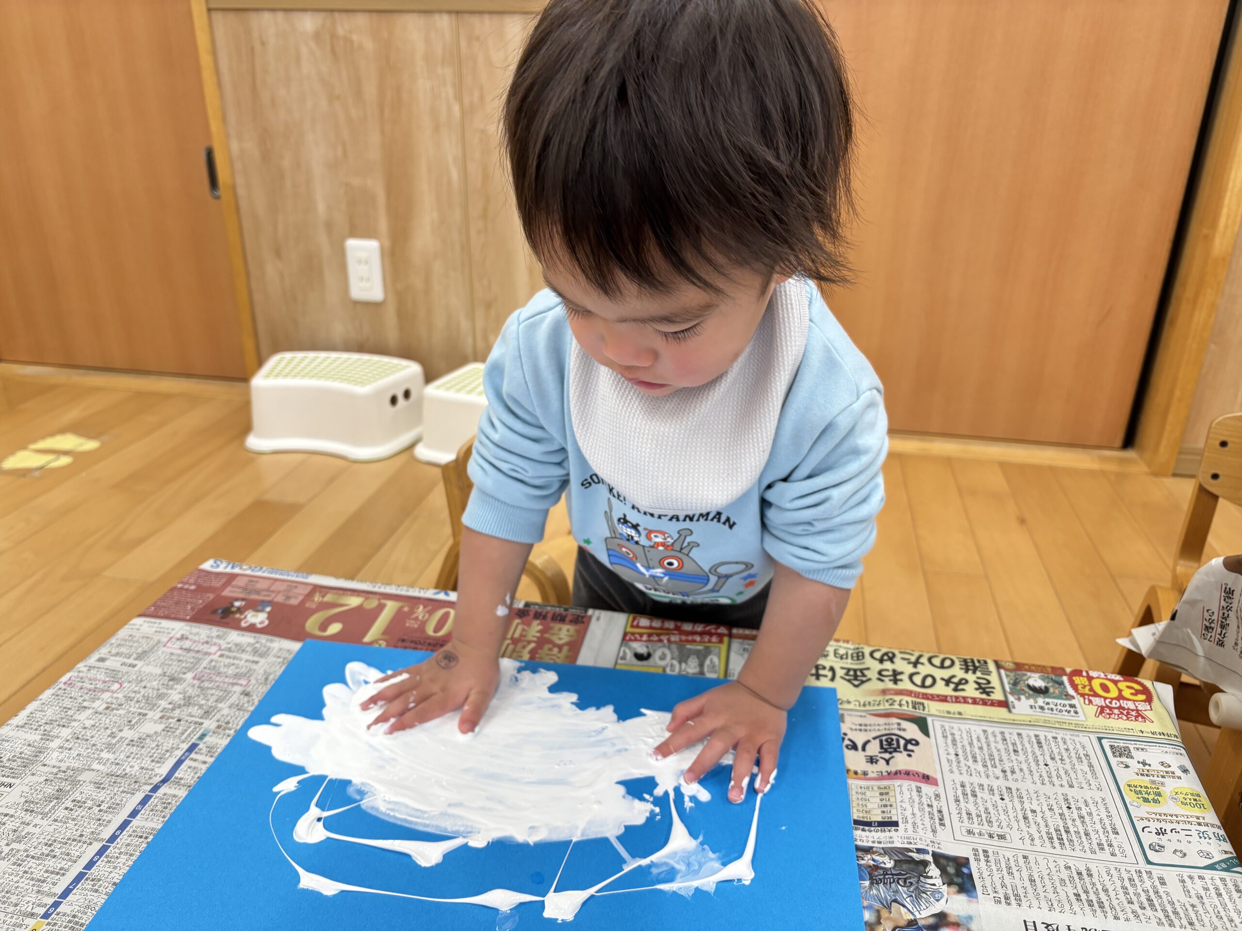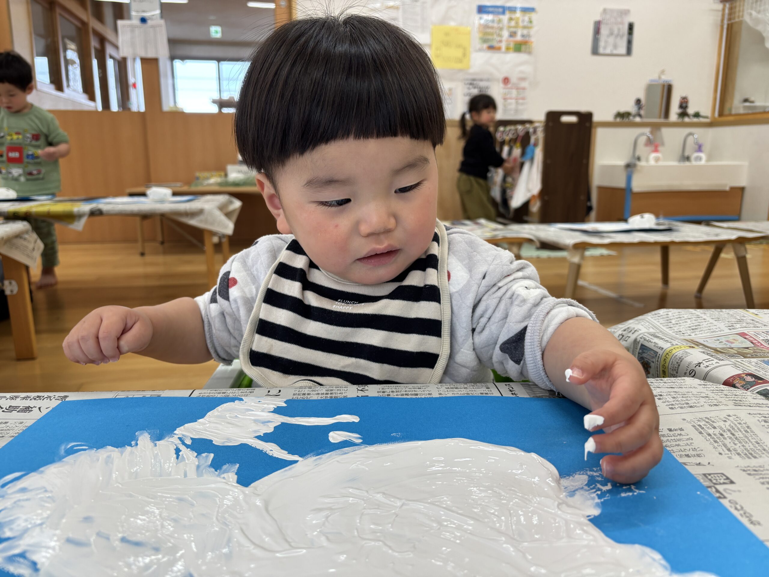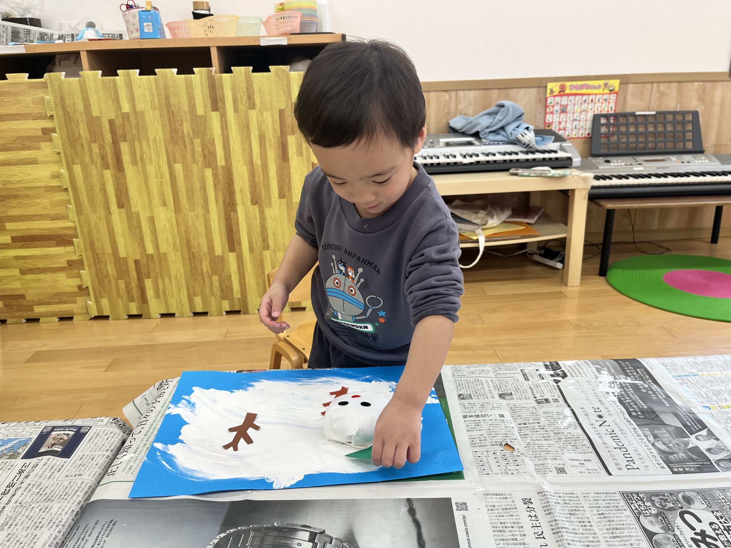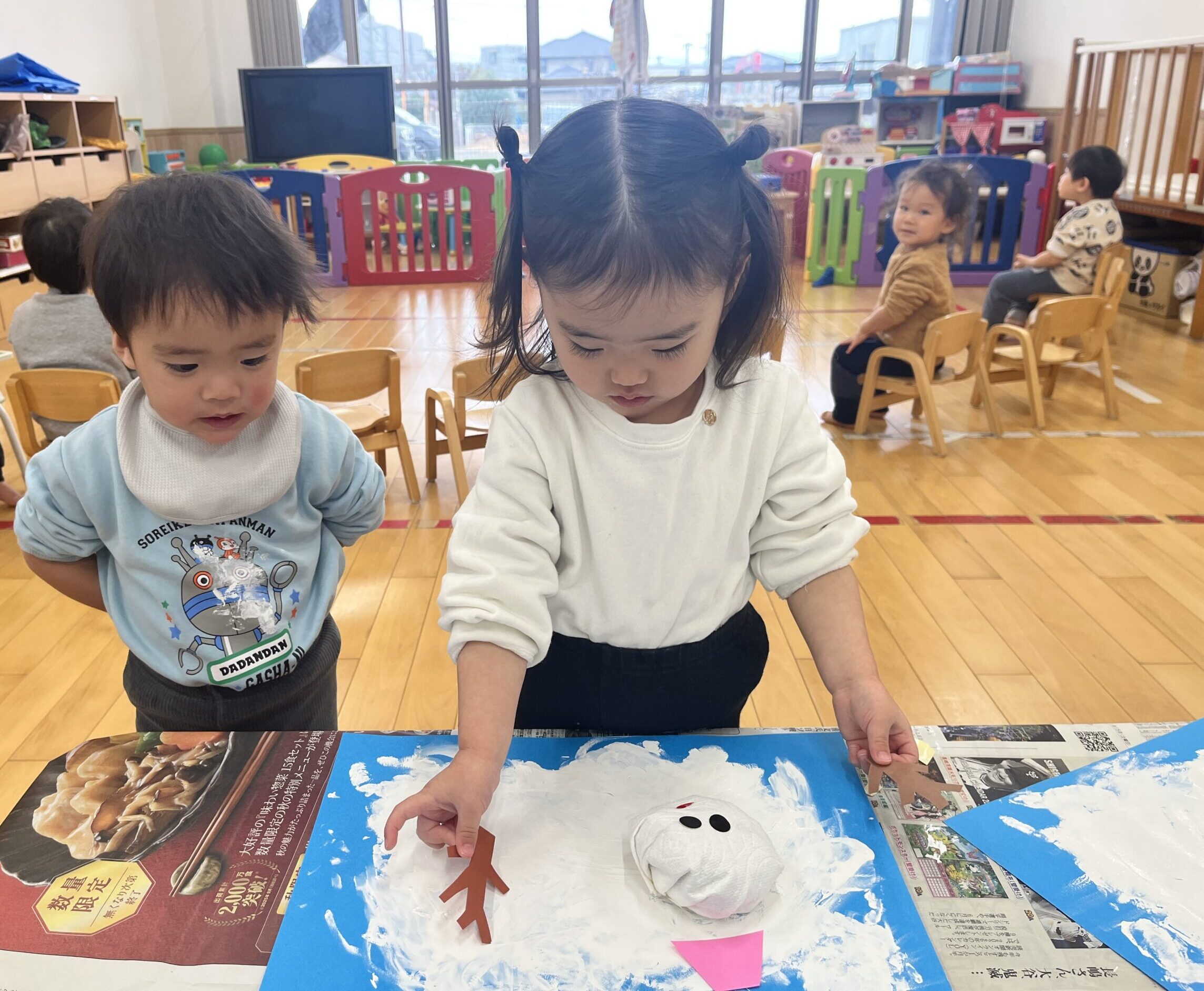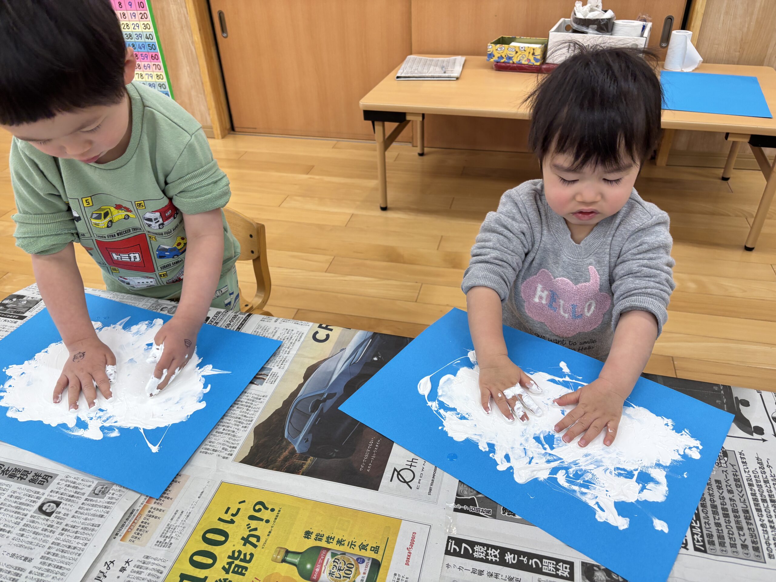 熊本にも雪が降った日。子どもたちは「雪合戦して遊んだよ」「雪だるま作ったよ」などいろいろ教えてくれました。じゃあ保育園でも雪遊びしよう!でもね、、、もう溶けていました😭じゃあ、絵の具で雪遊びごっこしよう!そうしよう!雪と同じ白い絵具を指先を使って広げていきましょう