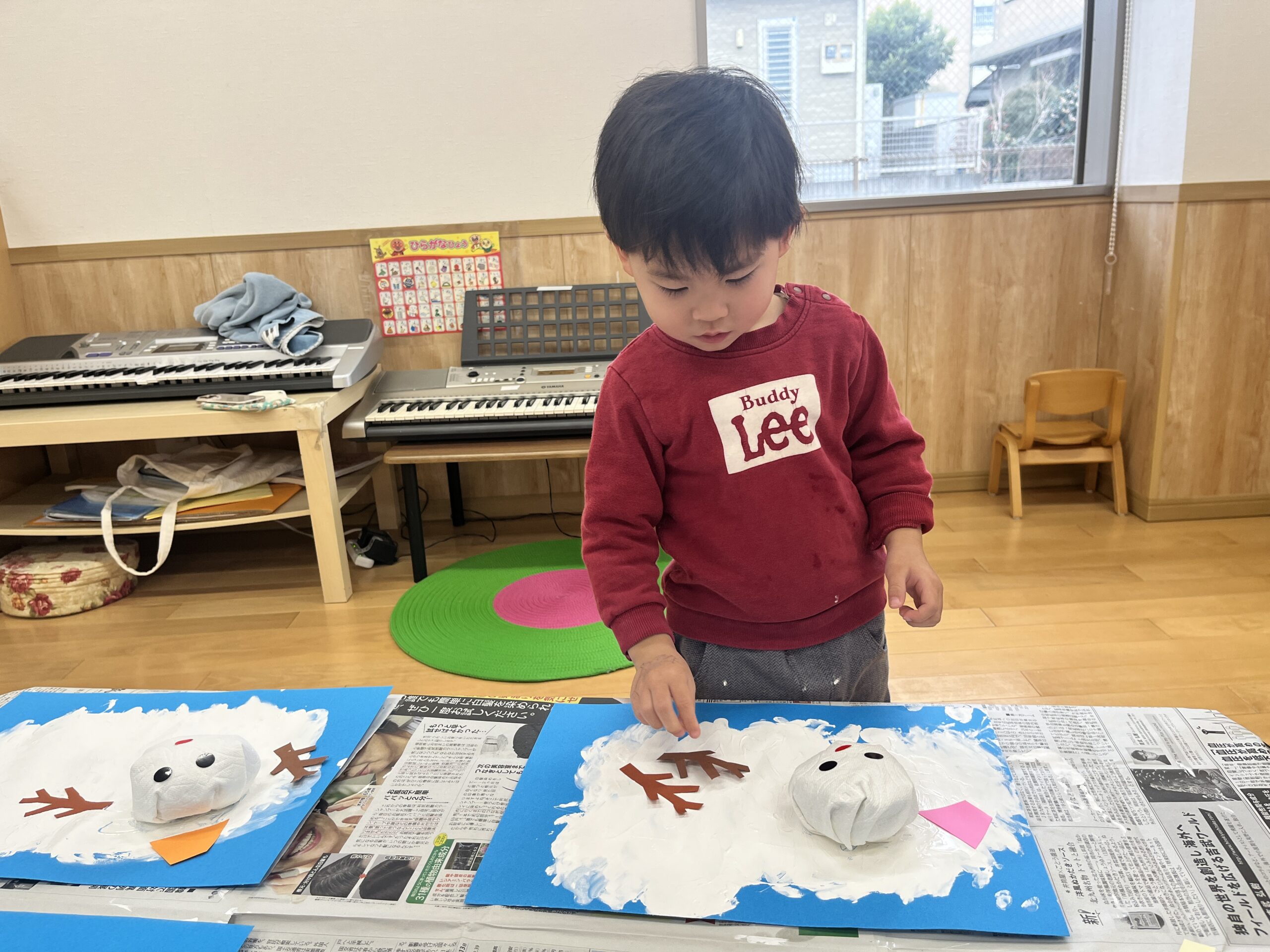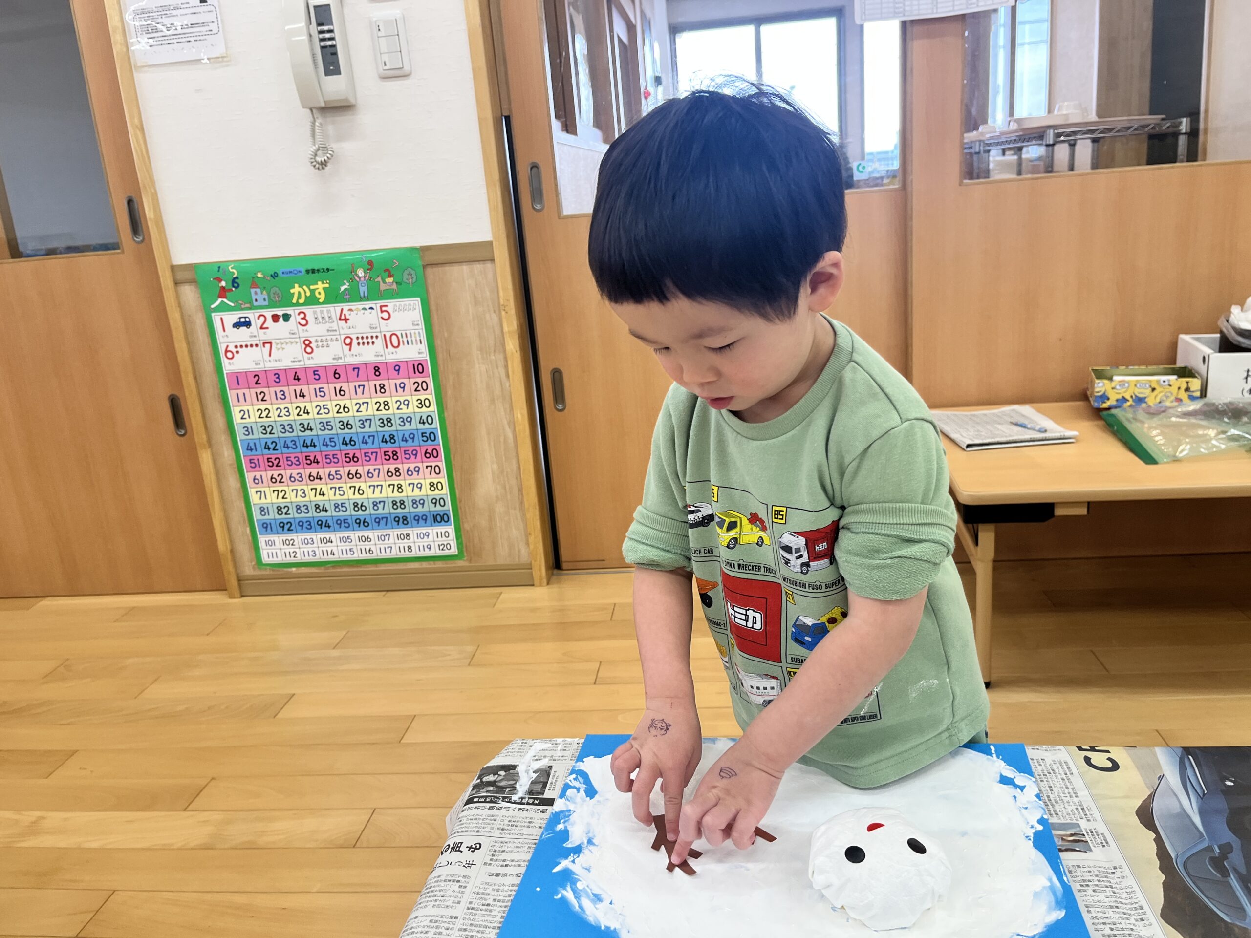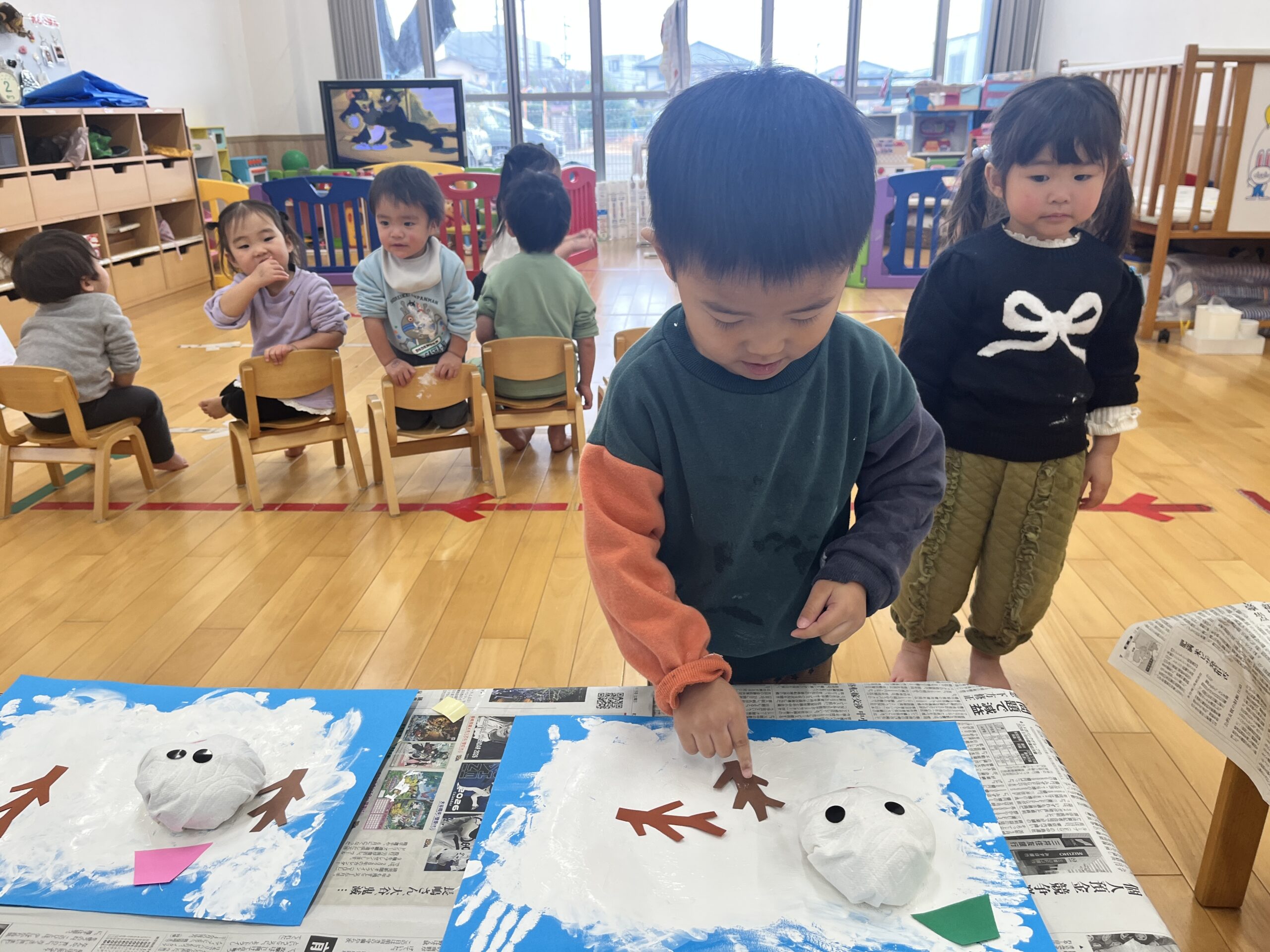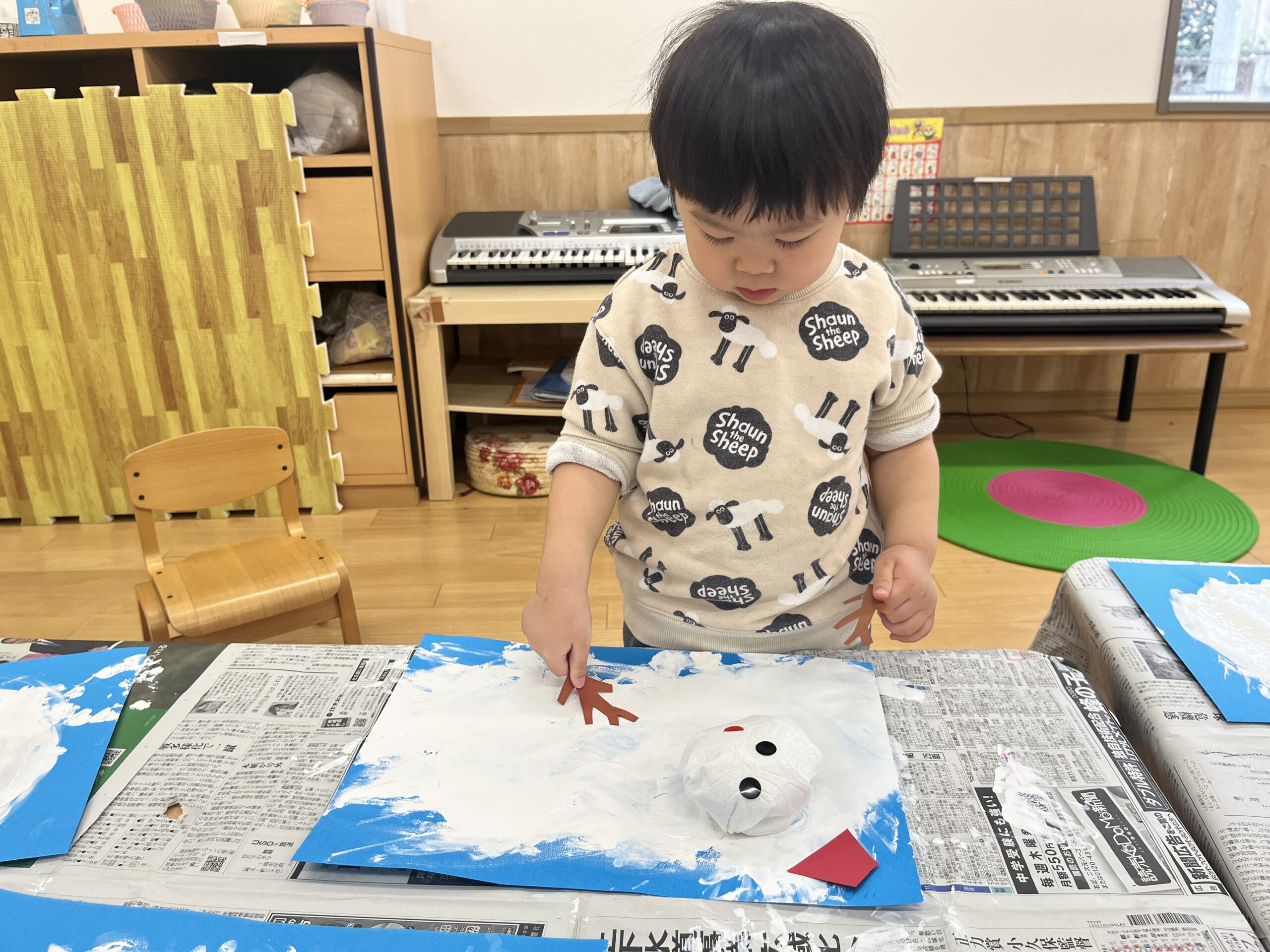 熊本にも雪が降った日。子どもたちは「雪合戦して遊んだよ」「雪だるま作ったよ」などいろいろ教えてくれました。じゃあ保育園でも雪遊びしよう!でもね、、、もう溶けていました😭じゃあ、絵の具で雪遊びごっこしよう!そうしよう!雪と同じ白い絵具を指先を使って広げていきましょう