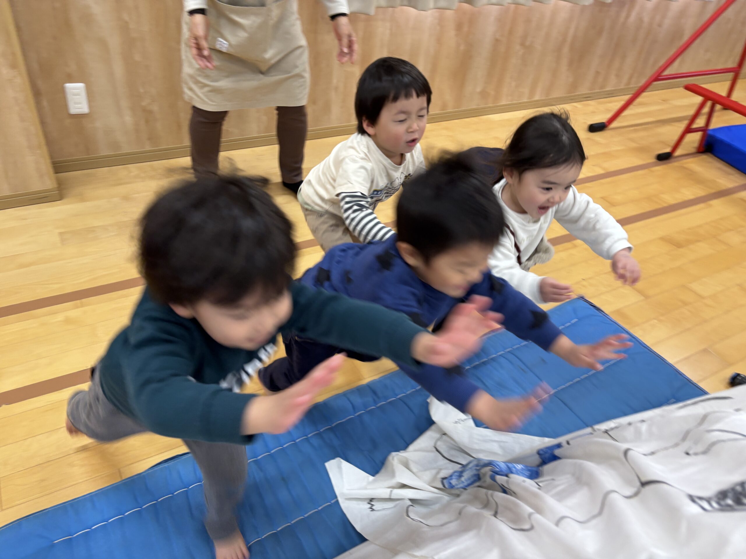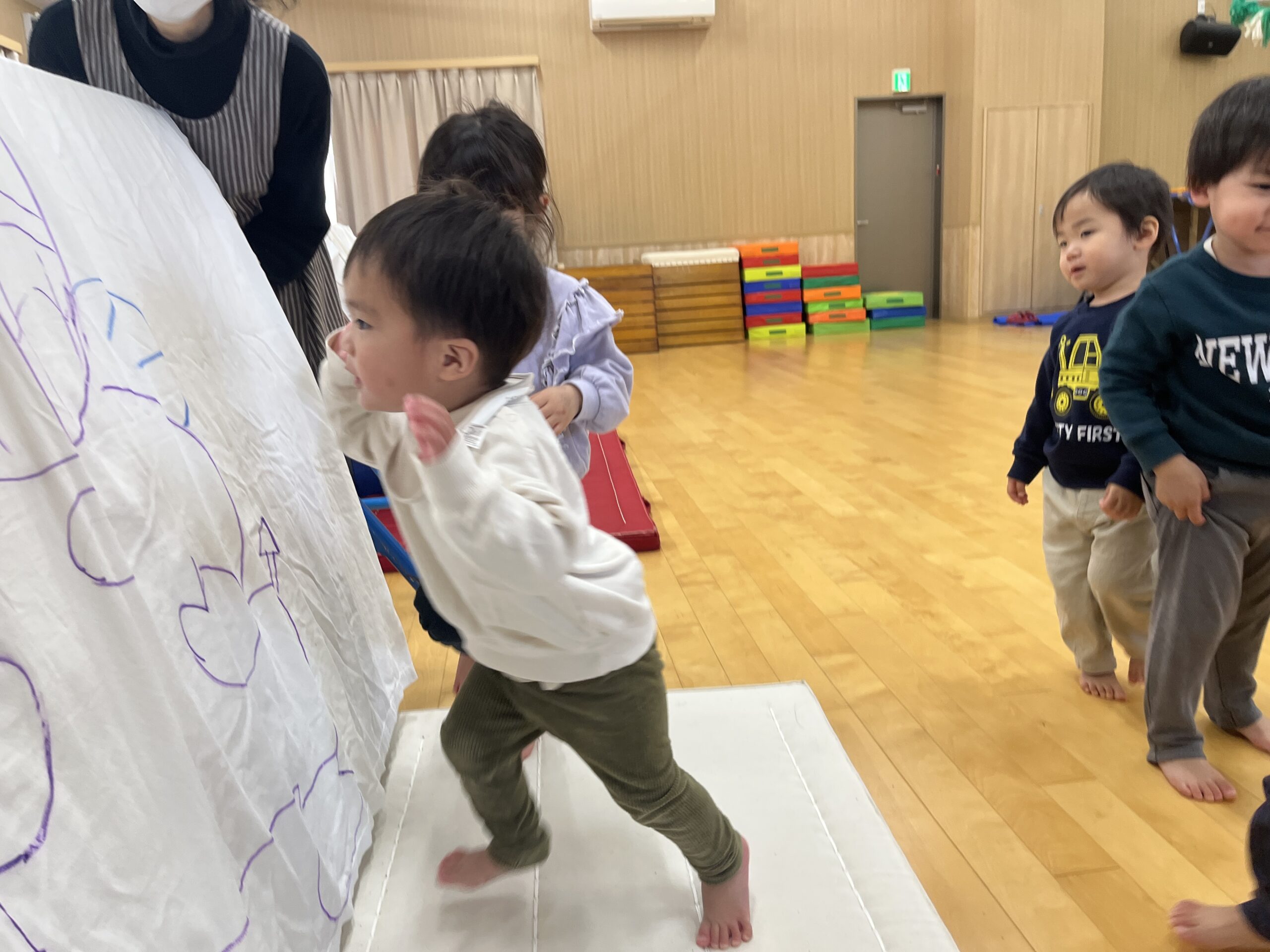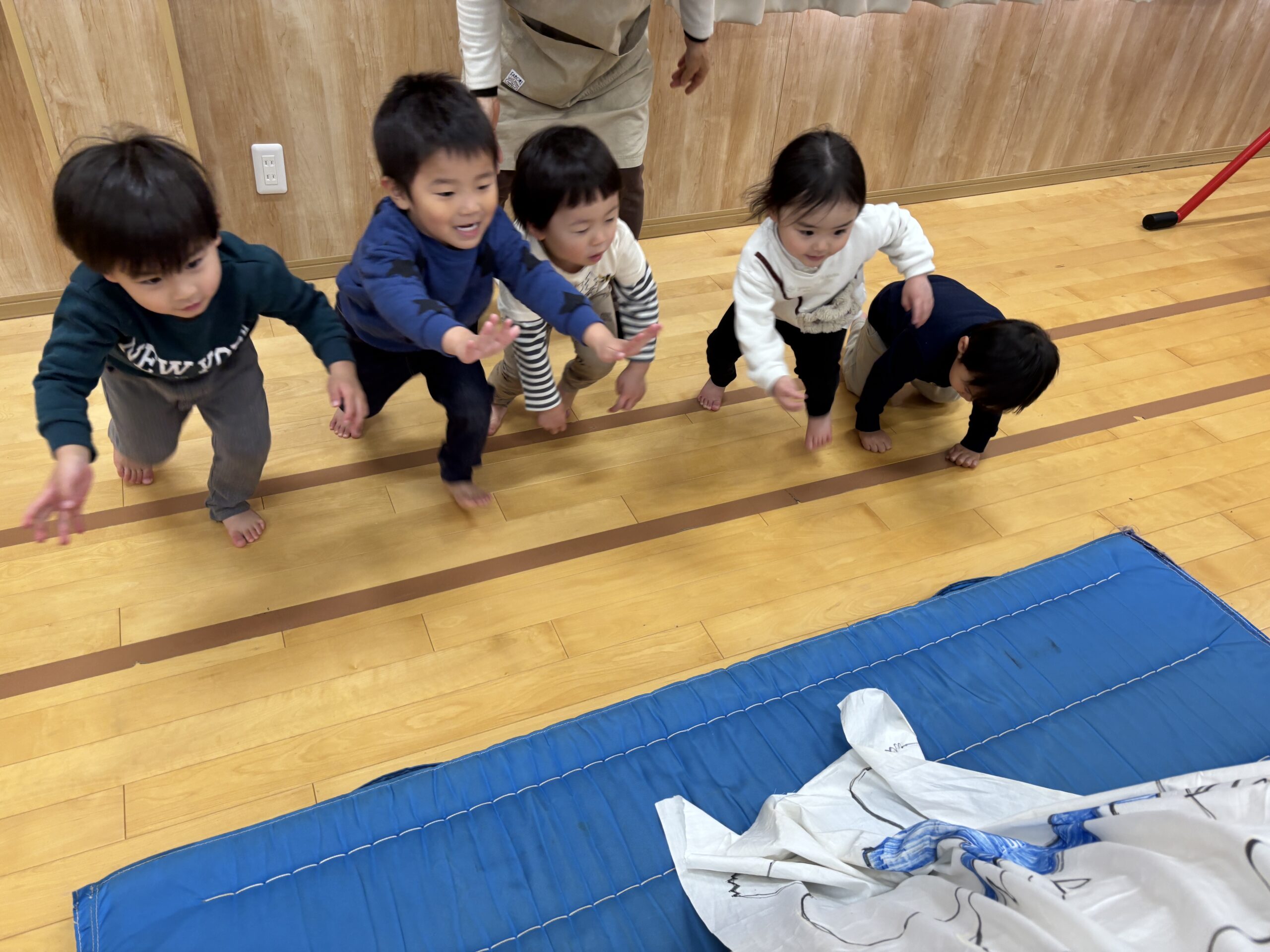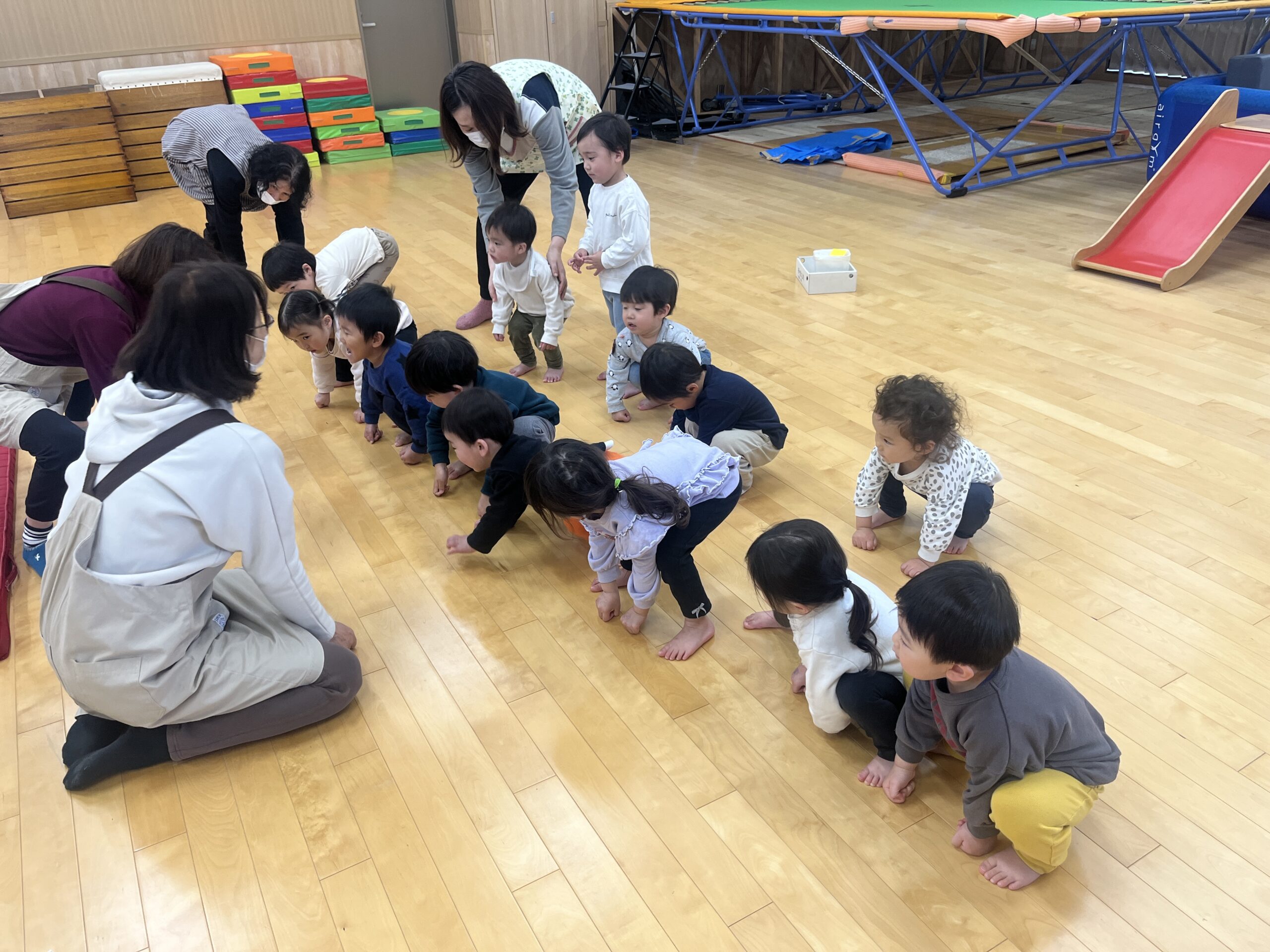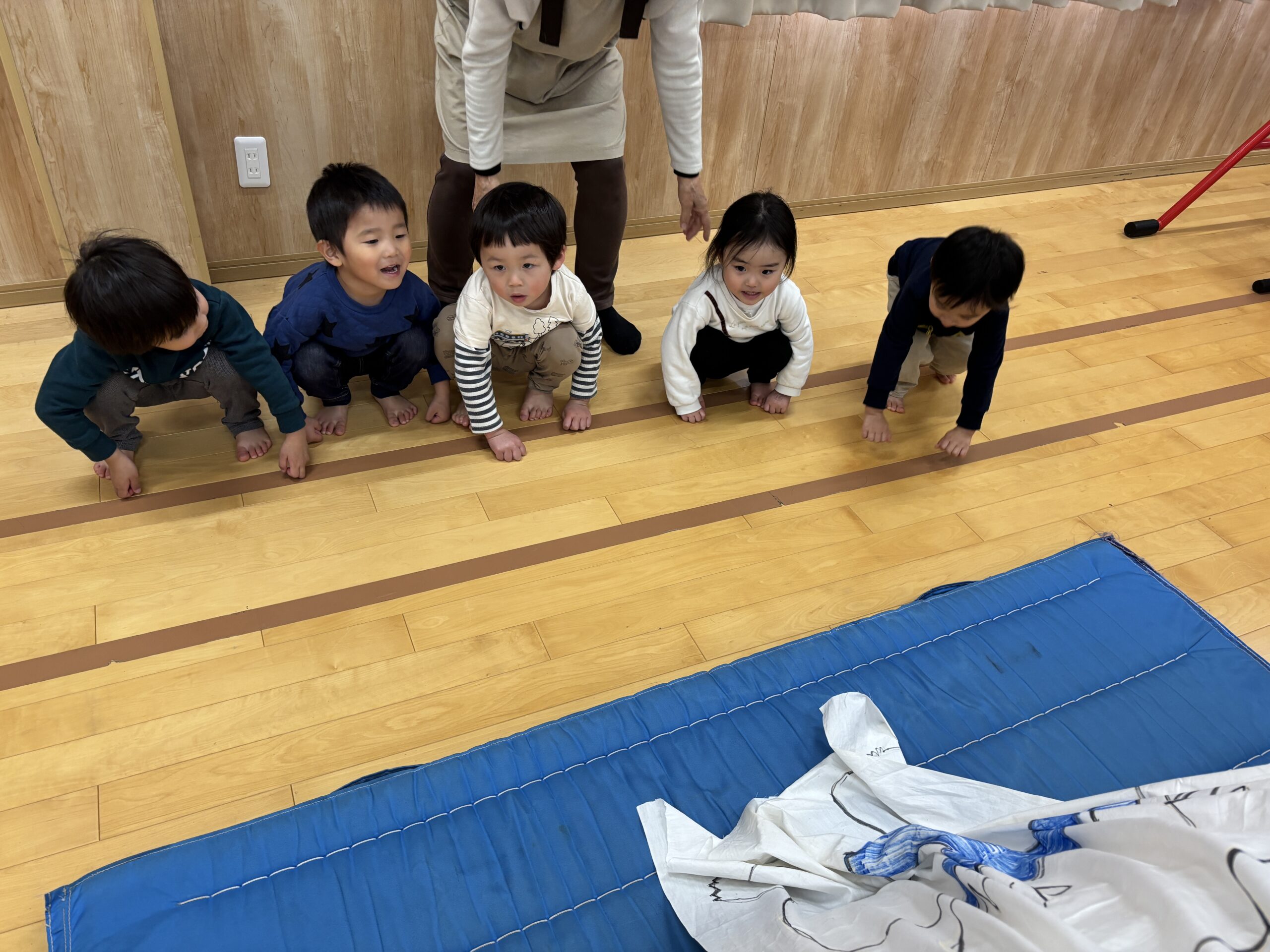 今日はみんなが力士になってぶつかり稽古をします!まずは『お相撲体操』でウオーミングアップ!高速どすこいがお気に入りで、みんな盛り上がります(^^♪