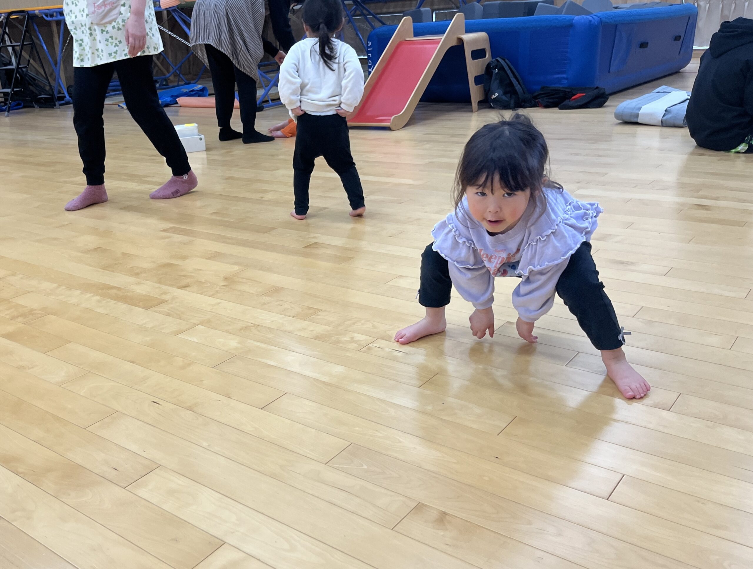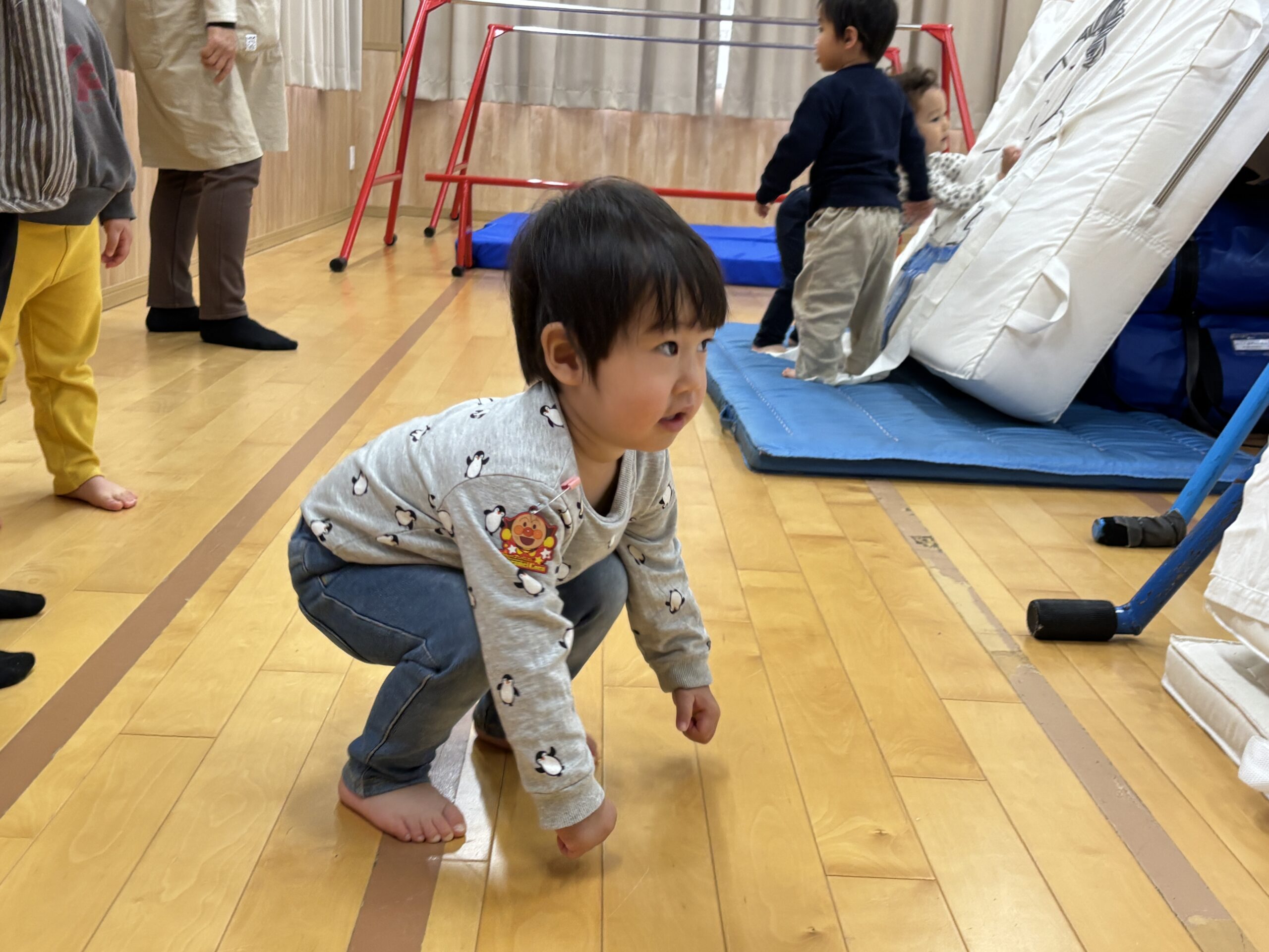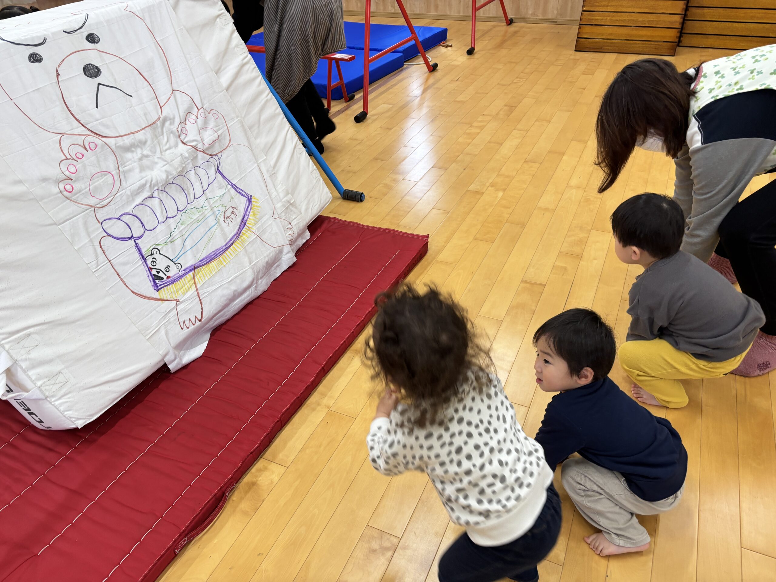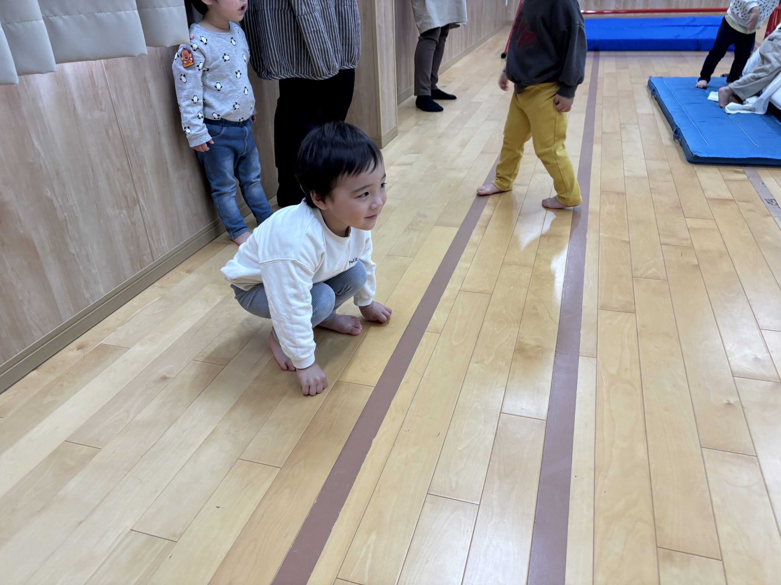 今日はみんなが力士になってぶつかり稽古をします!まずは『お相撲体操』でウオーミングアップ!高速どすこいがお気に入りで、みんな盛り上がります(^^♪
