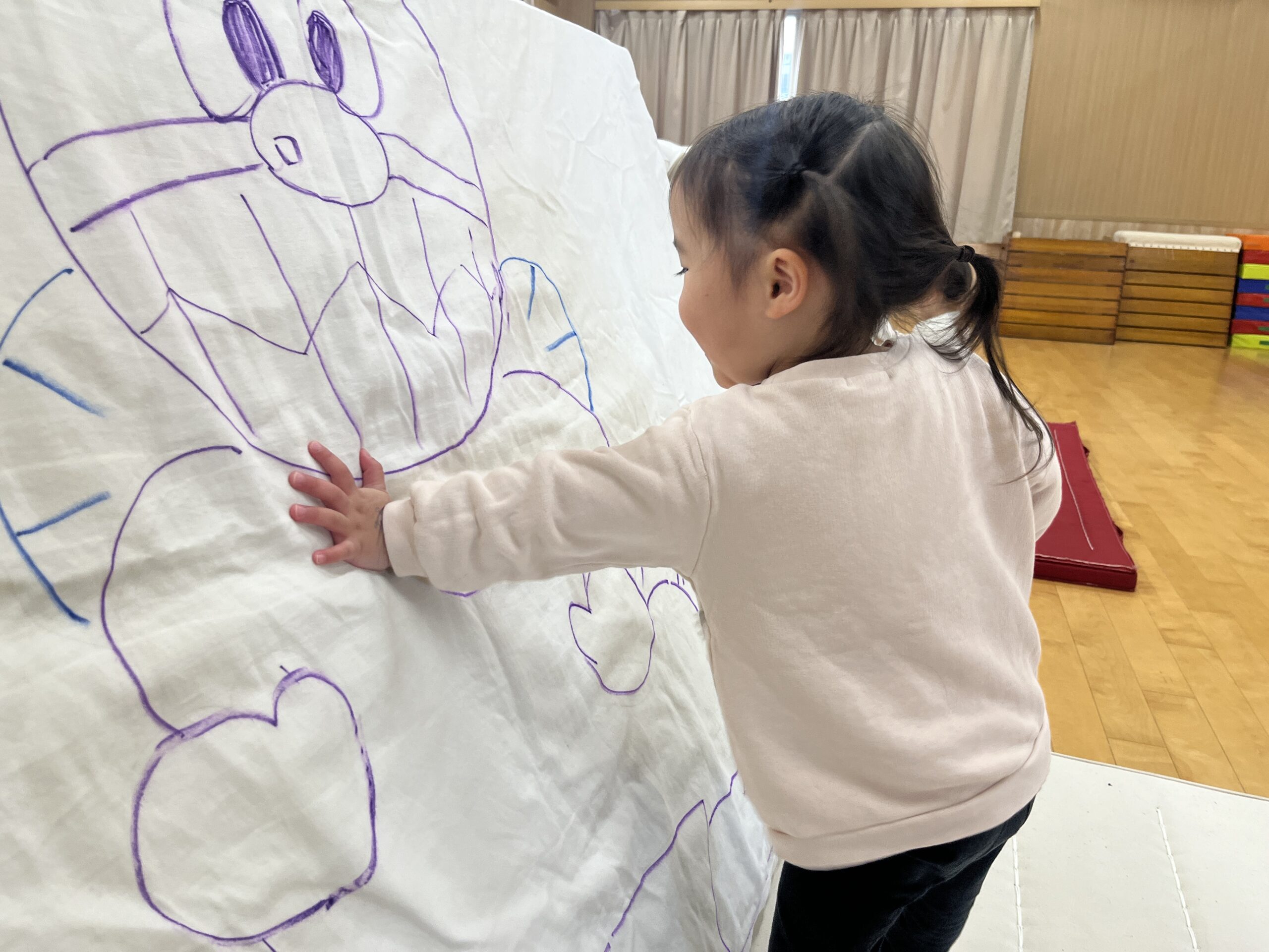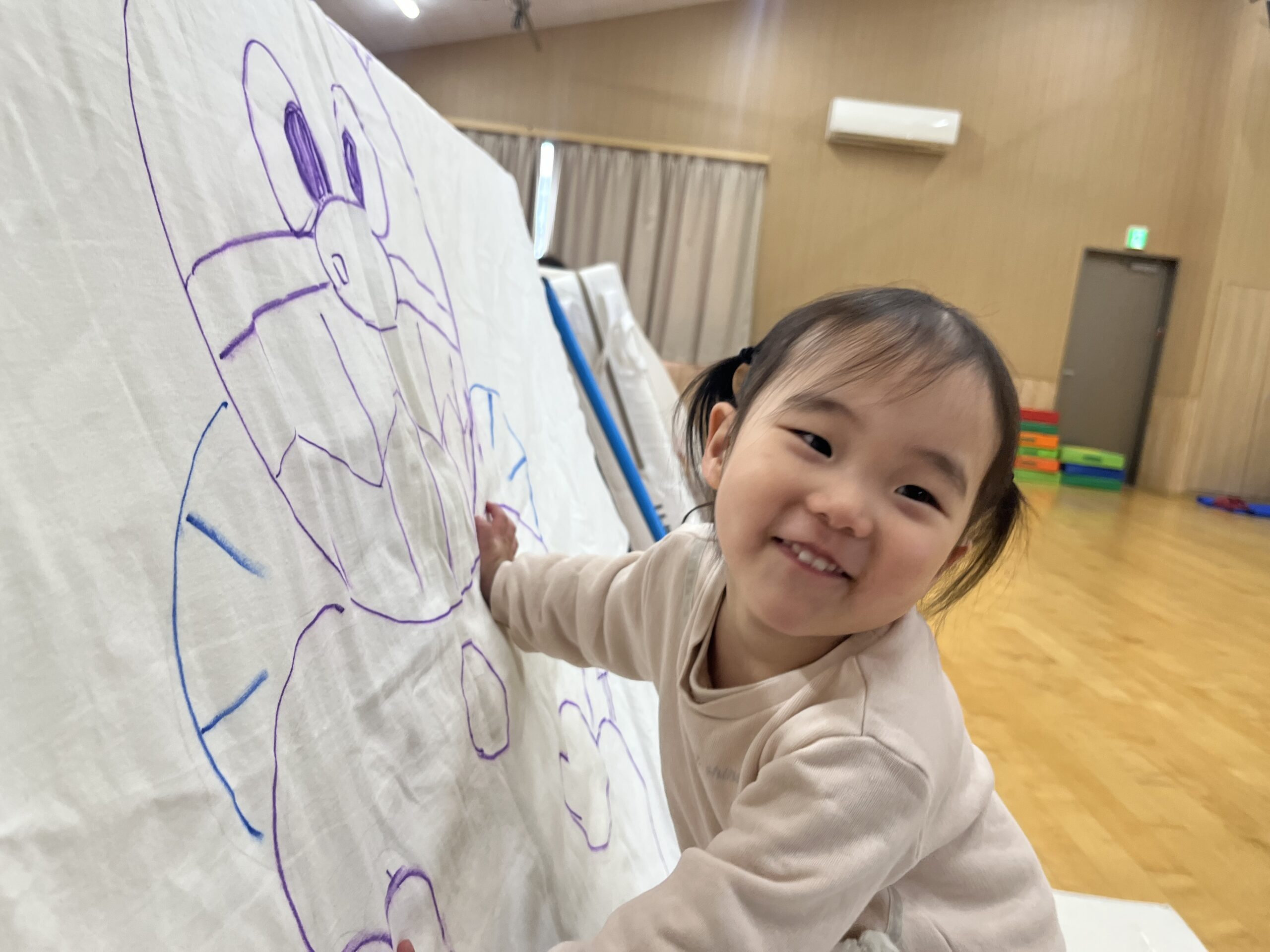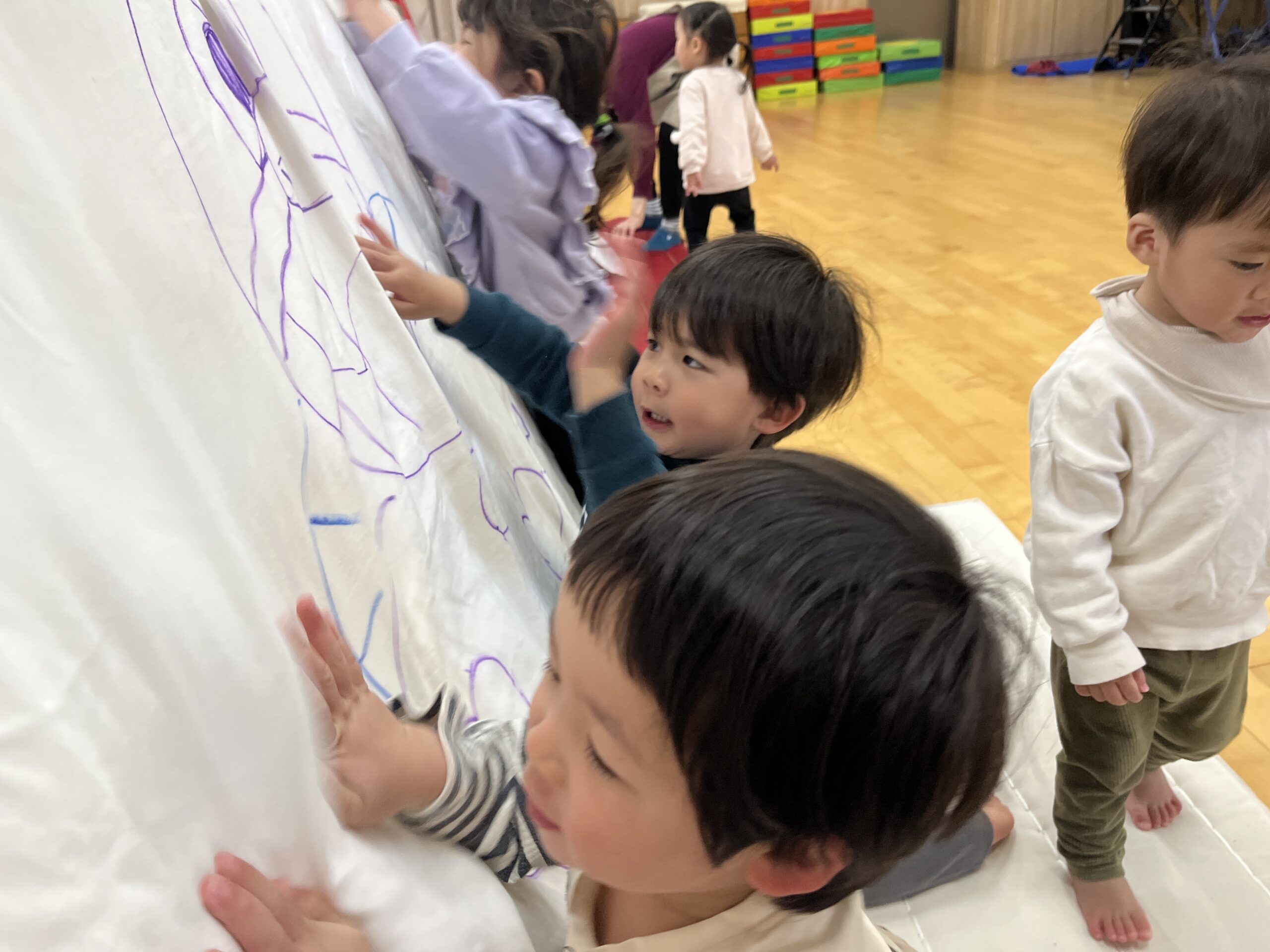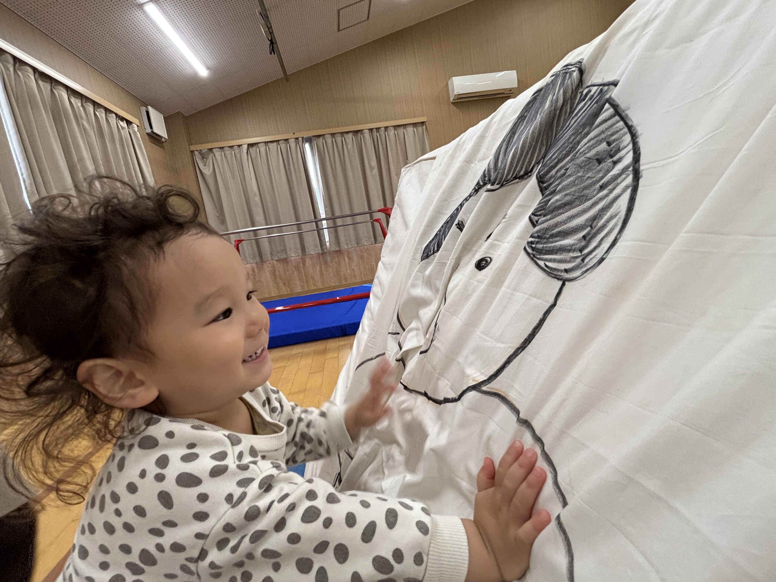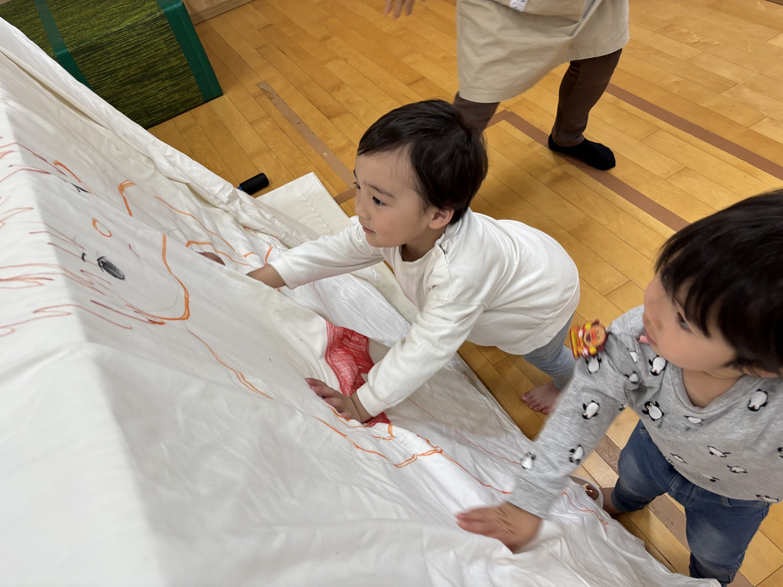 今日はみんなが力士になってぶつかり稽古をします!まずは『お相撲体操』でウオーミングアップ!高速どすこいがお気に入りで、みんな盛り上がります(^^♪