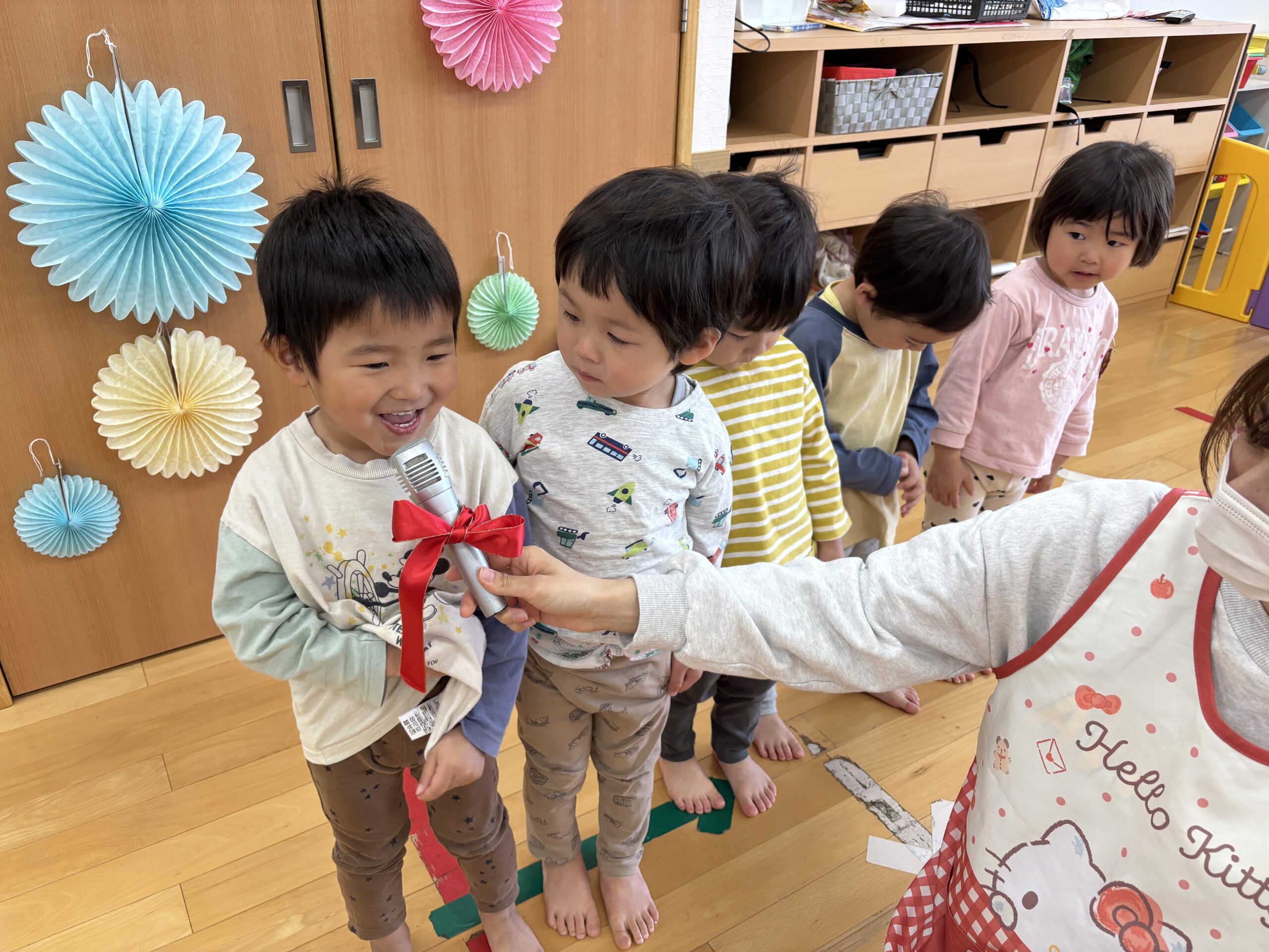 続いてお別れ会です。今日でお別れするお友達にインタビュー🎤ちょっとドキドキするけど一生懸命に答えてくれました😊