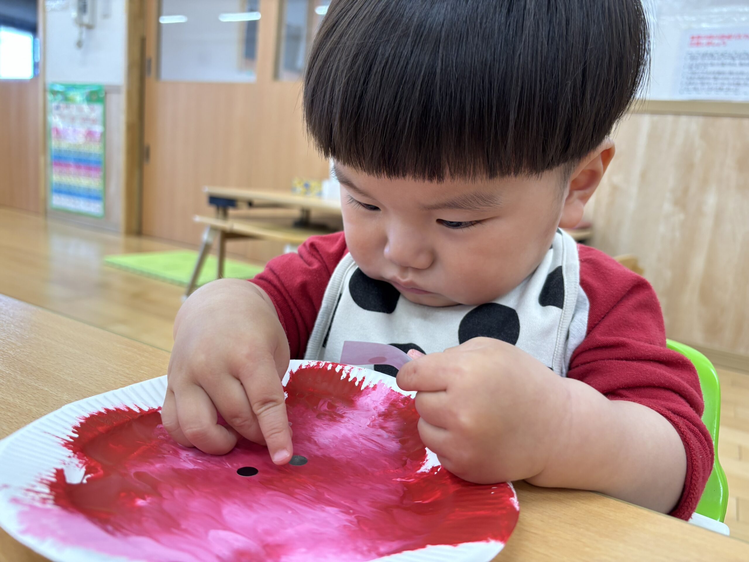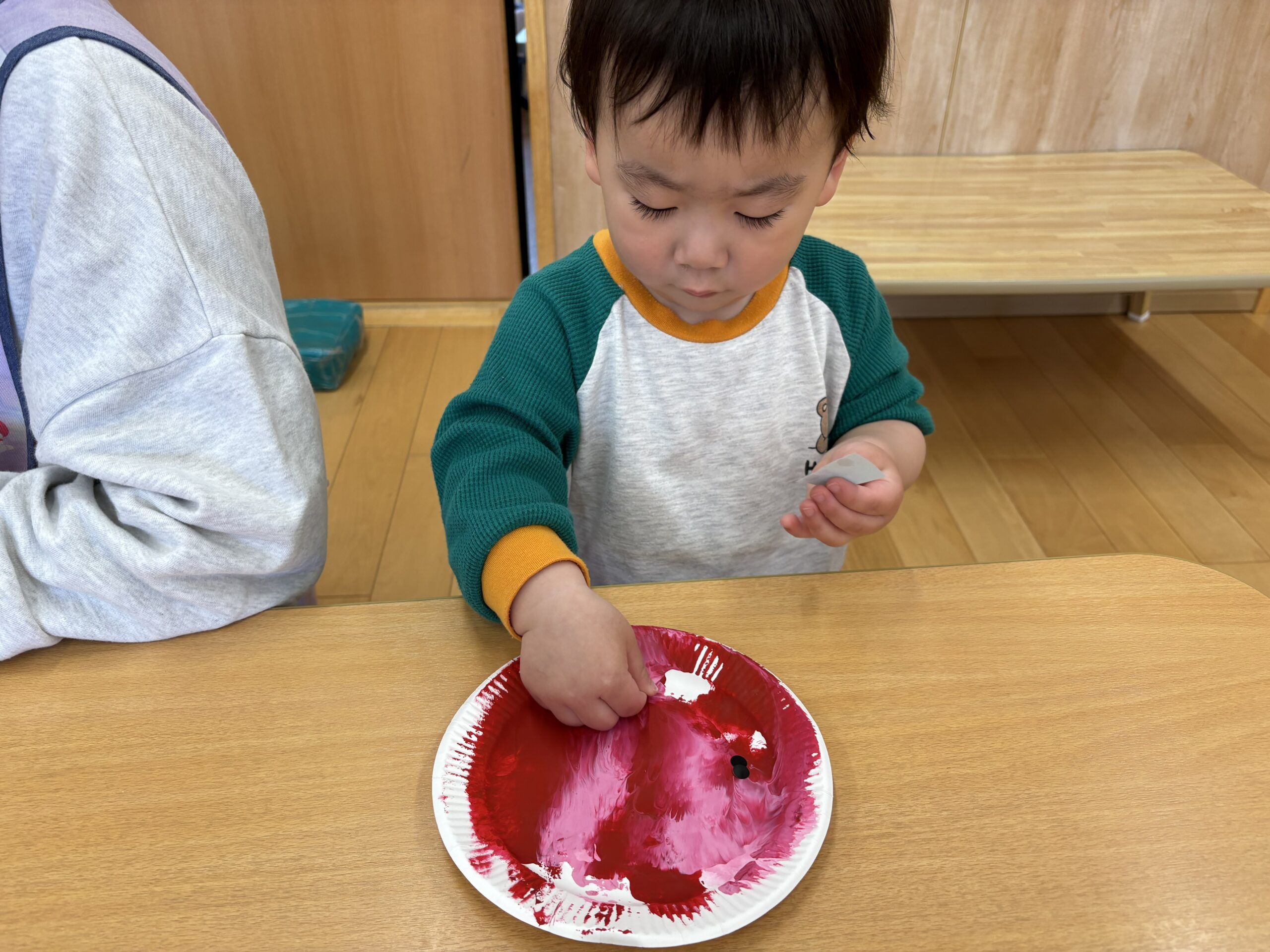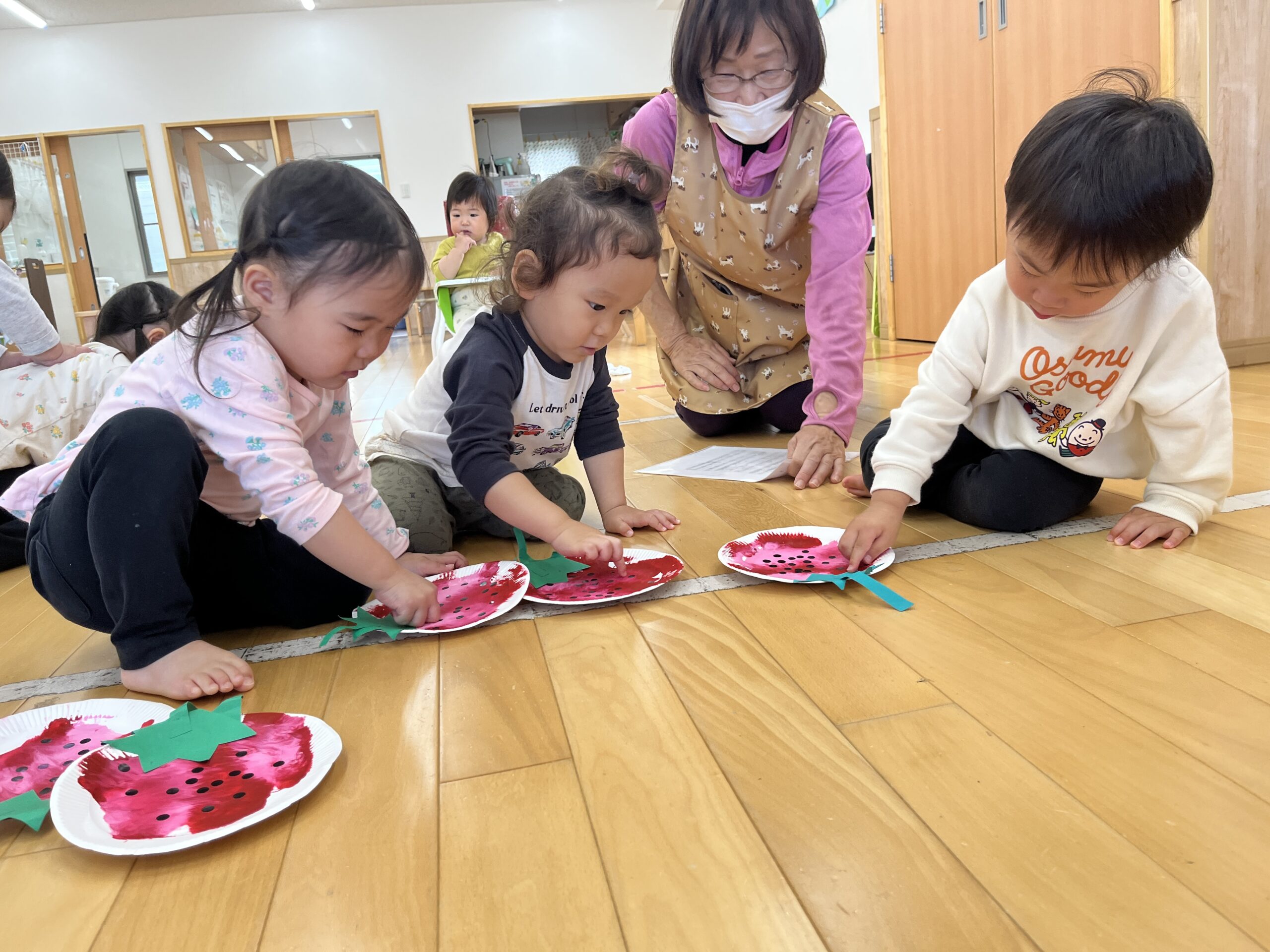 イチゴの実は、まだまだ小さくて青いね。赤く大きくな~れ! 子ども達といちご🍓の製作をしました。紙皿の上に絵の具を垂らしてラップを被せた上から、手で押して絵の具を広げていきます。