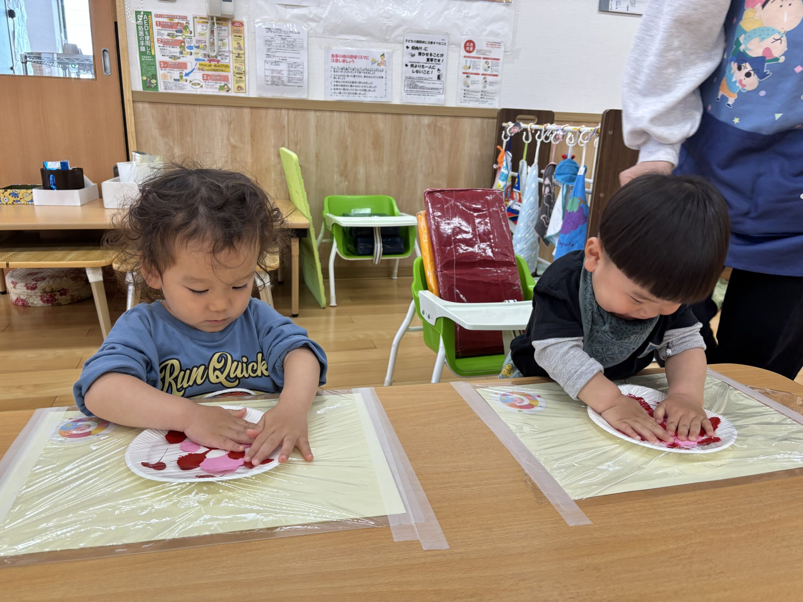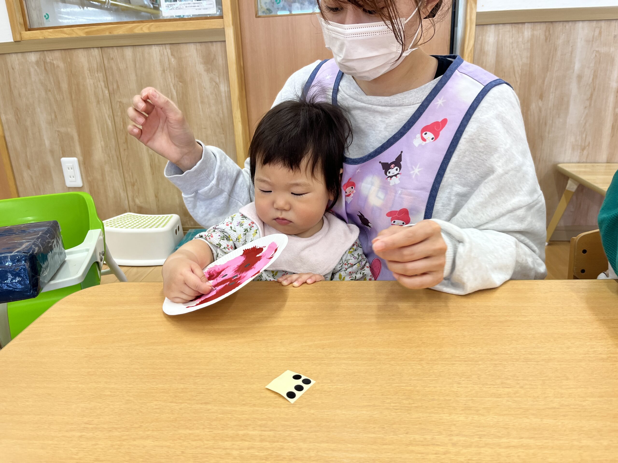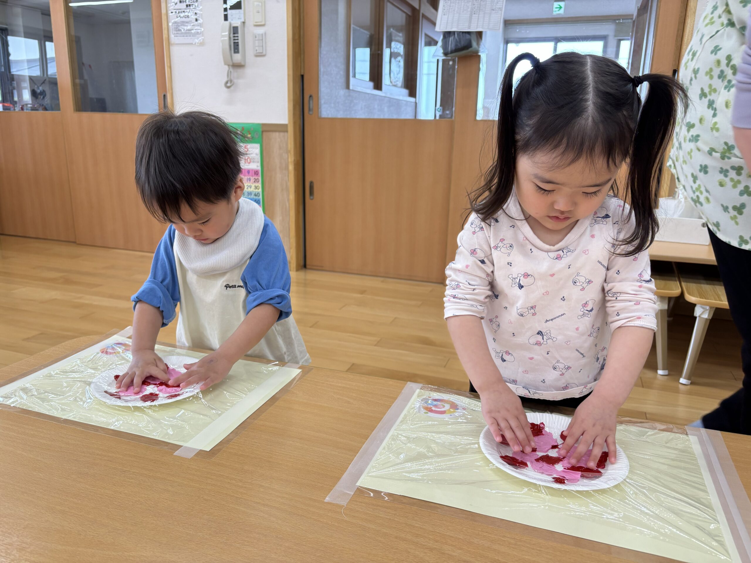 イチゴの実は、まだまだ小さくて青いね。赤く大きくな~れ! 子ども達といちご🍓の製作をしました。紙皿の上に絵の具を垂らしてラップを被せた上から、手で押して絵の具を広げていきます。
