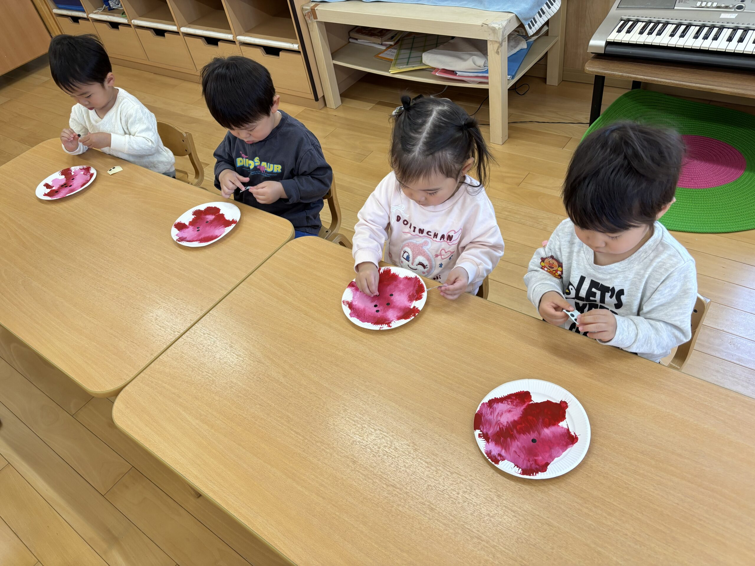 その後は、小さな黒シールを貼って苺の種にしました。子ども達の小さな手で、小さなシールを取って貼っていくのは難しいです。