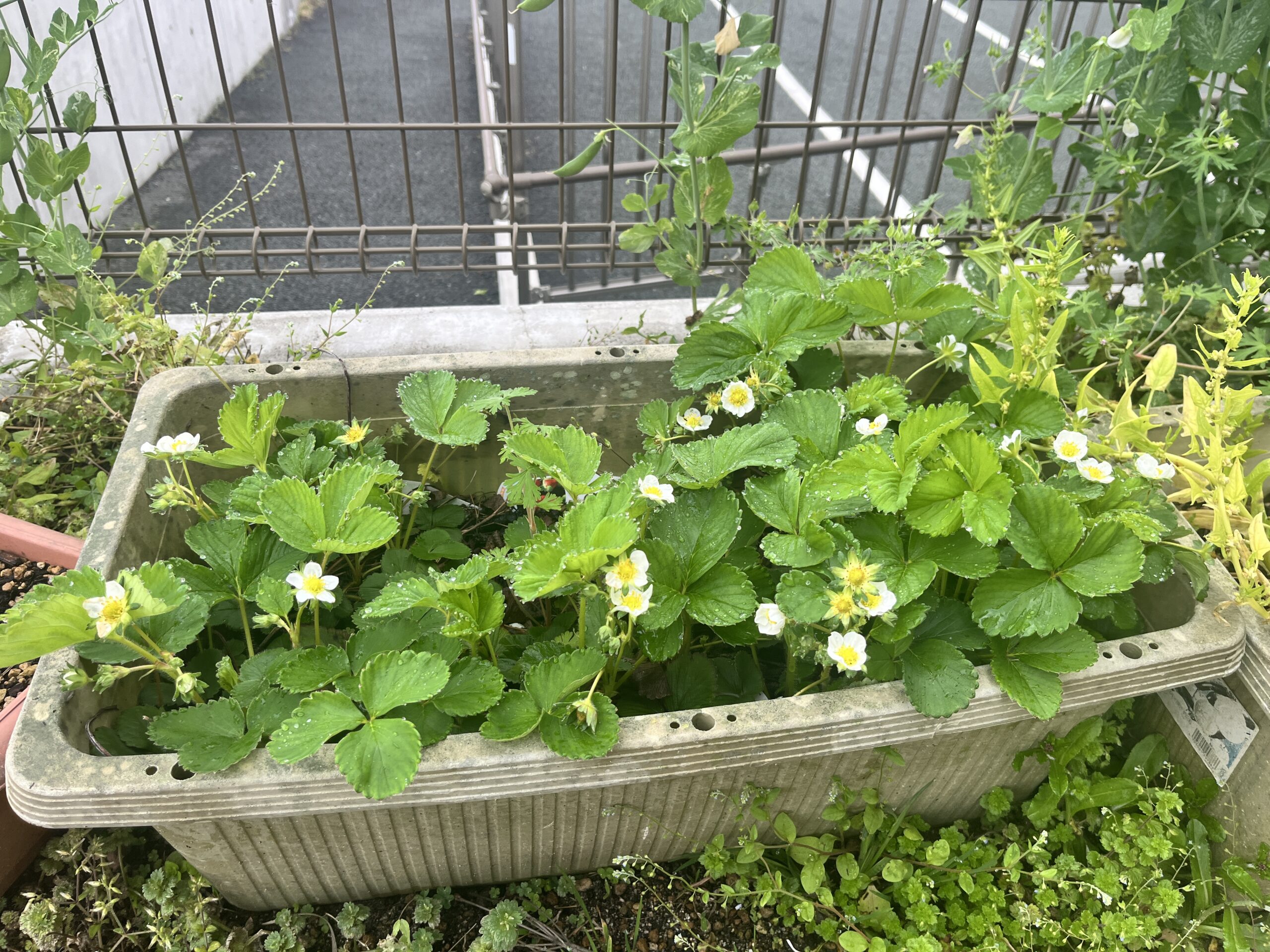 保育園の苺に白い花がいっぱい咲きました❀