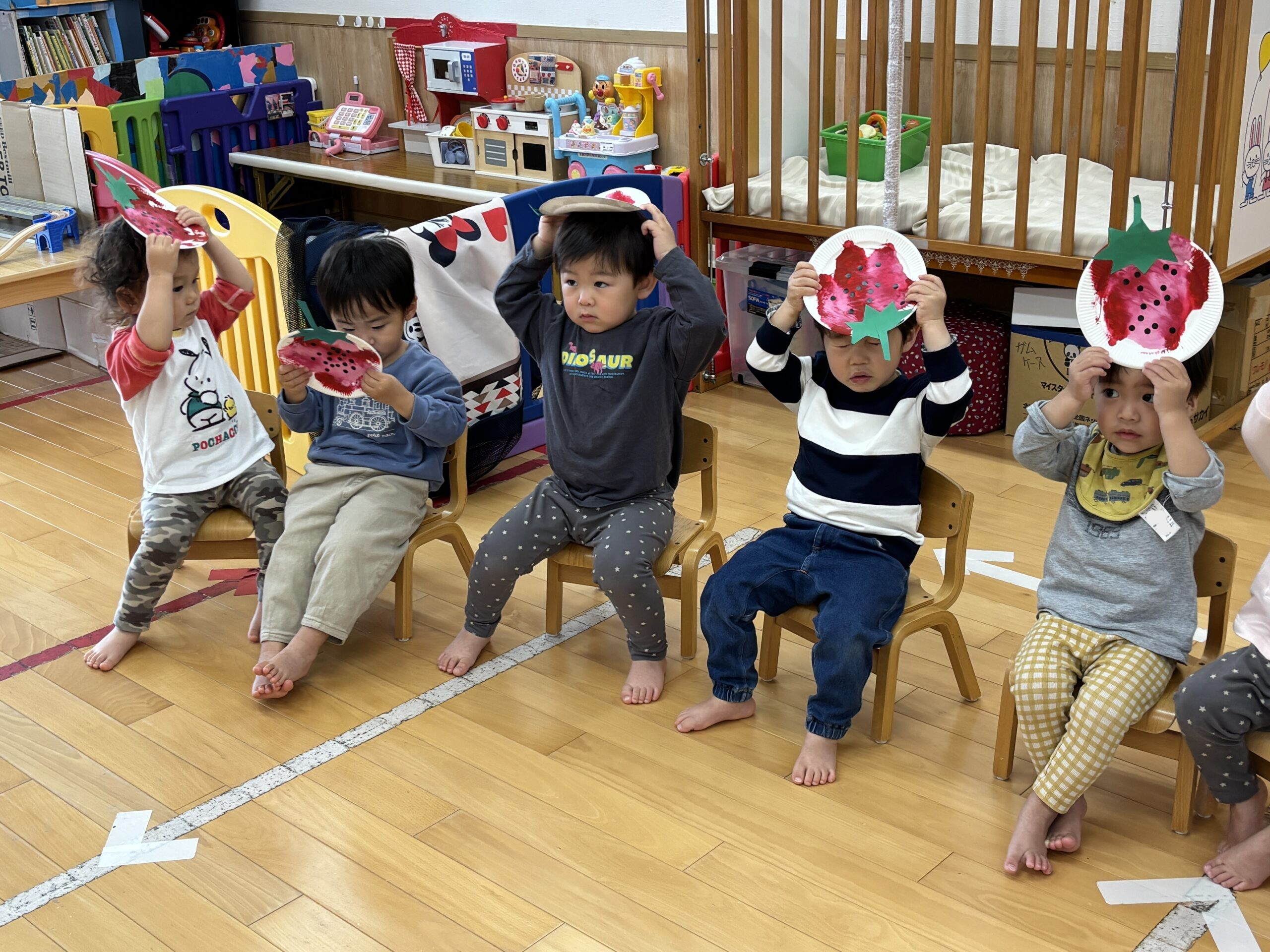 朝のお集まりの時に、いちごの歌を歌いながらツンツン触ったり、くるくる回したりして遊んでいます🎵