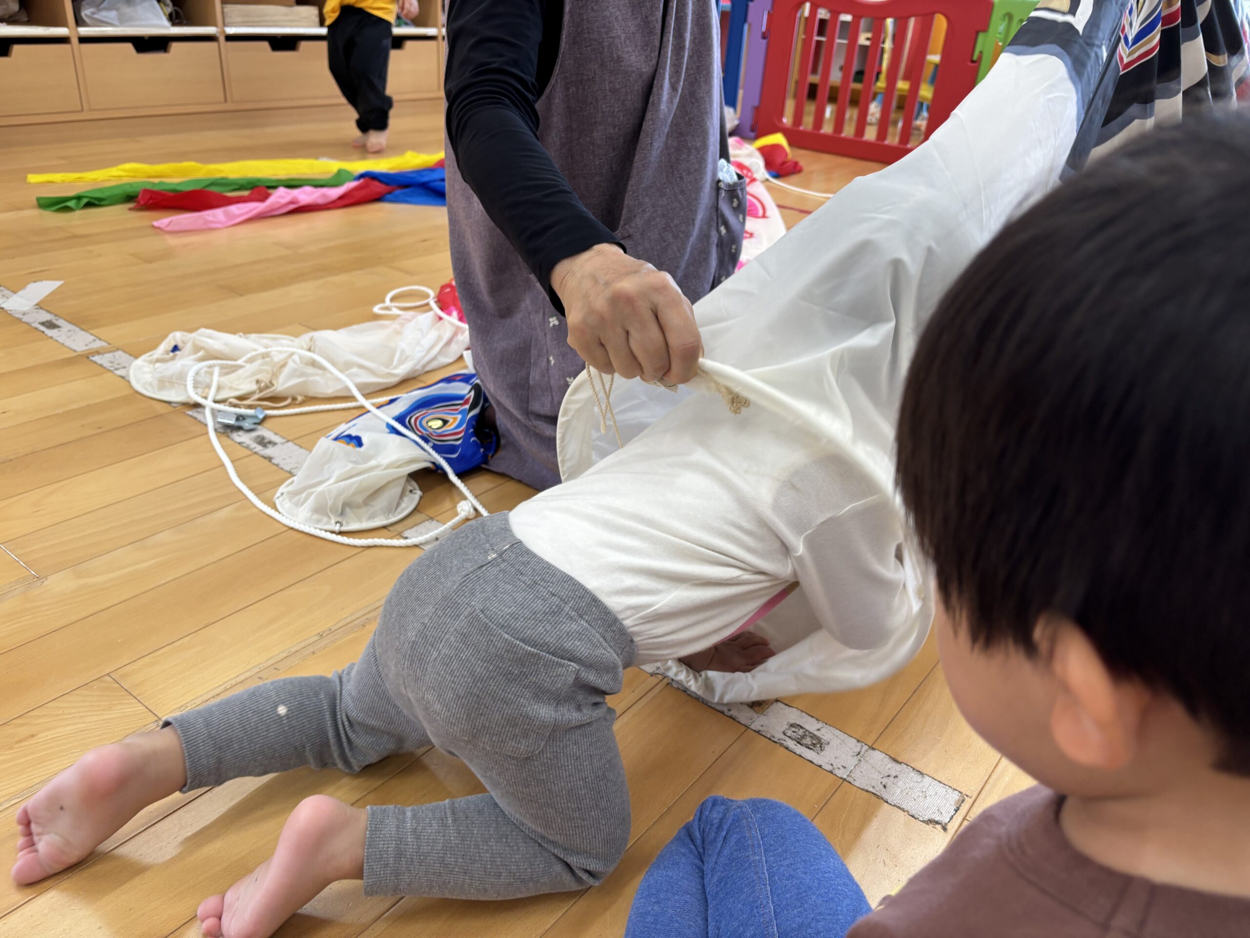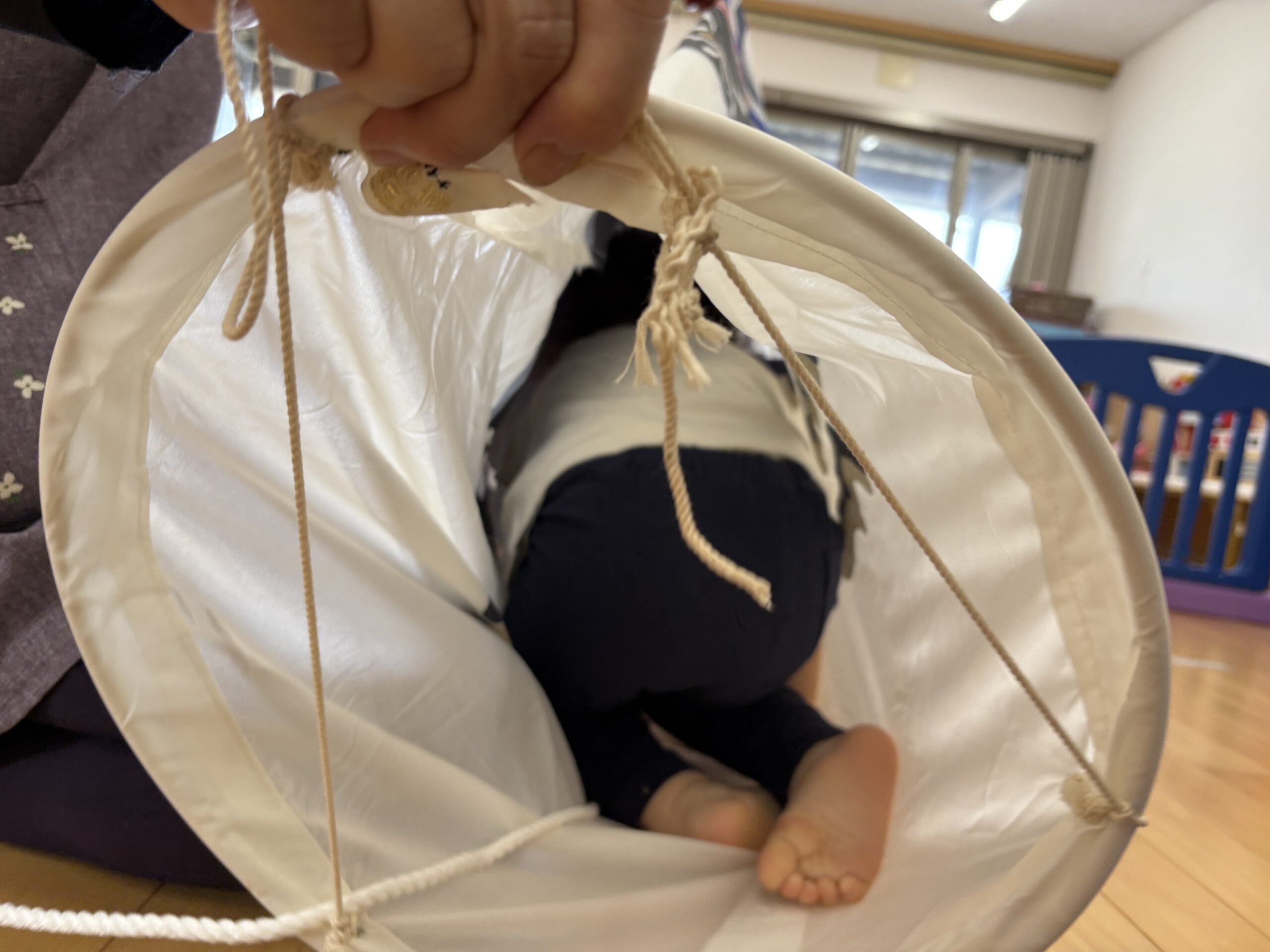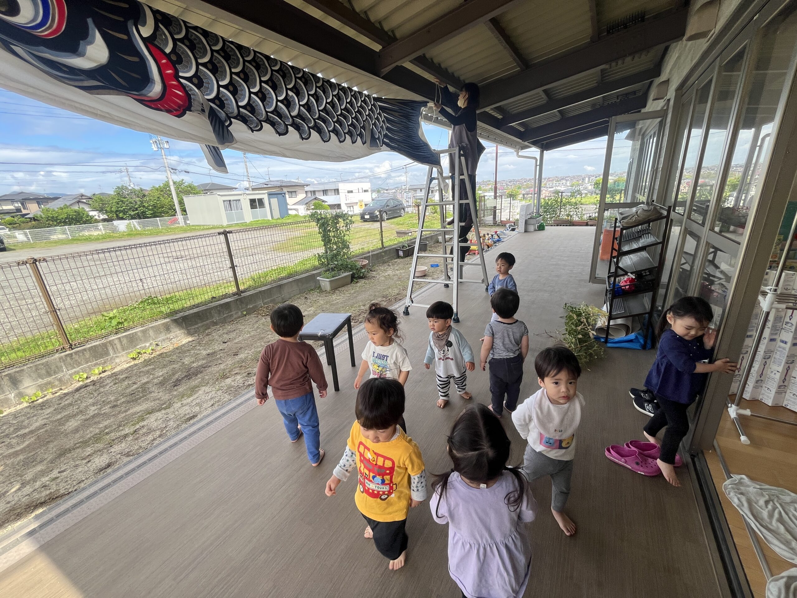 5月5日は〝こどもの日〟ですね😊鯉のぼりを保育園にあげる前に、中に入って遊んじゃいました🎏
