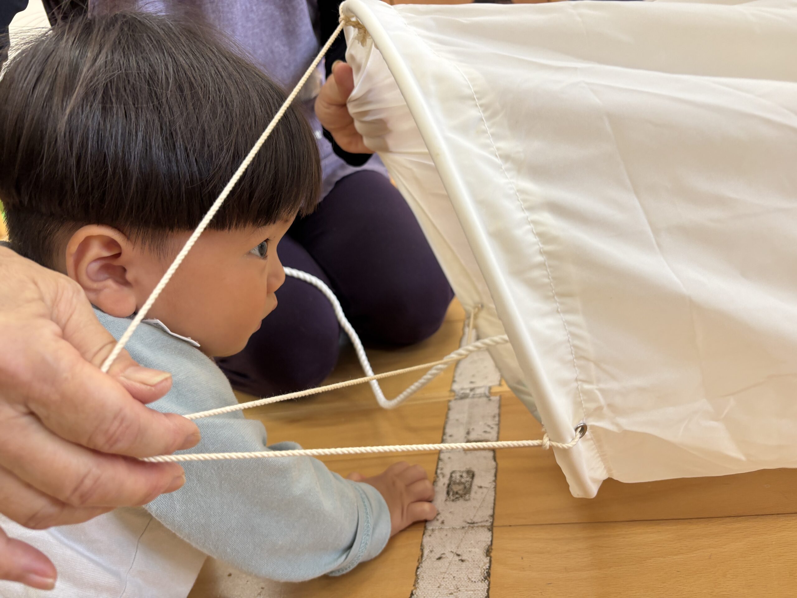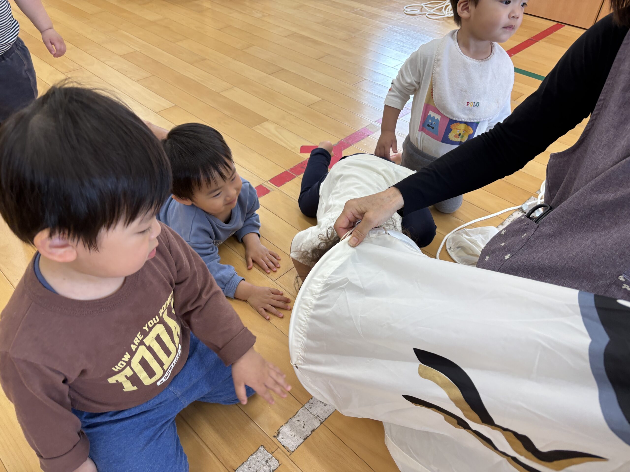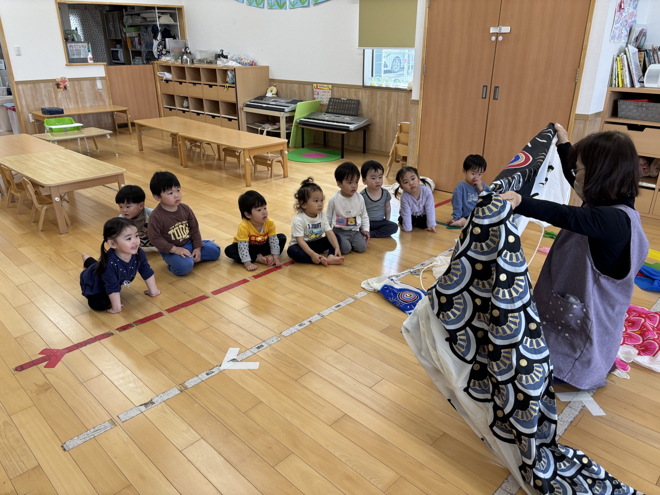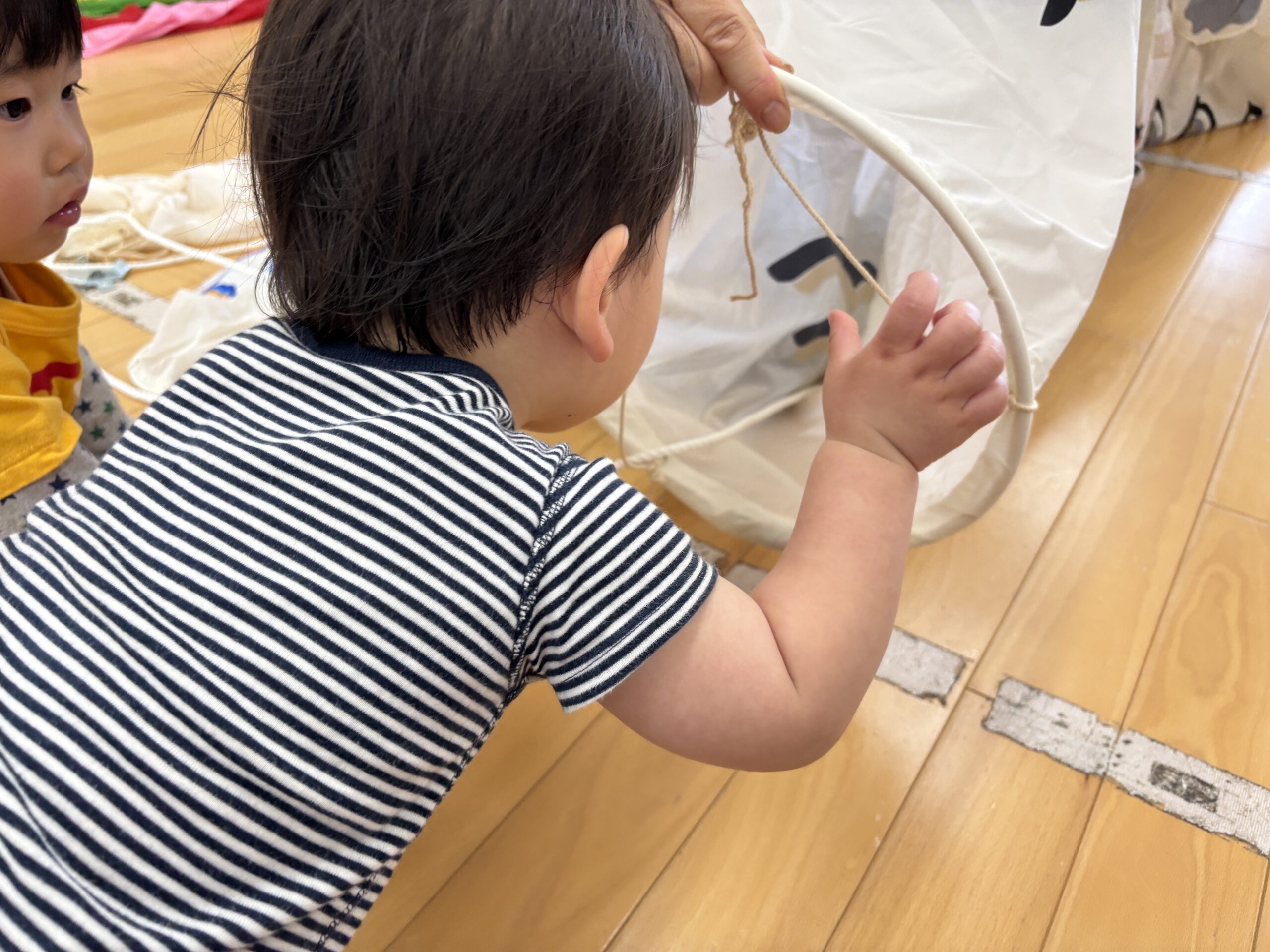 5月5日は〝こどもの日〟ですね😊鯉のぼりを保育園にあげる前に、中に入って遊んじゃいました🎏