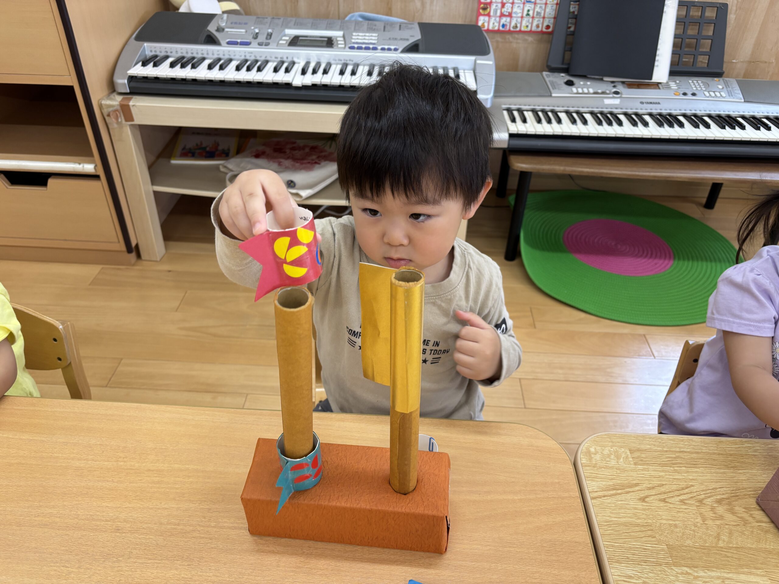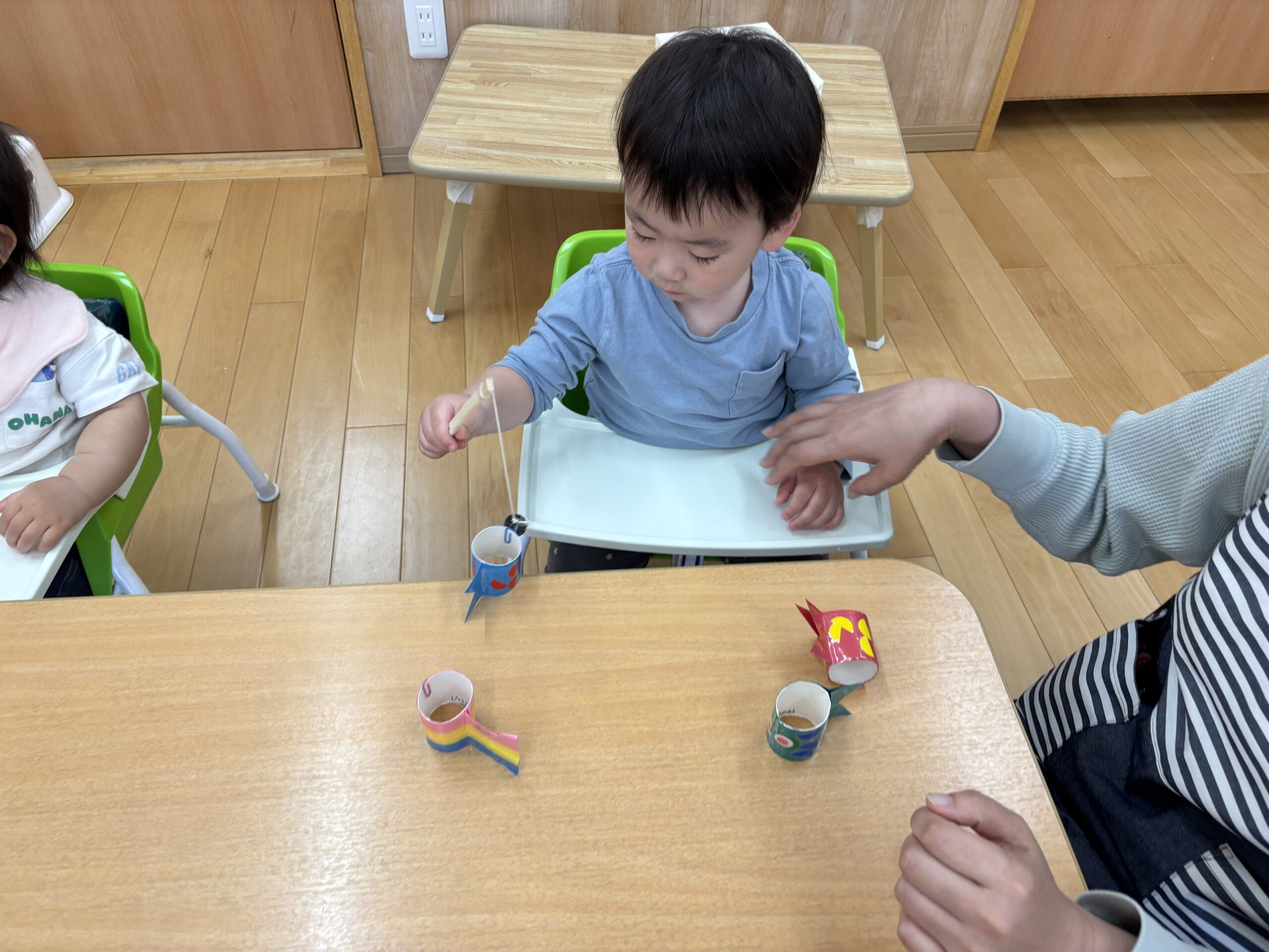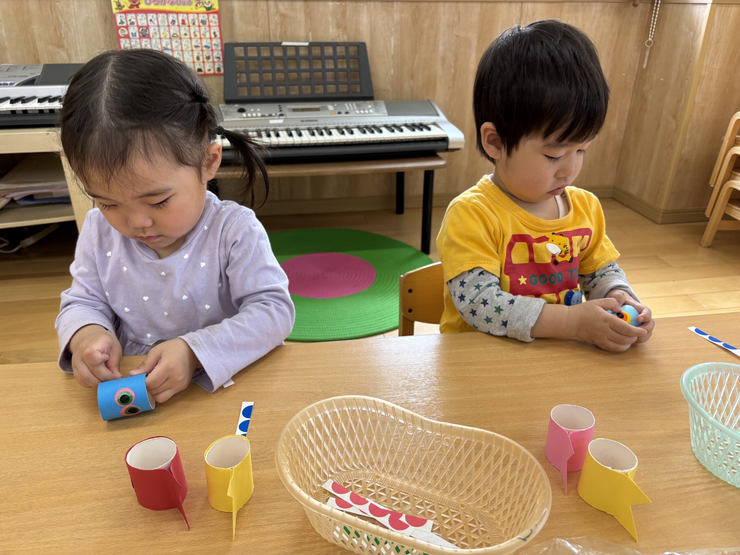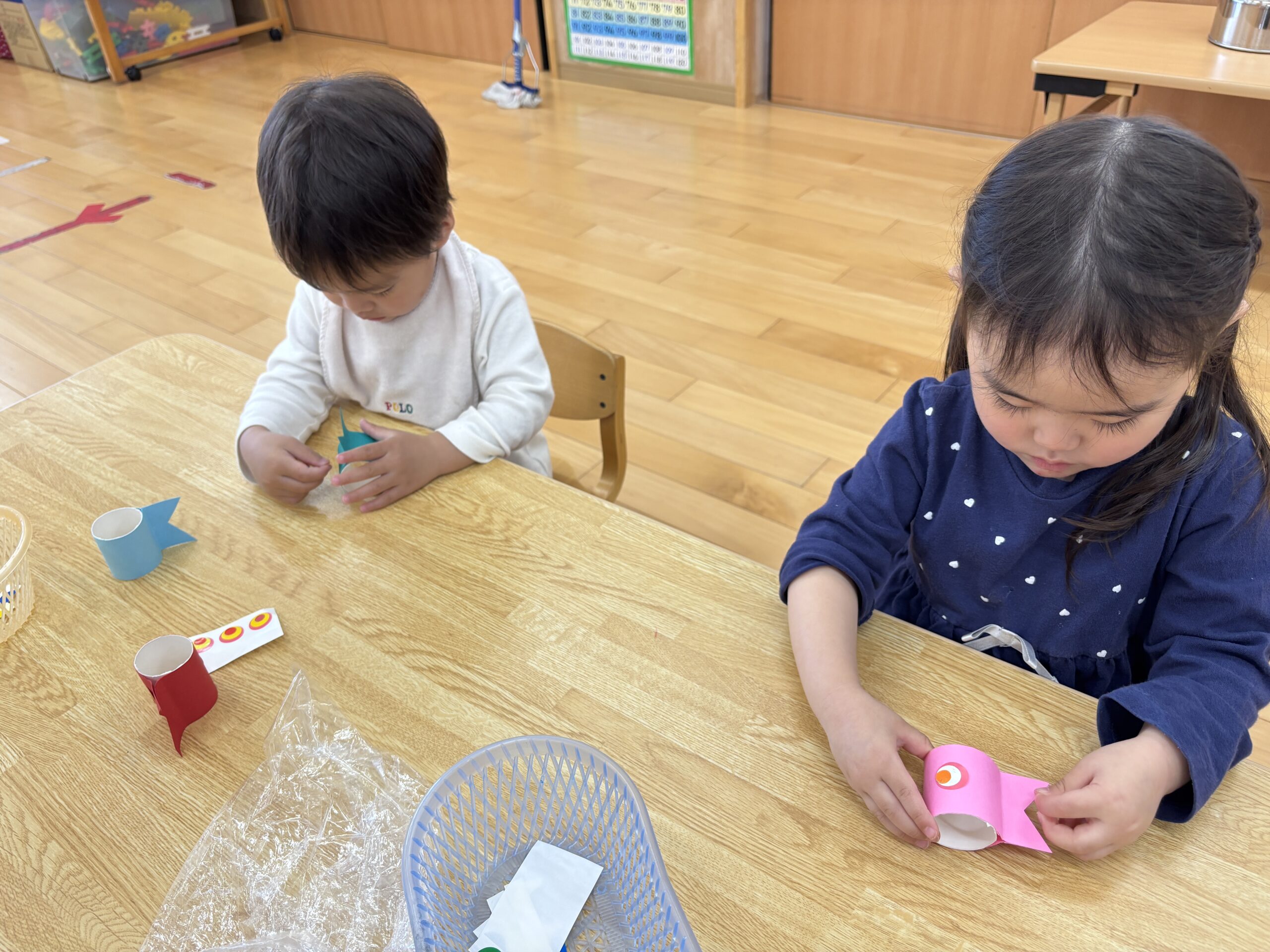 次にロール芯を使って鯉のぼりを作りました。作り方の説明をよく聞いています👂