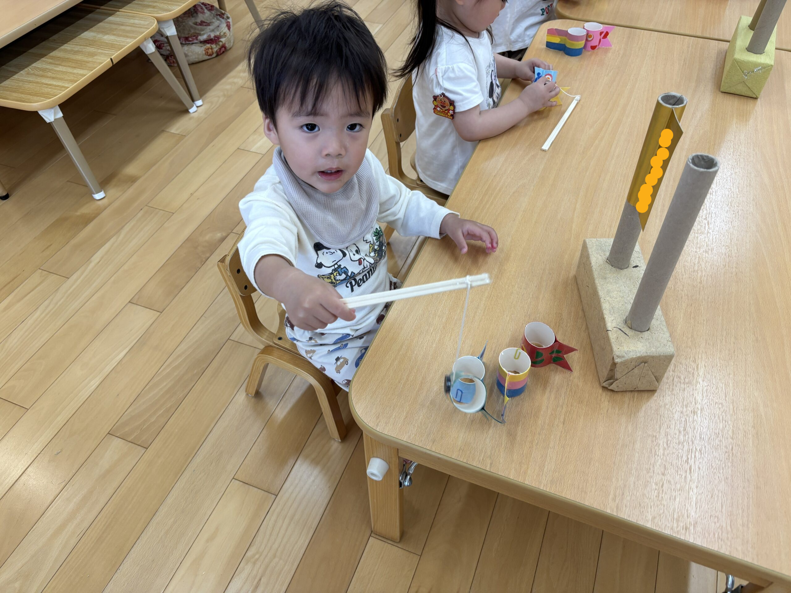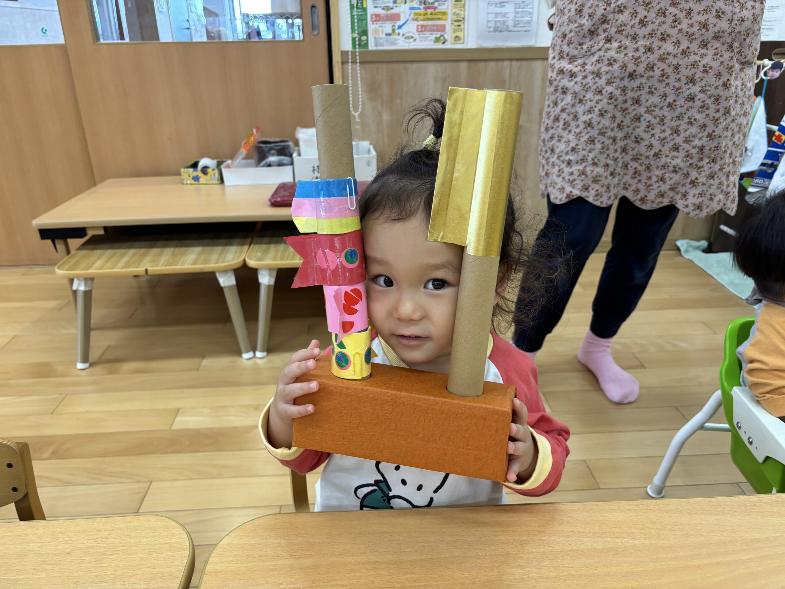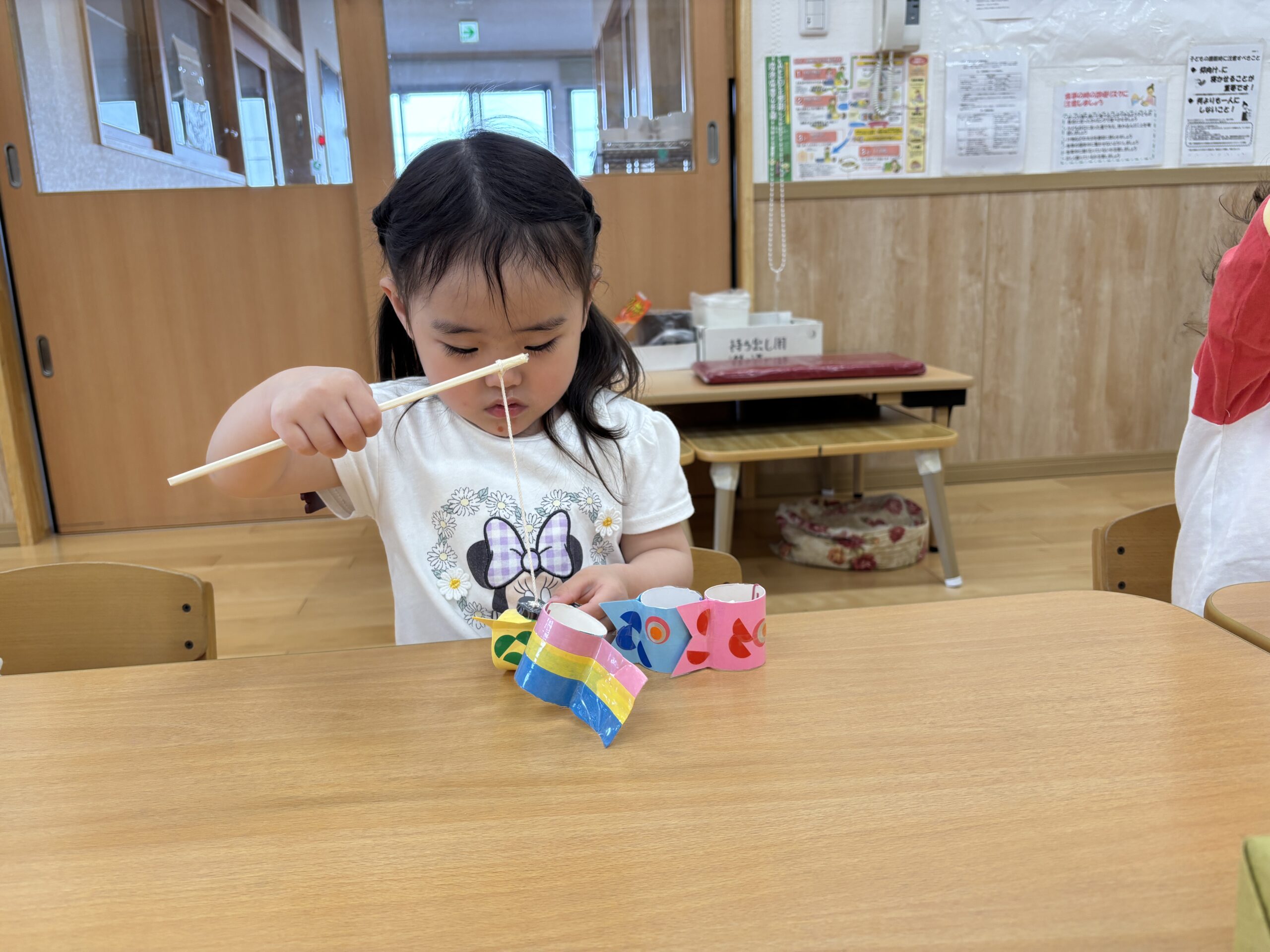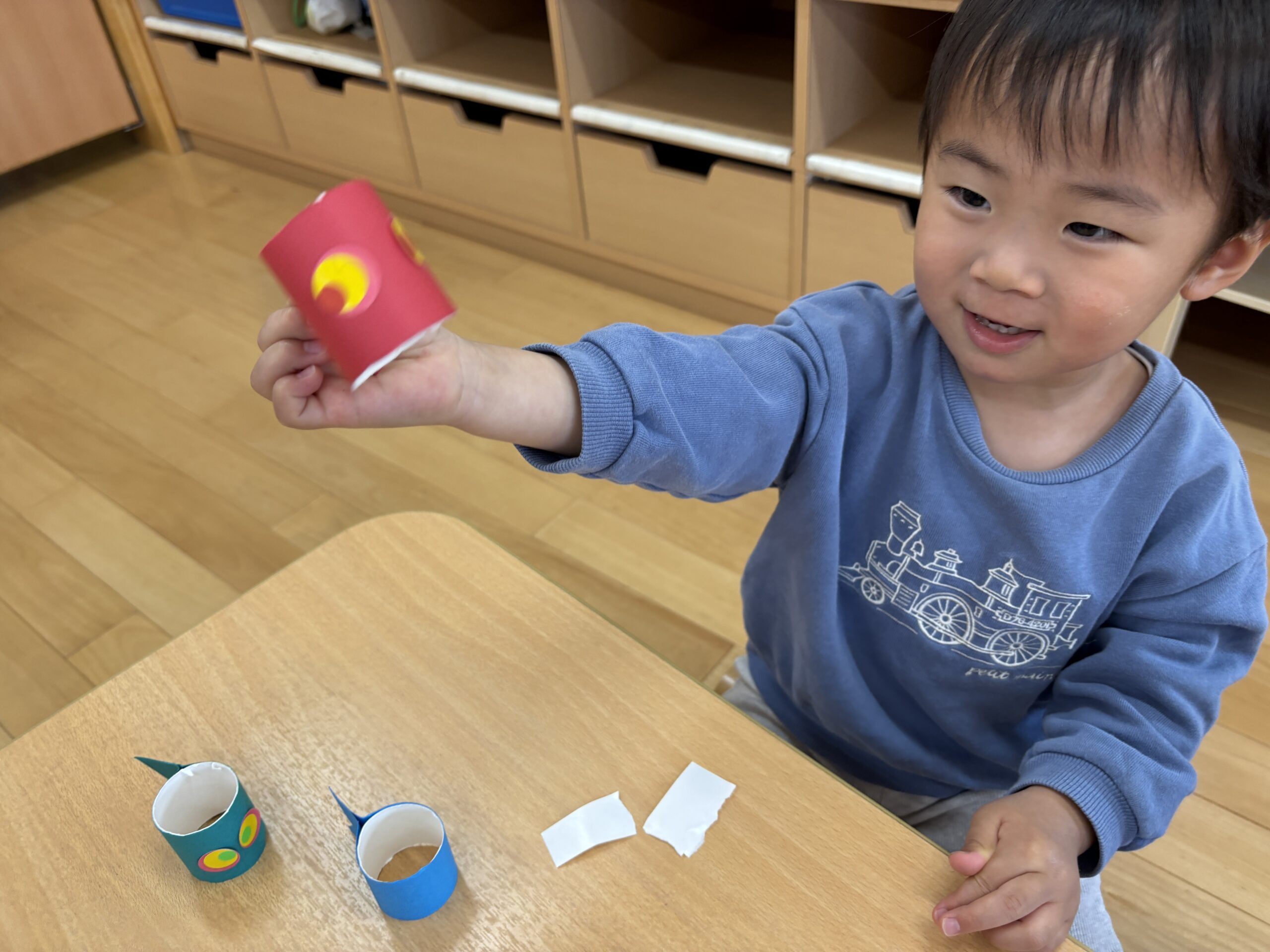 次にロール芯を使って鯉のぼりを作りました。作り方の説明をよく聞いています👂