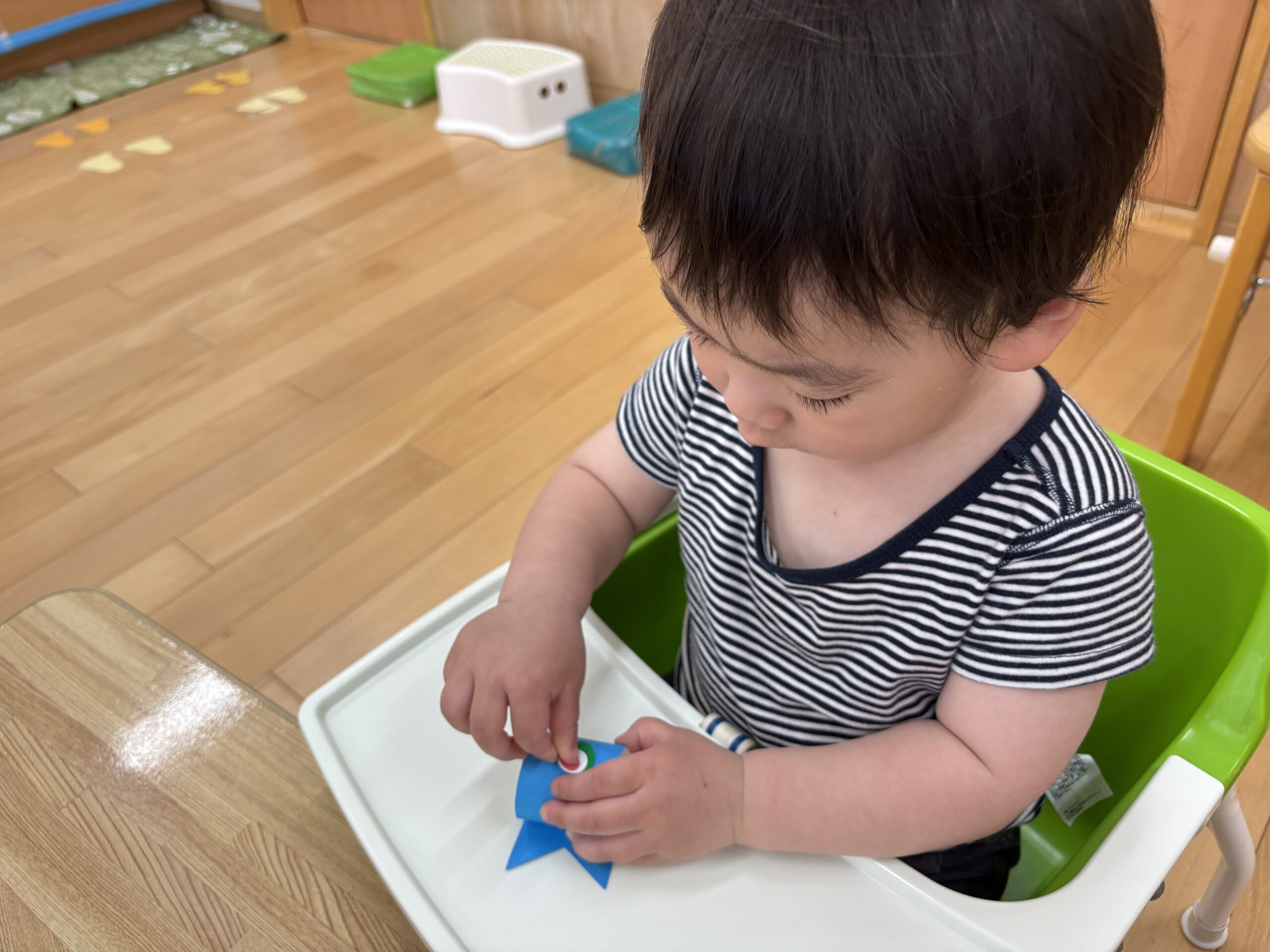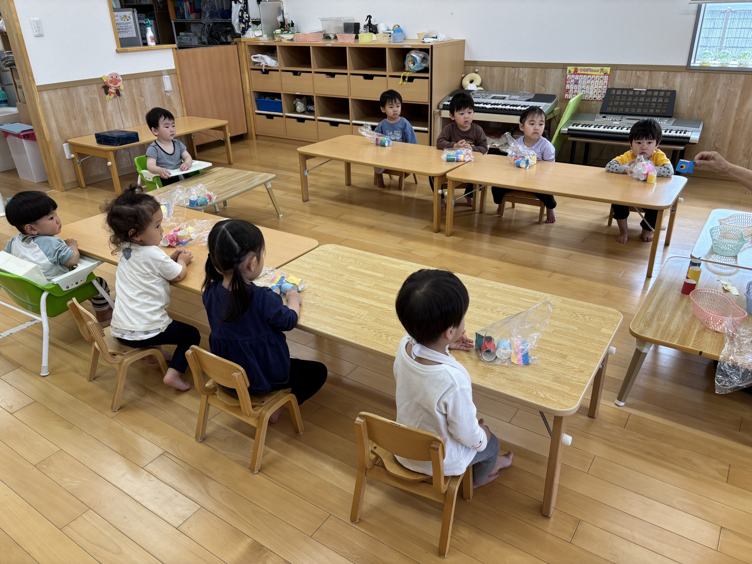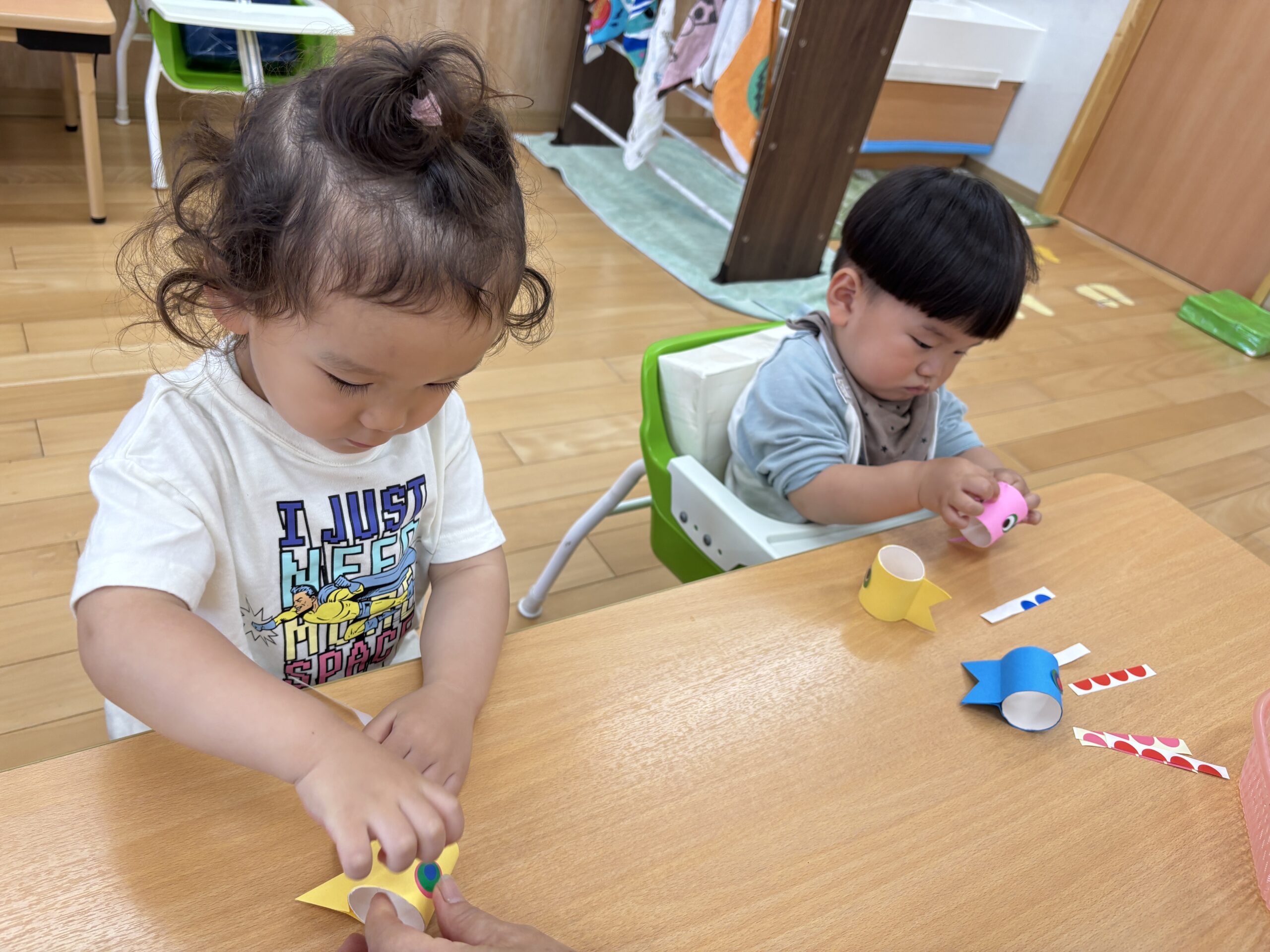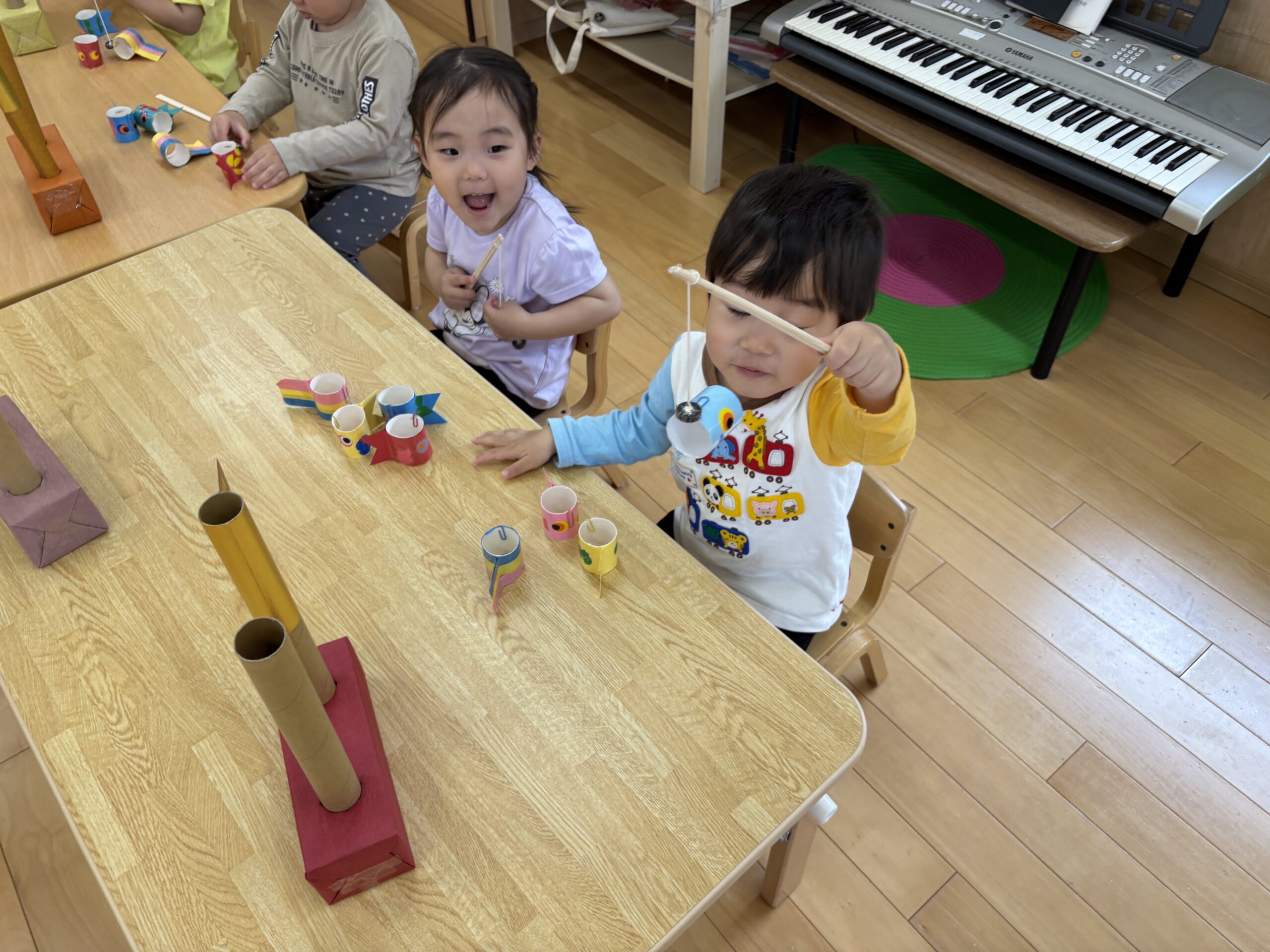 次にロール芯を使って鯉のぼりを作りました。作り方の説明をよく聞いています👂